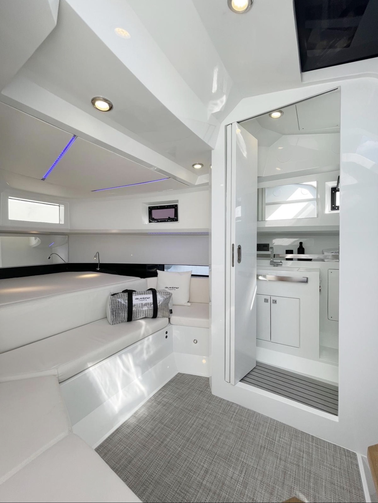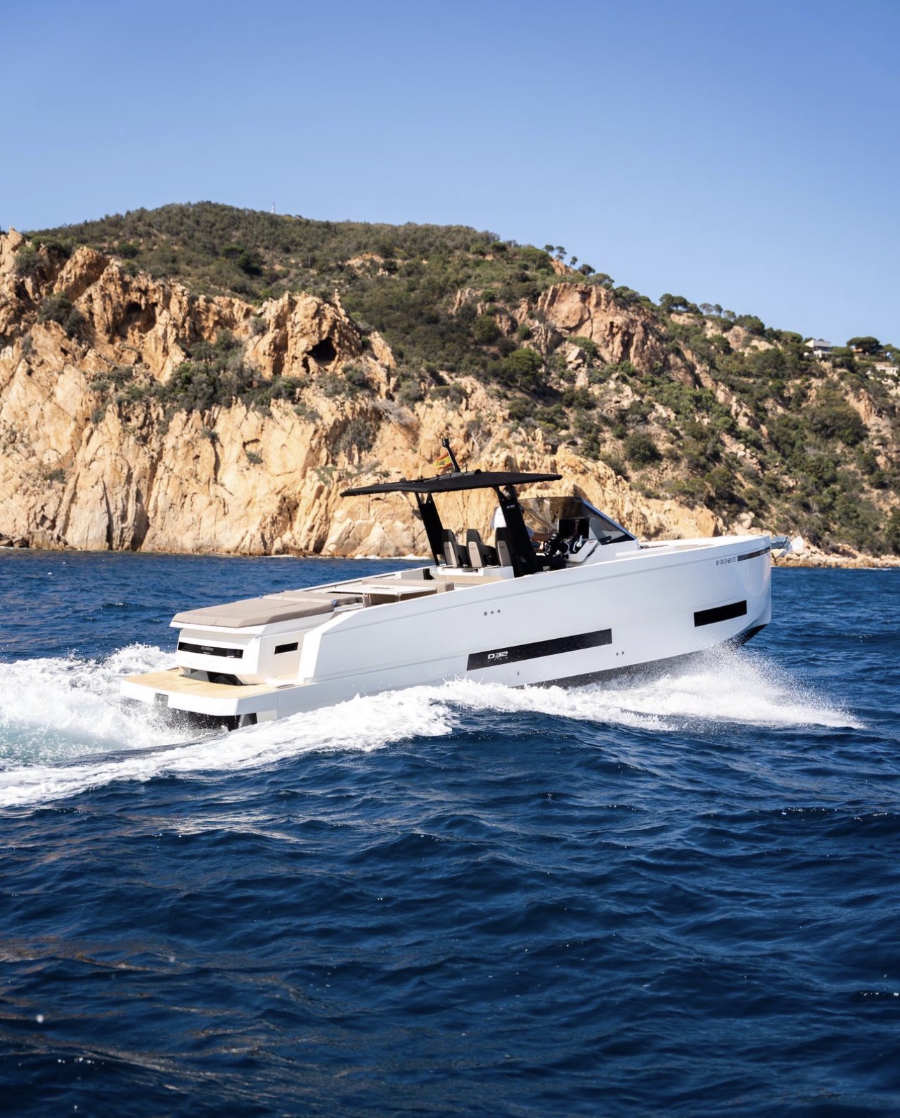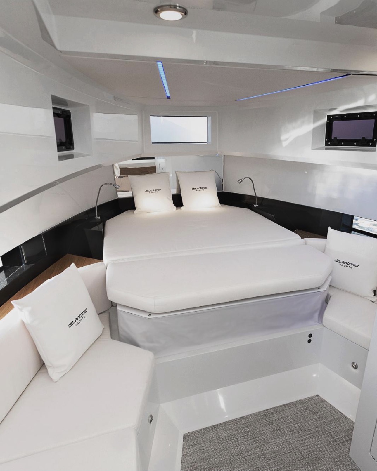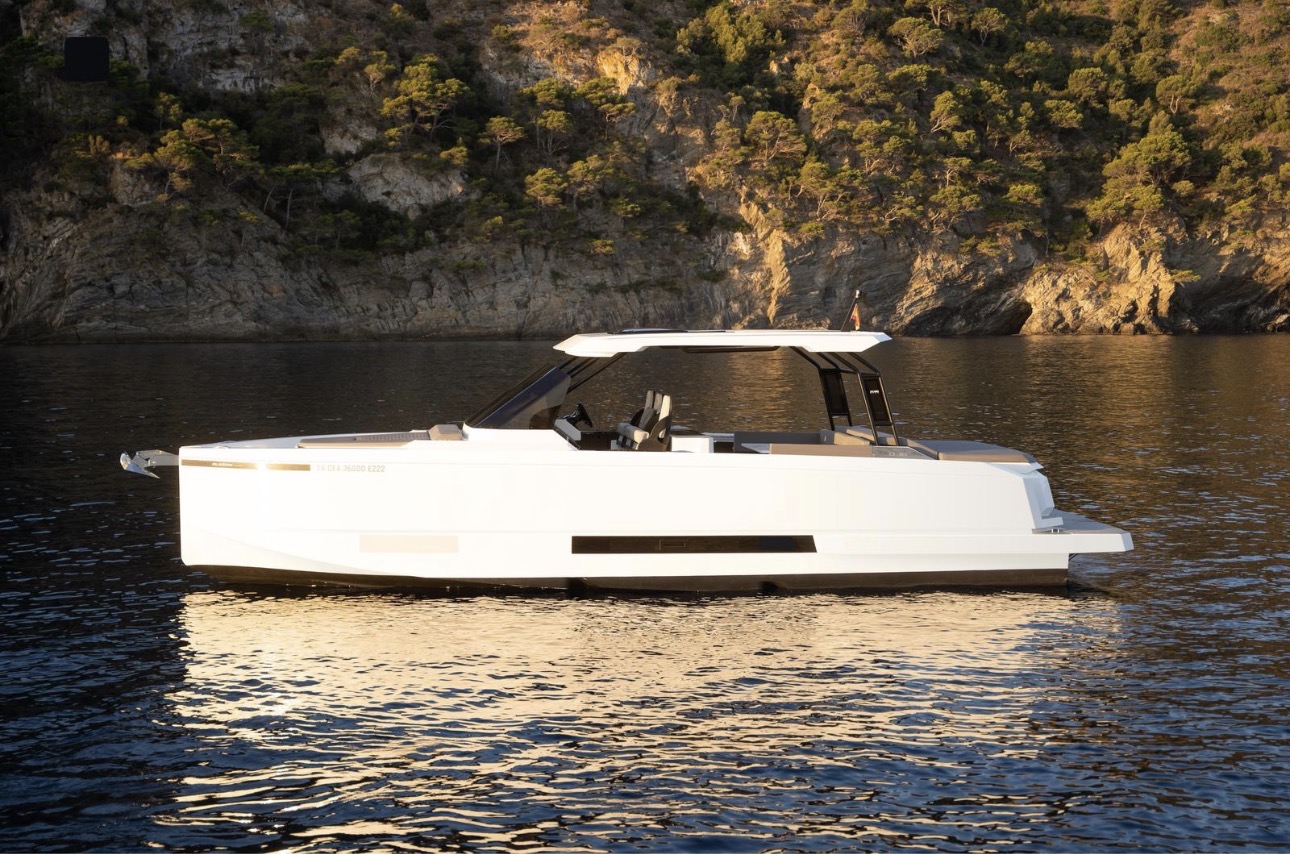 The De Antonio Yachts D32 is a high-end sport cruiser that redefines what a 10-metre motor yacht can be. With its sleek hull lines and premium fit-out, the D32 delivers exhilarating performance alongside refined comfort. Powered by twin 300 hp Mercury Verado V-8 engines for a total of 600 hp, it offers strong acceleration and a broad performance range. Cruising around 30 knots with potential top speeds exceeding 40 knots depending on configuration and load. Designed for life on the water, the D32 combines intelligent layout and quality materials throughout. The spacious deck areas and generous sunbeds invite relaxation and socialising, while the interior cabin with a berth and bathroom makes it suitable for overnight stays. Standard features include high-end marine electronics, Fusion audio systems, synthetic teak decking, and LED lighting, with a host of optional upgrades available for customised comfort. Whether for fast coastal cruising, entertaining friends, or weekend cruising, the De Antonio D32 represents a sophisticated blend of sporty performance, practical usability and Mediterranean style.