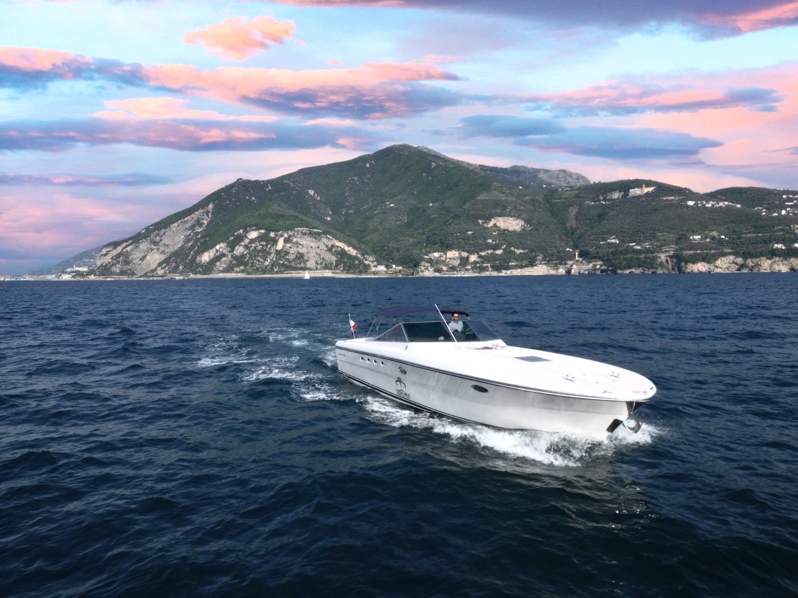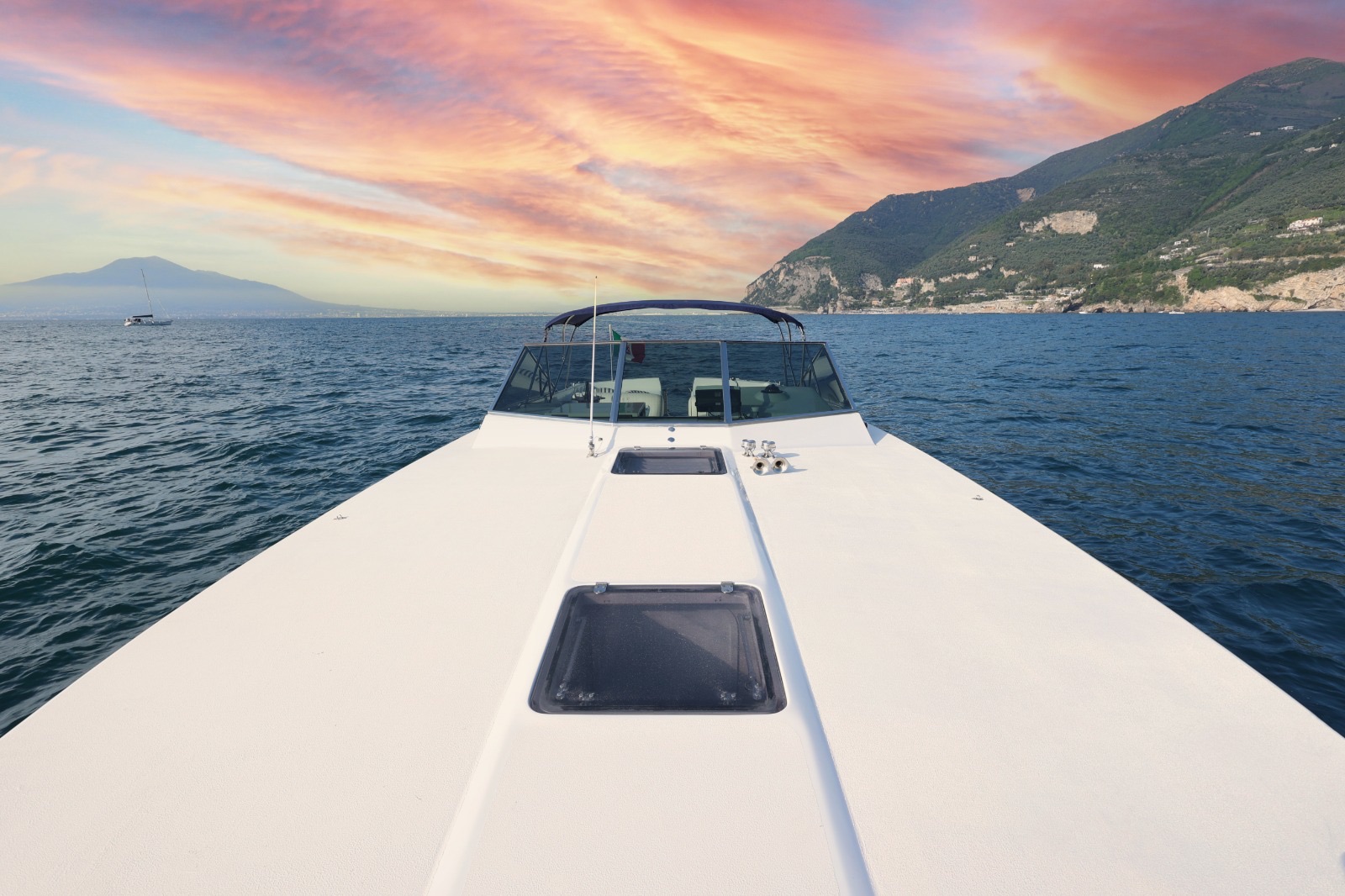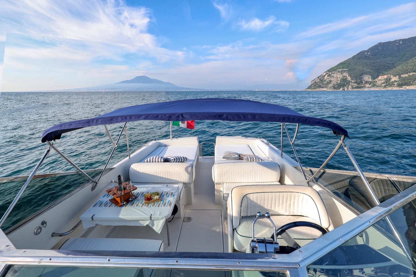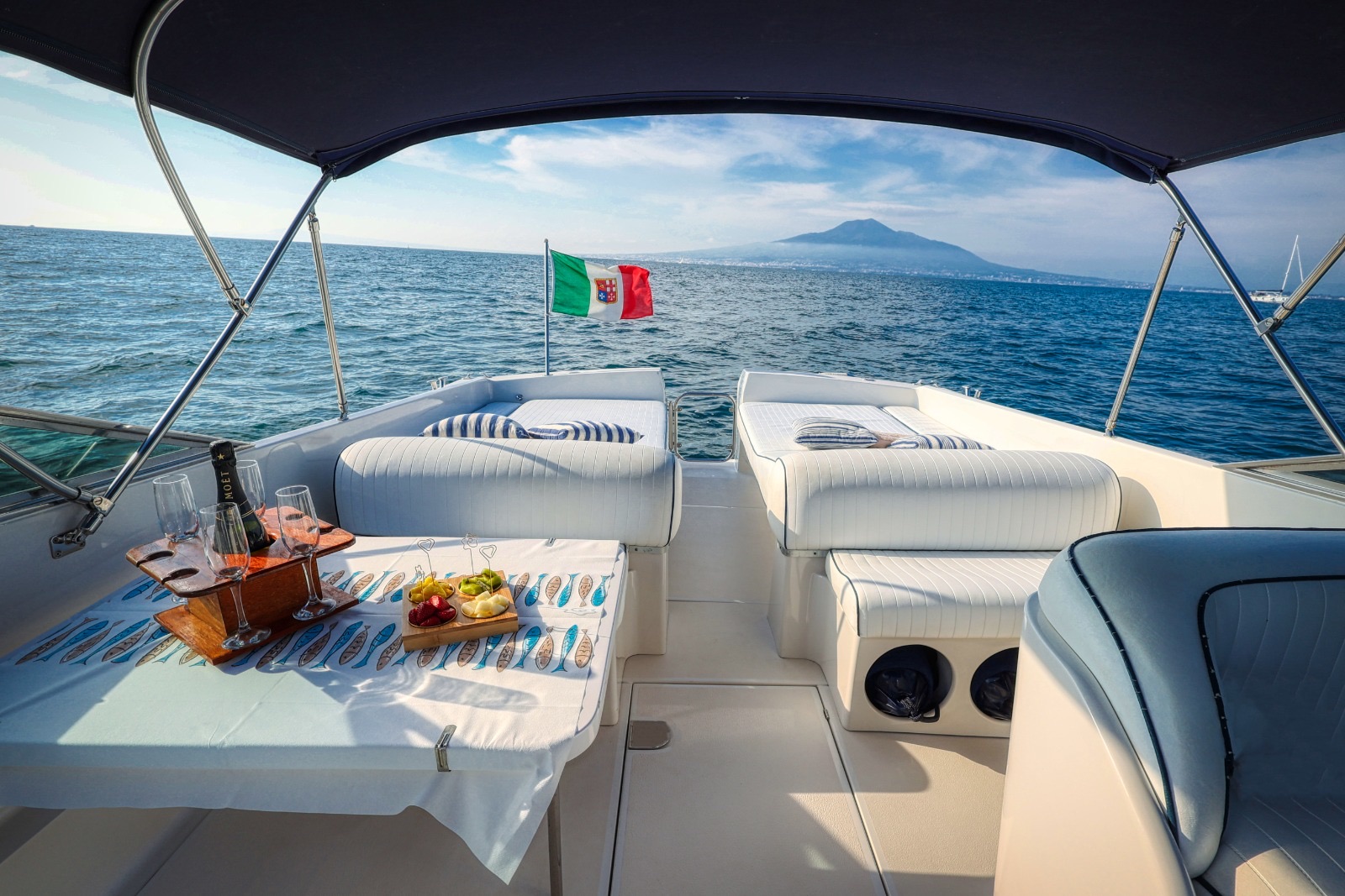 The Itama 38 stands as a testament to Italian craftsmanship, seamlessly blending high performance with timeless elegance. This open cruiser offers both speed and stability. Its deep V-shaped hull ensures smooth navigation even in challenging sea conditions. Below deck, the Itama 38 features a well-appointed cabin with a double berth and an en-suite bathroom, ensuring comfort during longer journeys. The galley is equipped with modern appliances, including a refrigerator and microwave. Entertainment options include a TV and Hi-Fi system with Bluetooth connectivity. Additional amenities comprise air conditioning, a sun awning, and safety equipment. The yacht's design emphasizes clean lines and a minimalist aesthetic, characteristic of the Itama brand. The cockpit area is spacious, featuring an L-shaped seating arrangement and a table, ideal for alfresco dining or relaxation. The aft deck includes a sunbathing area, allowing guests to enjoy the sun and sea breeze.