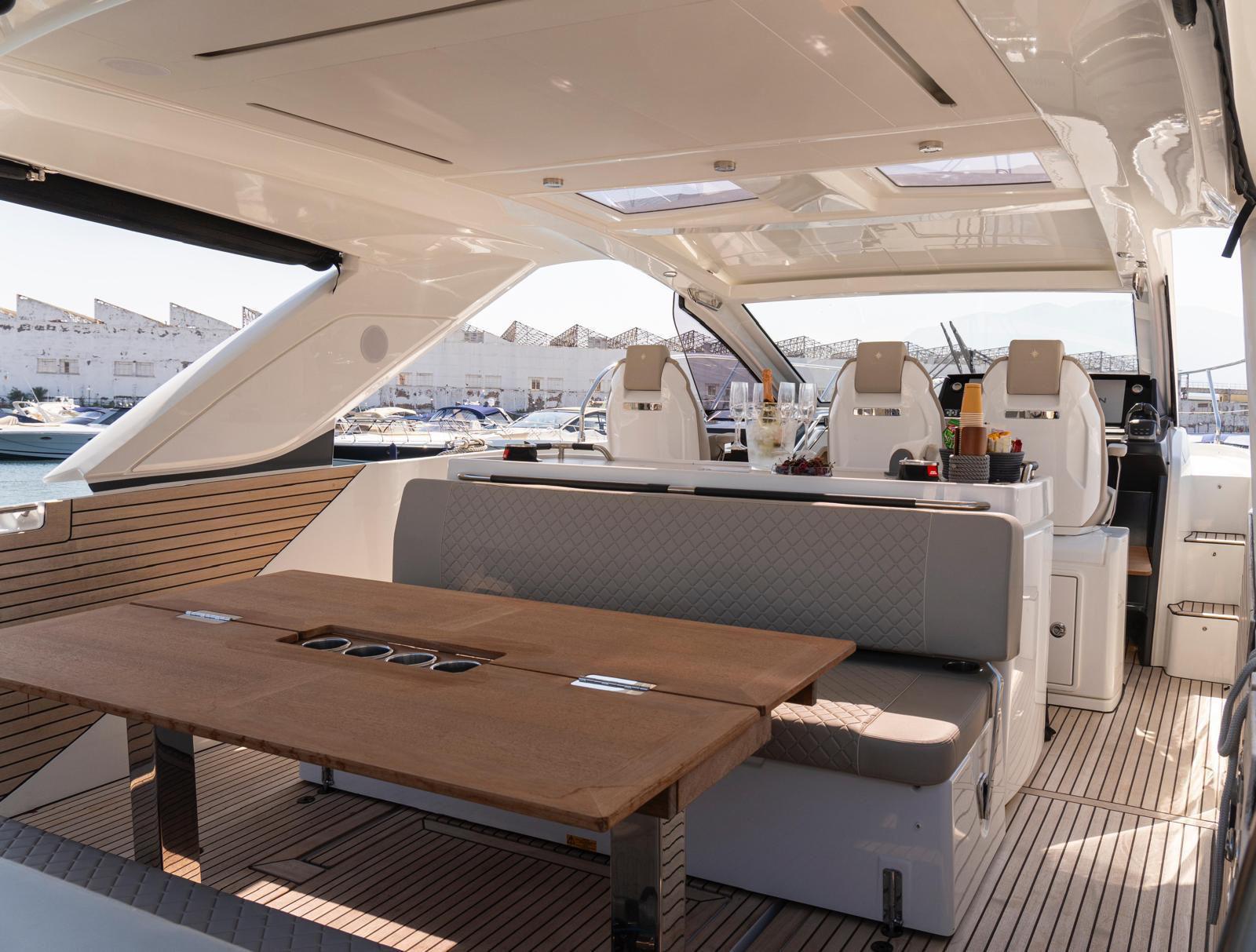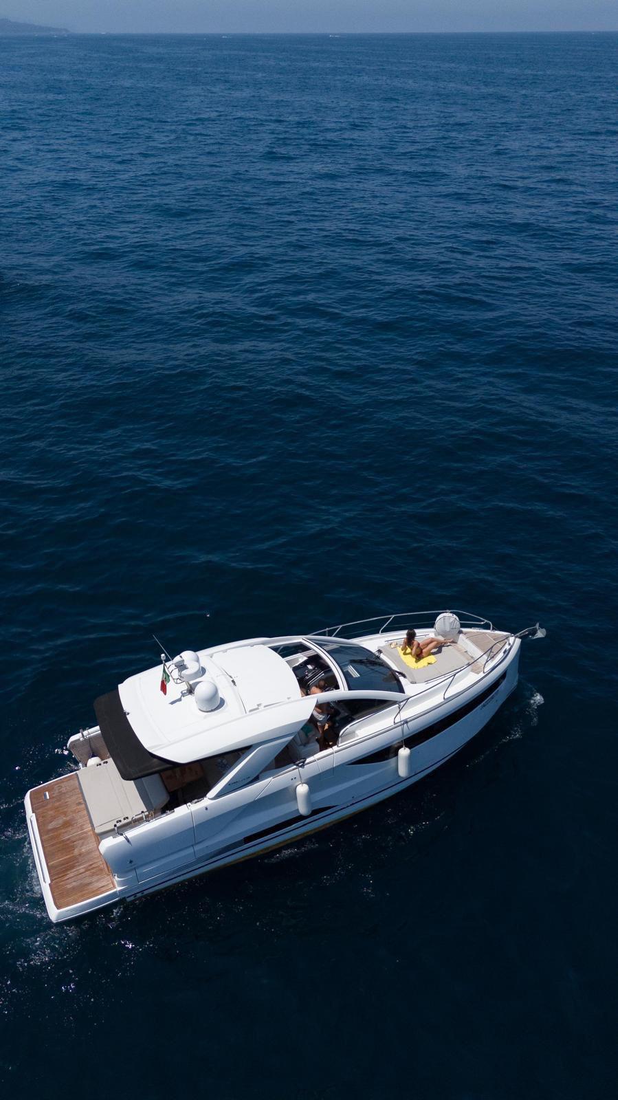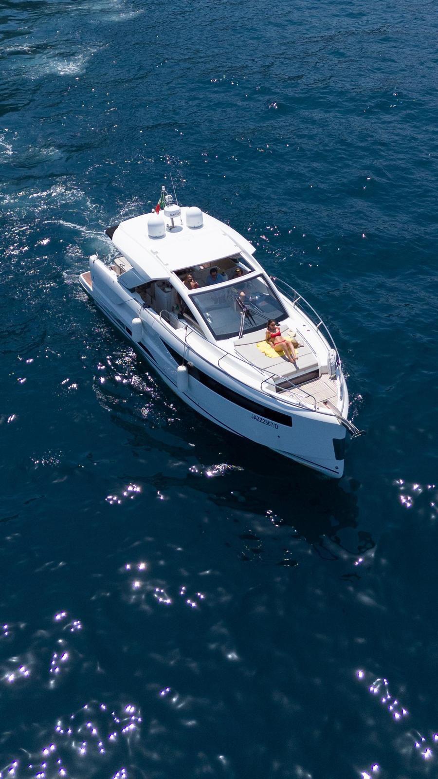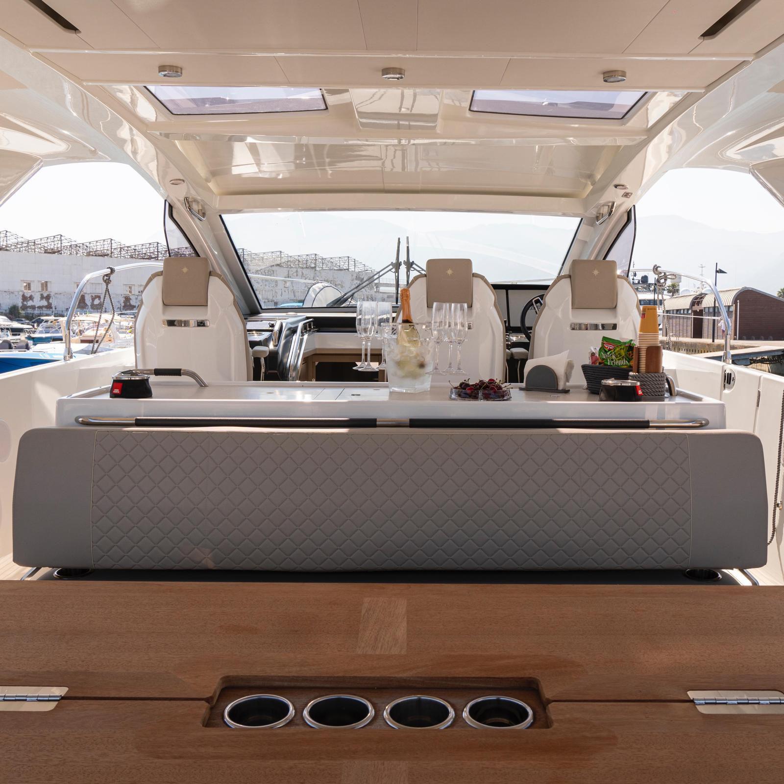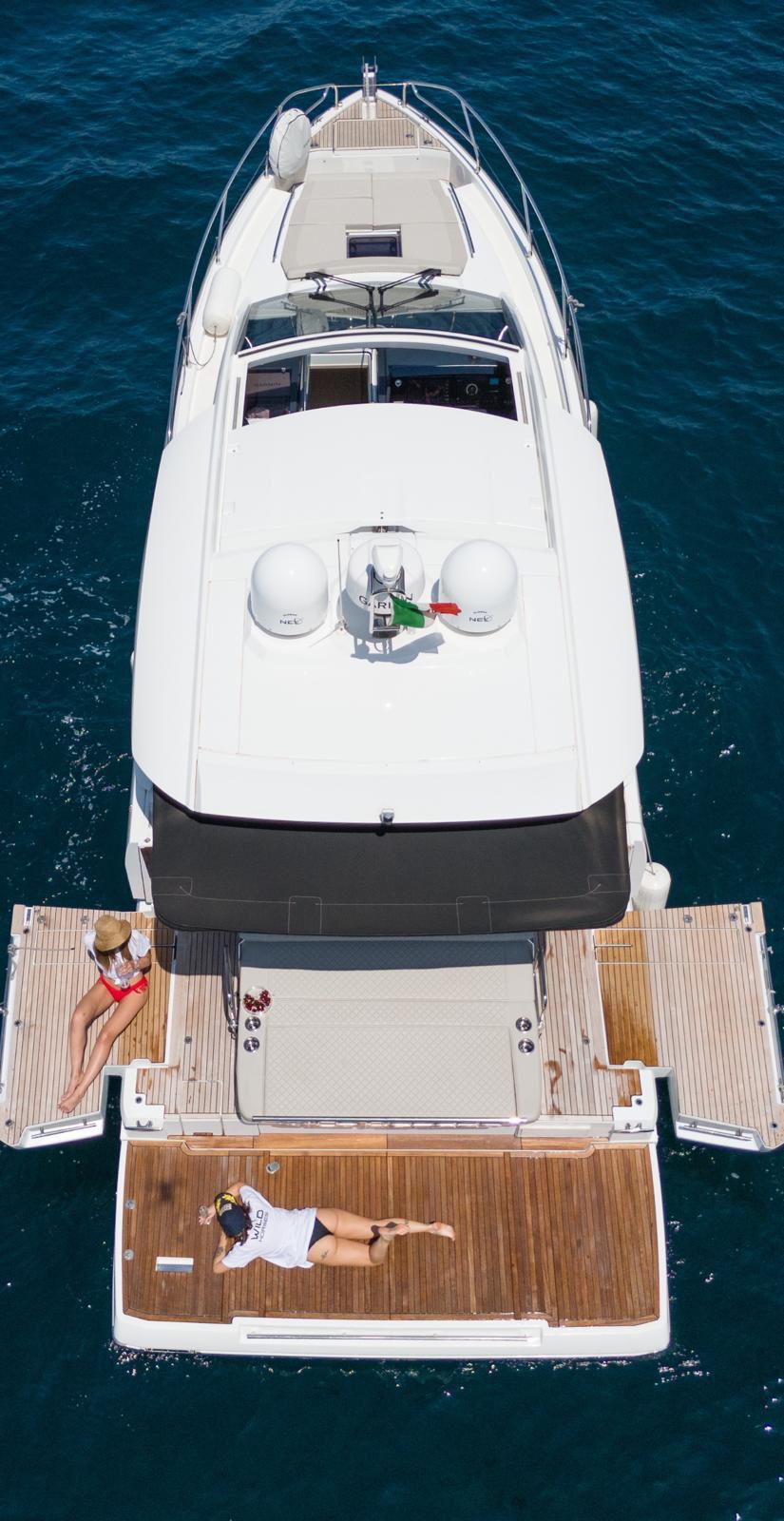 The Jeanneau DB/43 represents a new generation of premium day boats, combining luxury, performance, and innovative design. One of the defining features of the DB/43 is its open, sociable deck layout. Two large electrically opening side terraces transform the cockpit into a spacious beach-club area, providing direct access to the water and expanding the usable deck space for relaxation and entertainment. This design allows guests to fully enjoy life at sea while maintaining exceptional comfort on board. The cockpit is designed as a true outdoor living area, featuring comfortable seating, a large dining space, and a fully equipped galley with grill, refrigerator, and sink, perfect for hosting friends or family during a day at anchor. A protective hardtop ensures shade and comfort while maintaining the yacht’s sporty profile. Below deck, the DB/43 offers elegant and practical accommodation with two cabins and up to five berths, including a spacious owner’s cabin and a guest cabin. High-end finishes and thoughtful design create a warm, refined atmosphere for overnight stays. Designed to host up to 12 people on board, the Jeanneau DB/43 is the perfect balance between luxury day cruising and weekend getaway capability.