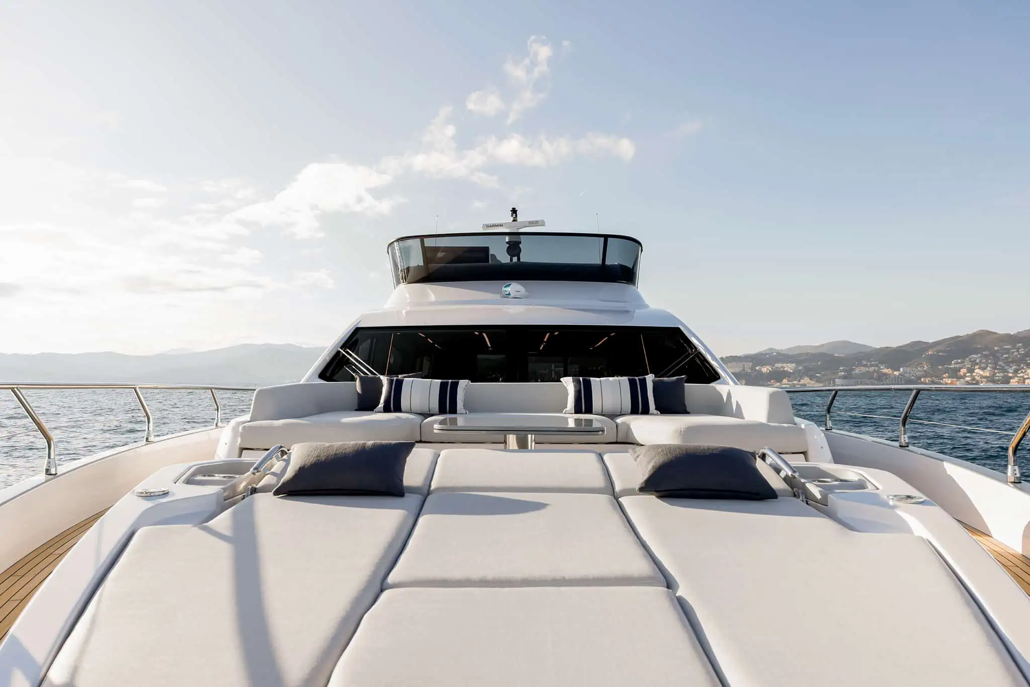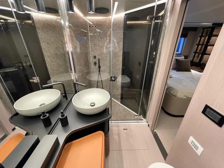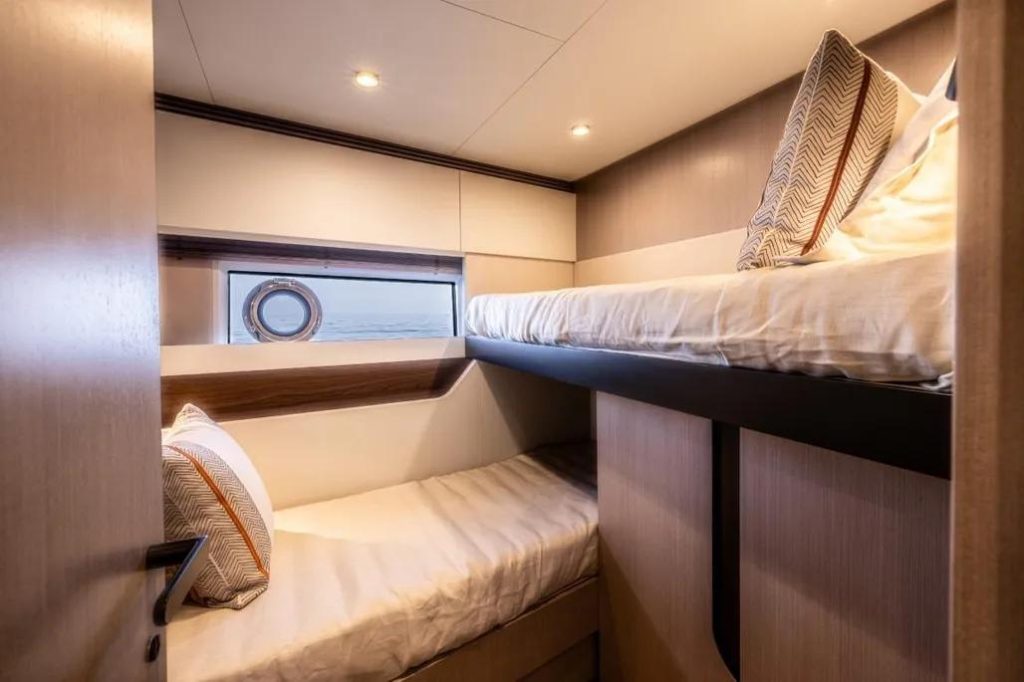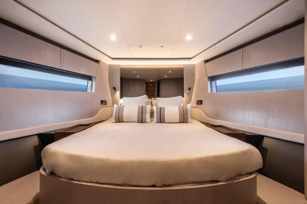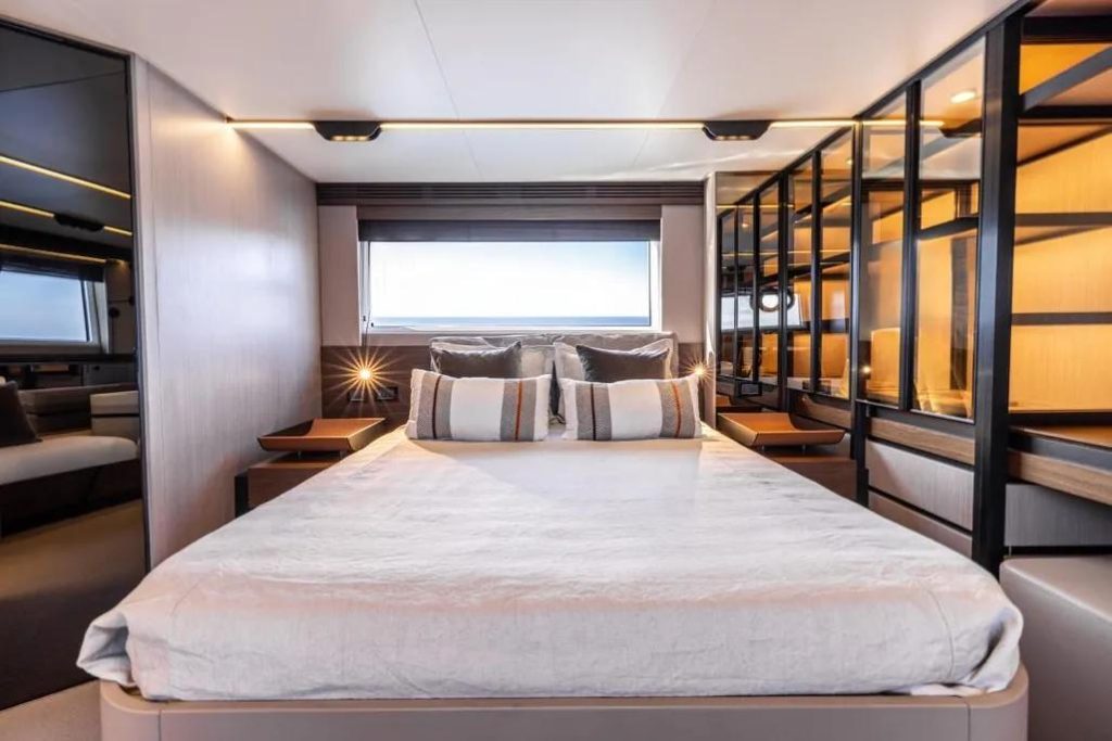 The living area is large and bright, entirely developed on the main deck, allowing you to enjoy the sea and sun at 360°, without precluding shelter in case of bad weather, thanks to the presence of a sliding hardtop, large windows, and a glass bulkhead that closes off the area towards the stern. Thanks to this, rather than a true open boat, the S 7 could be described as a beautiful “coupé” of the sea. Below deck, the sleeping areas, both for guests and the owner, are completely separated from the galley and also have separate access to the saloon, which is quite unusual in this type of hull and especially in this size range, offering maximum privacy. The decision to adopt IPS transmissions, with the engine room set back, has created considerable space for the cabins and a noticeable noise reduction.