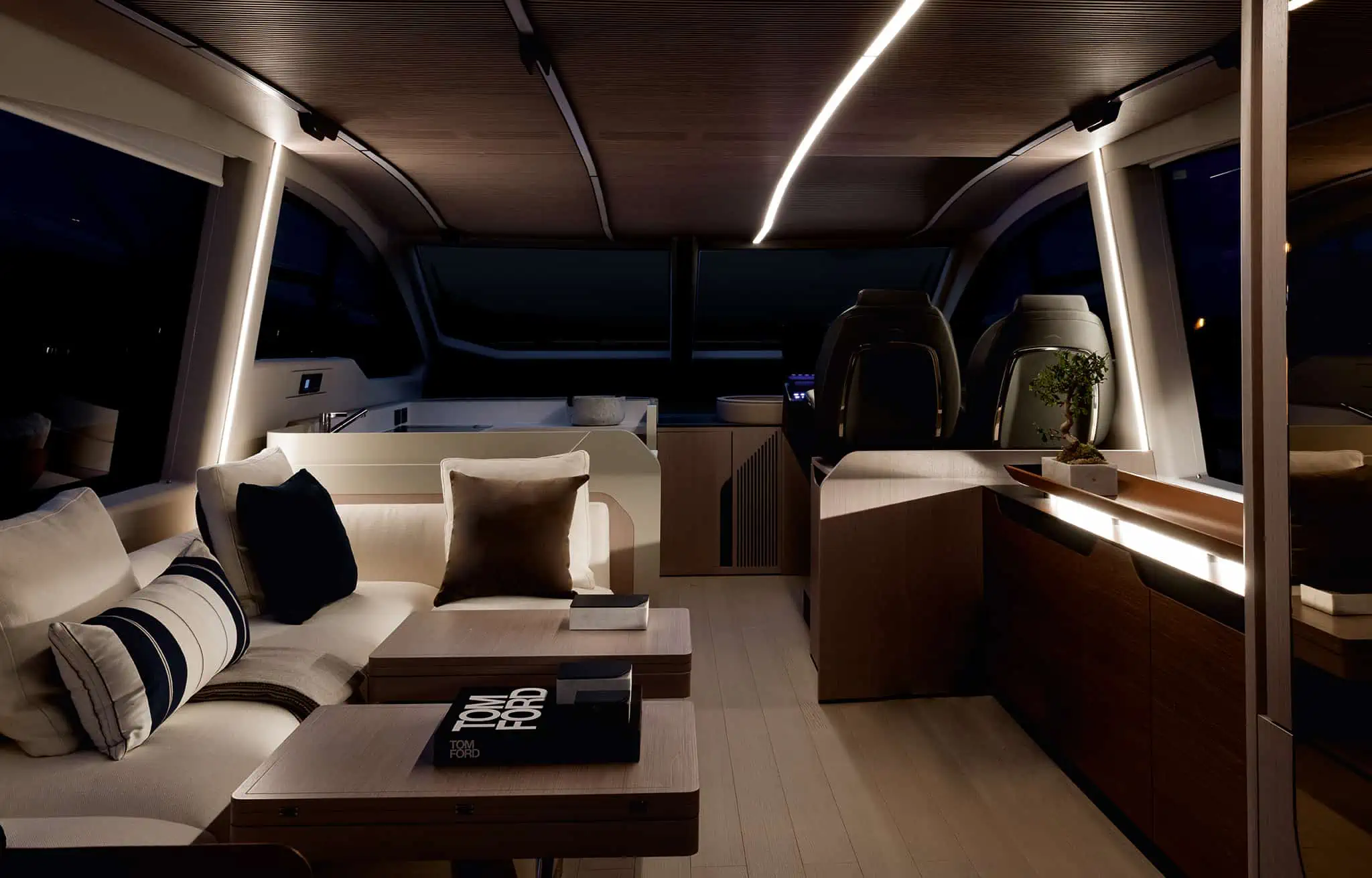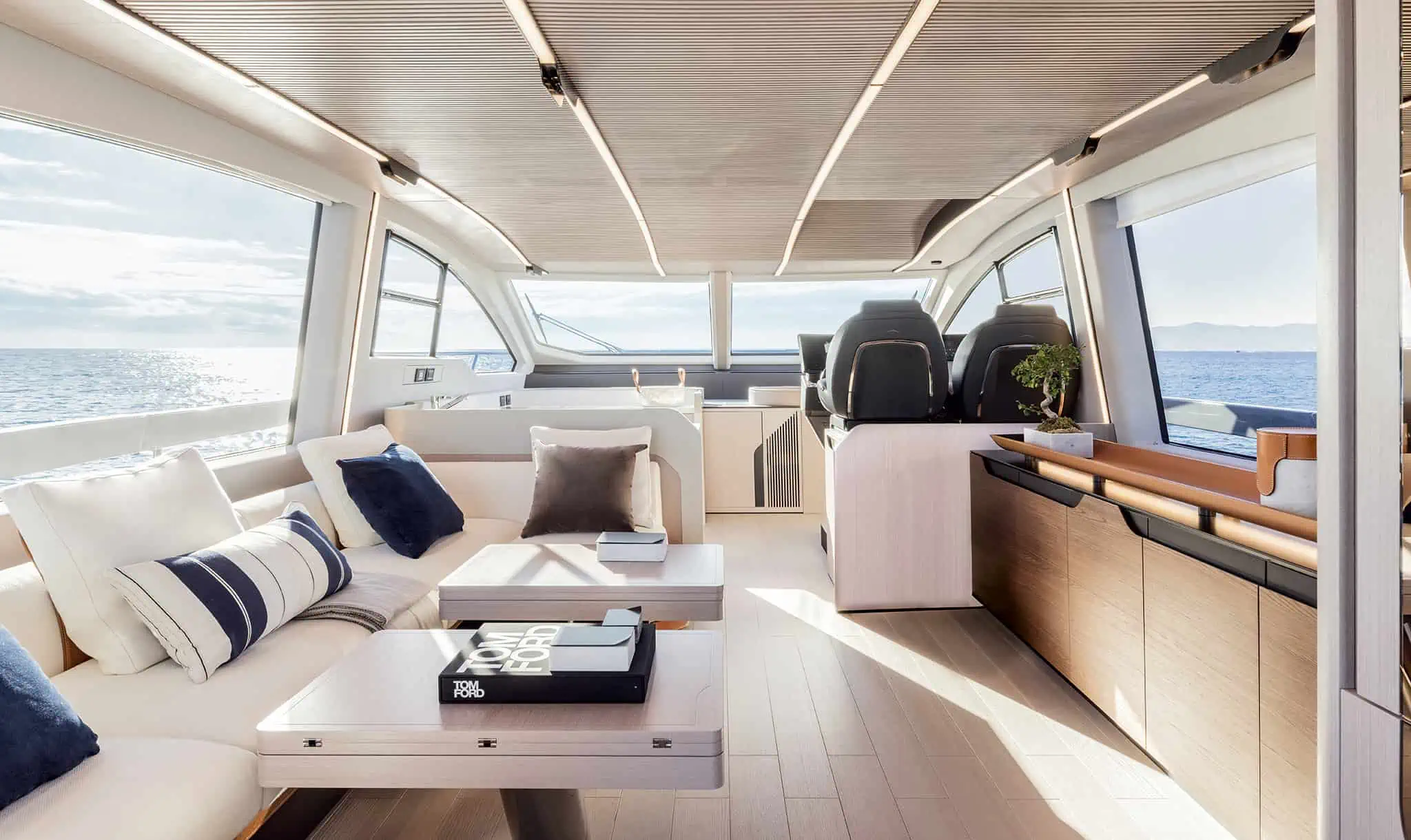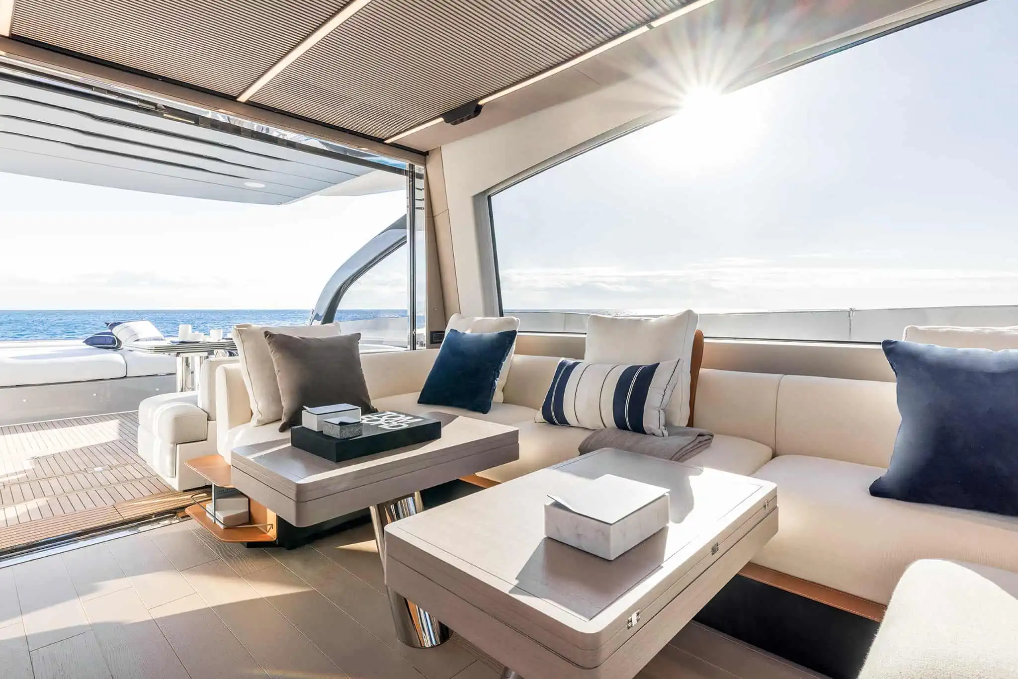 The living area is large and bright, entirely developed on the main deck, allowing you to enjoy the sea and sun at 360°, without precluding shelter in case of bad weather, thanks to the presence of a sliding hardtop, large windows, and a glass bulkhead that closes off the area towards the stern. Thanks to this, rather than a true open boat, the S 7 could be described as a beautiful “coupé” of the sea. Below deck, the sleeping areas, both for guests and the owner, are completely separated from the galley and also have separate access to the saloon, which is quite unusual in this type of hull and especially in this size range, offering maximum privacy. The decision to adopt IPS transmissions, with the engine room set back, has created considerable space for the cabins and a noticeable noise reduction.