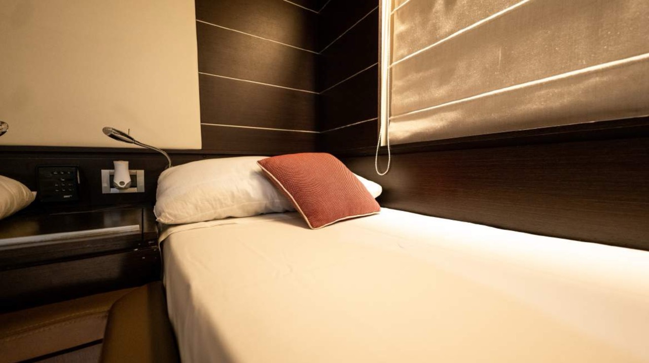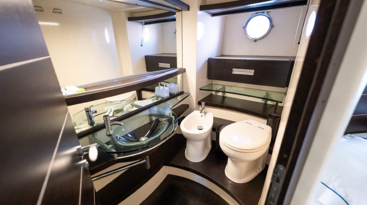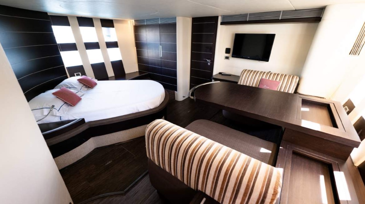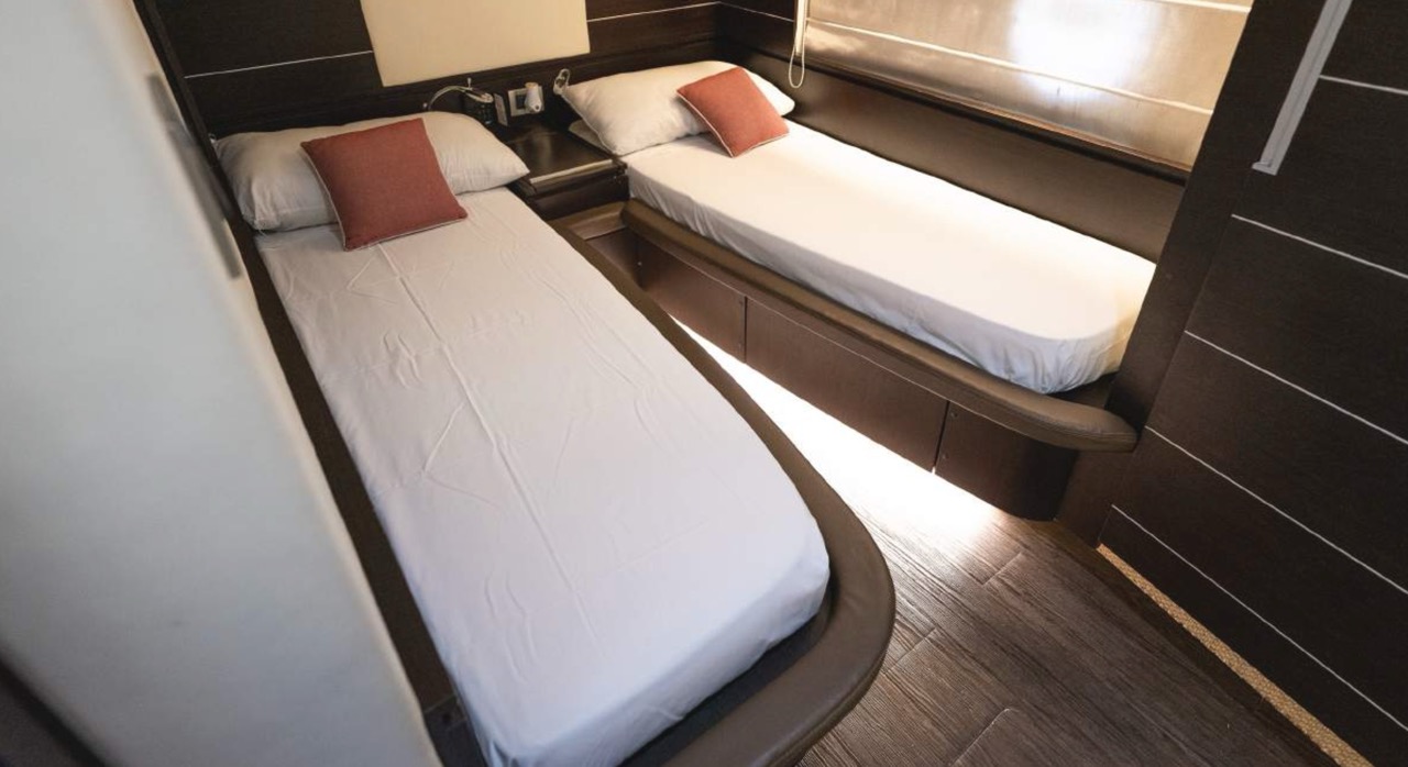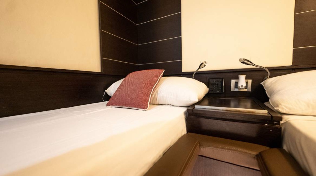 The spacious cockpit offers a large aft sunpad, removable teak table, and effortless access to the bow via wide walkways, where guests can enjoy a generous forward sundeck with adjustable backrests. The bright dinette features a comfortable sofa and an electric table that converts easily between coffee and dining setups. To port, the helm station includes a captain’s chair and companion sofa, ideal for guests who enjoy the navigation experience. The starboard-side galley is cleverly positioned with a private crew staircase, ensuring seamless service and full guest privacy. Accommodation – 3 Cabins, 3 Bathrooms + Crew Below deck, the full-beam master cabin impresses with panoramic sea-view windows on both sides, a dedicated beauty area with seating, generous his-and-hers wardrobes, and a luxurious ensuite bathroom complete with electric toilet, bidet, glass sink, and enclosed shower with wooden bench. The portside twin cabin offers two single beds and a private ensuite with shower. The forward VIP cabin features a comfortable double bed and its own ensuite bathroom with shower and upscale finishes. Perfect for families or groups of friends, this yacht offers spacious outdoor lounging, smart interior design, and private crew access, ensuring comfort, privacy, and an exceptional charter experience.