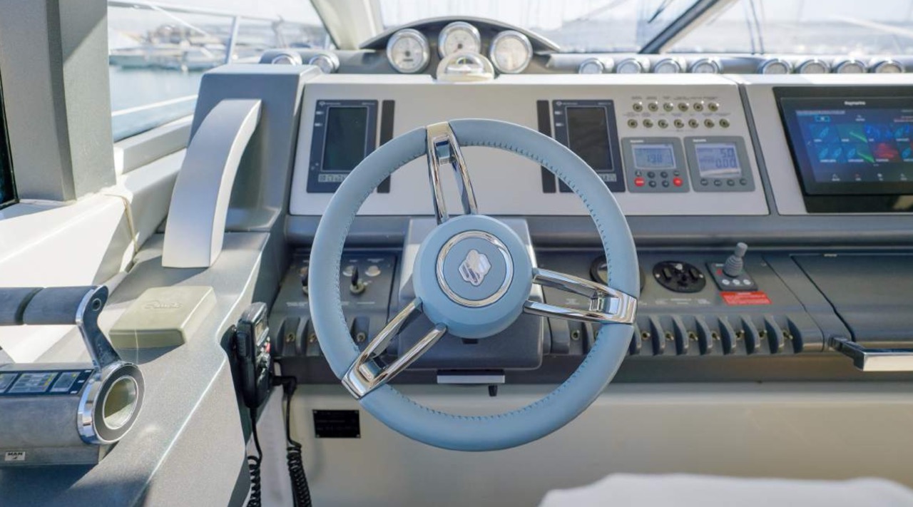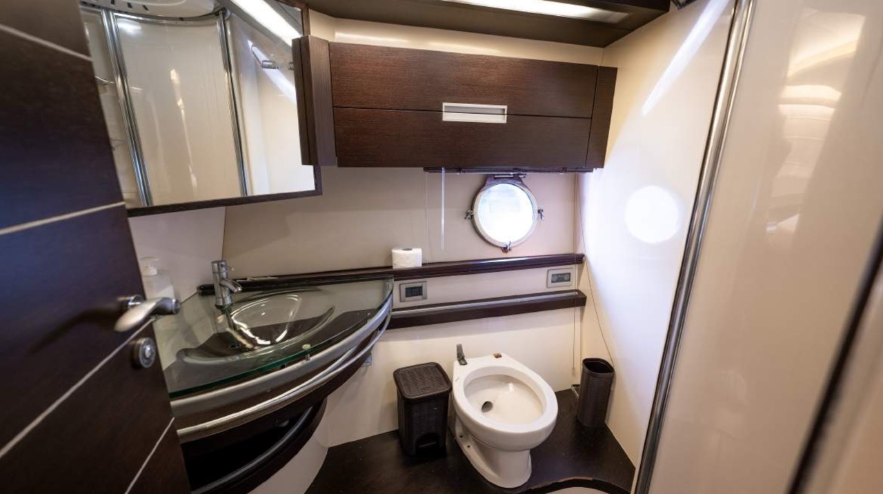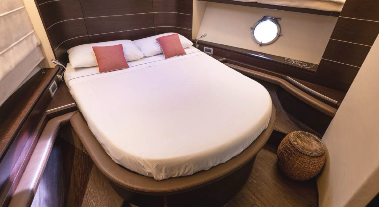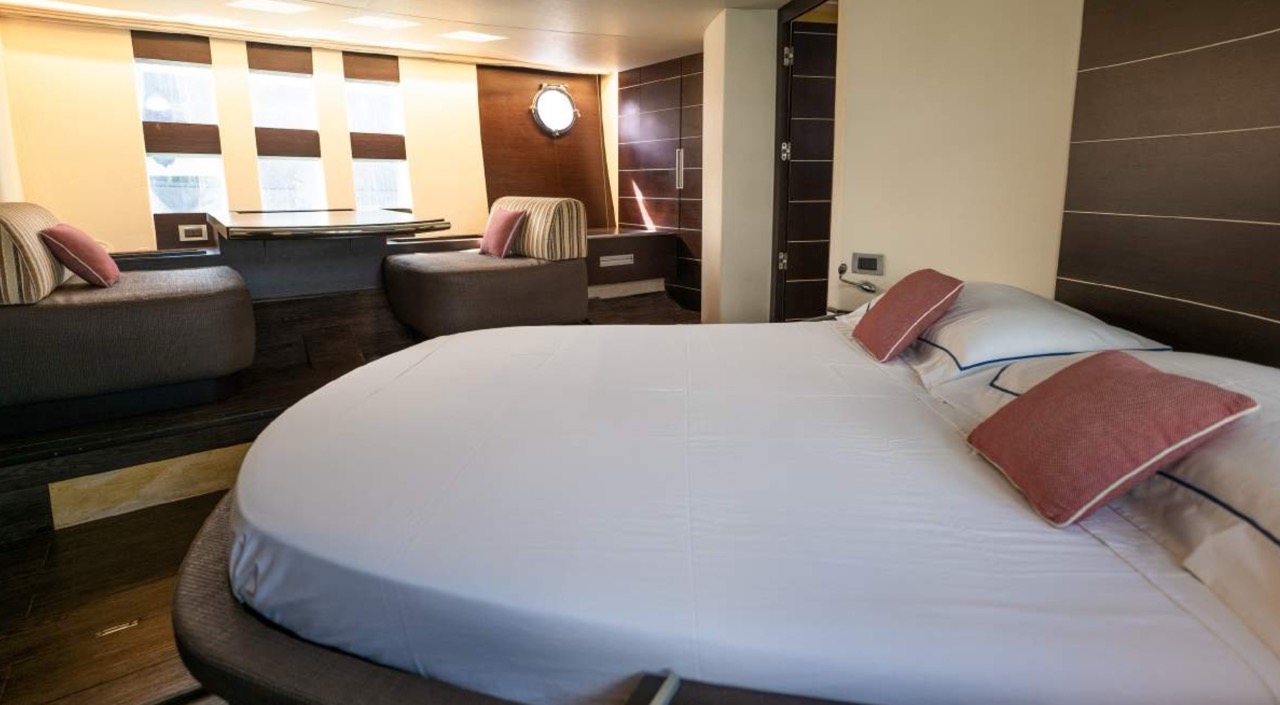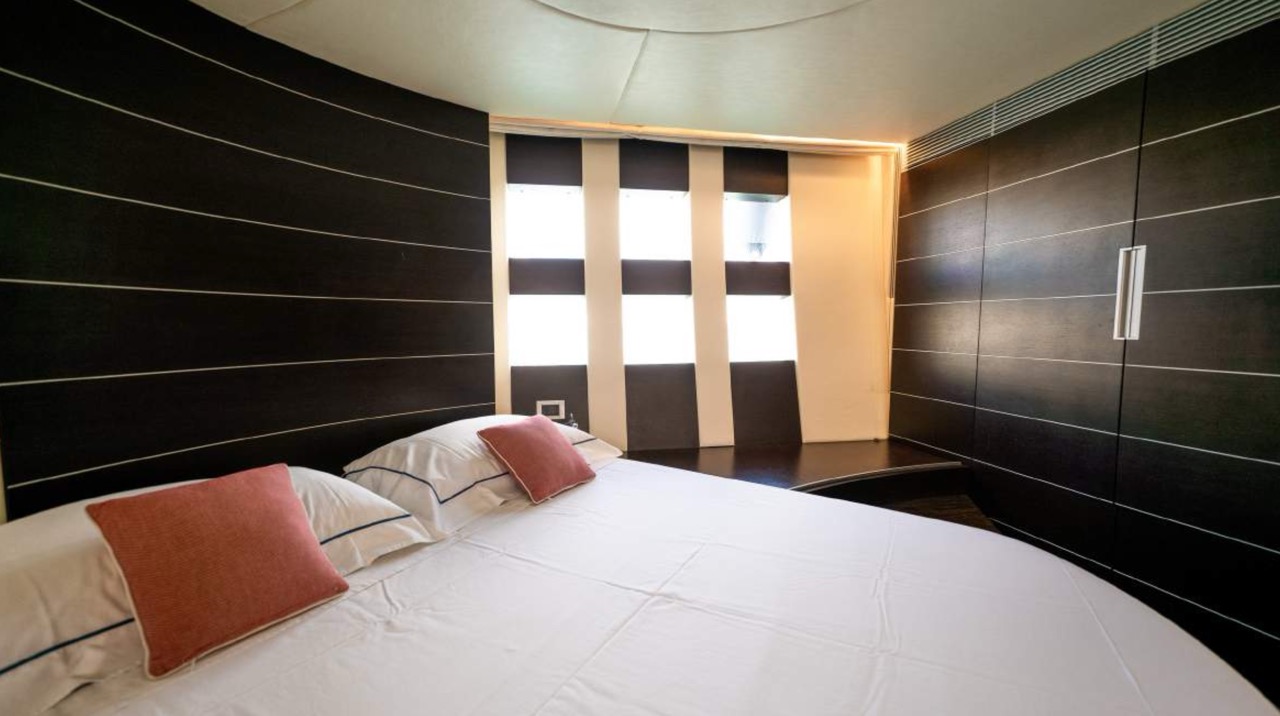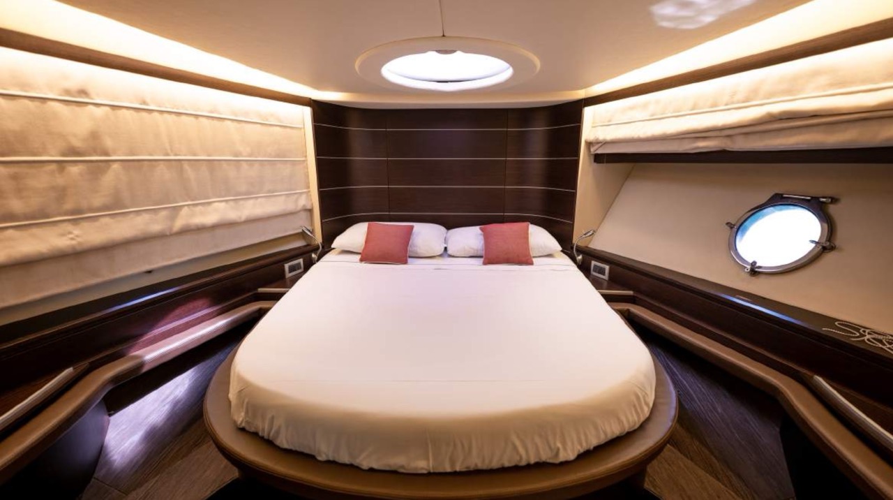 The spacious cockpit offers a large aft sunpad, removable teak table, and effortless access to the bow via wide walkways, where guests can enjoy a generous forward sundeck with adjustable backrests. The bright dinette features a comfortable sofa and an electric table that converts easily between coffee and dining setups. To port, the helm station includes a captain’s chair and companion sofa, ideal for guests who enjoy the navigation experience. The starboard-side galley is cleverly positioned with a private crew staircase, ensuring seamless service and full guest privacy. Accommodation – 3 Cabins, 3 Bathrooms + Crew Below deck, the full-beam master cabin impresses with panoramic sea-view windows on both sides, a dedicated beauty area with seating, generous his-and-hers wardrobes, and a luxurious ensuite bathroom complete with electric toilet, bidet, glass sink, and enclosed shower with wooden bench. The portside twin cabin offers two single beds and a private ensuite with shower. The forward VIP cabin features a comfortable double bed and its own ensuite bathroom with shower and upscale finishes. Perfect for families or groups of friends, this yacht offers spacious outdoor lounging, smart interior design, and private crew access, ensuring comfort, privacy, and an exceptional charter experience.