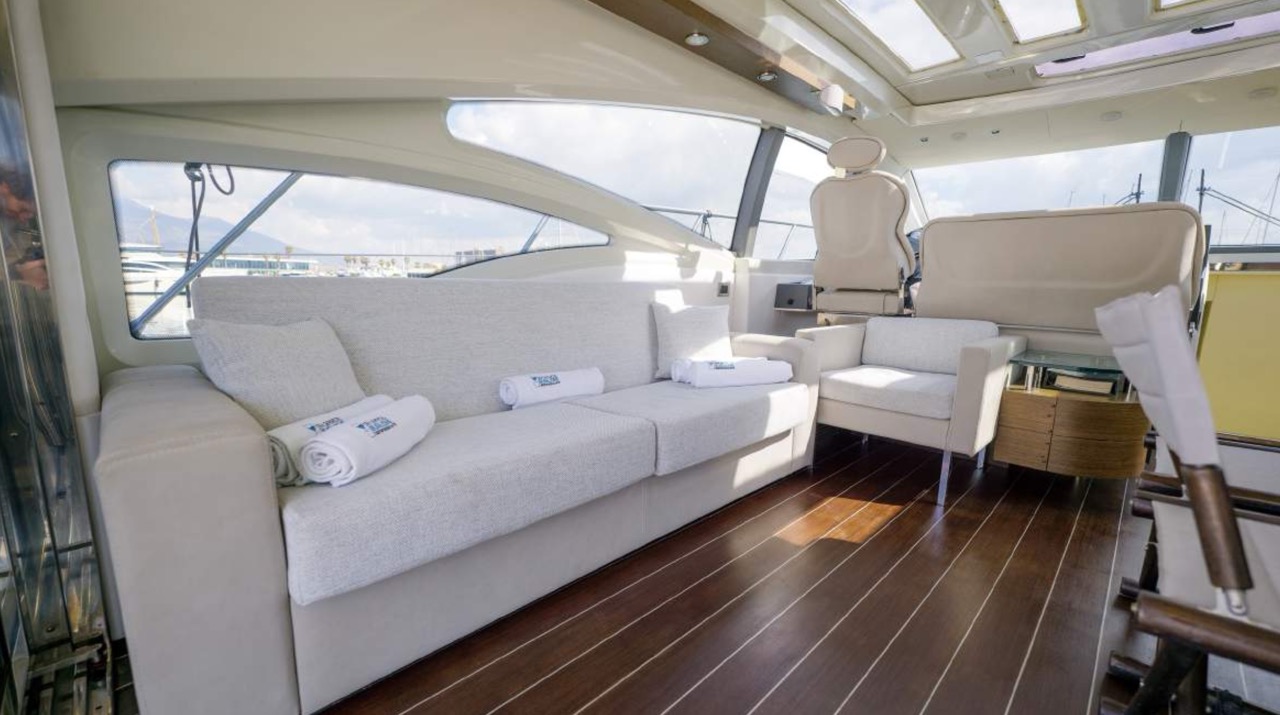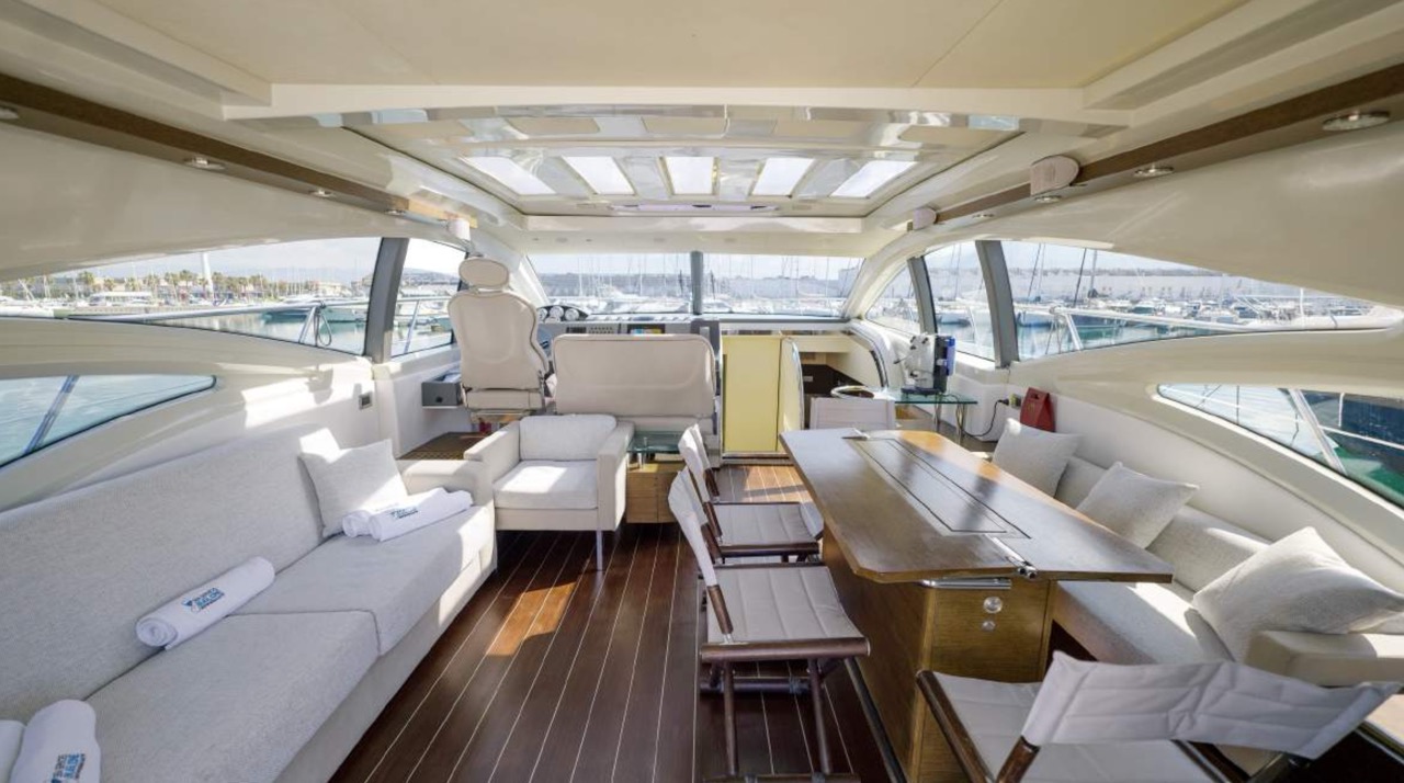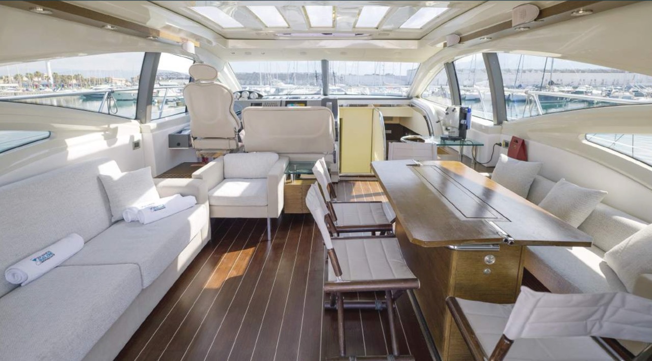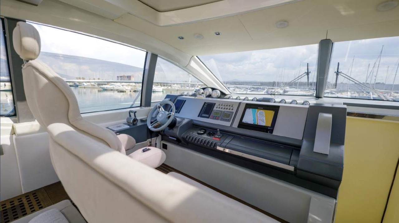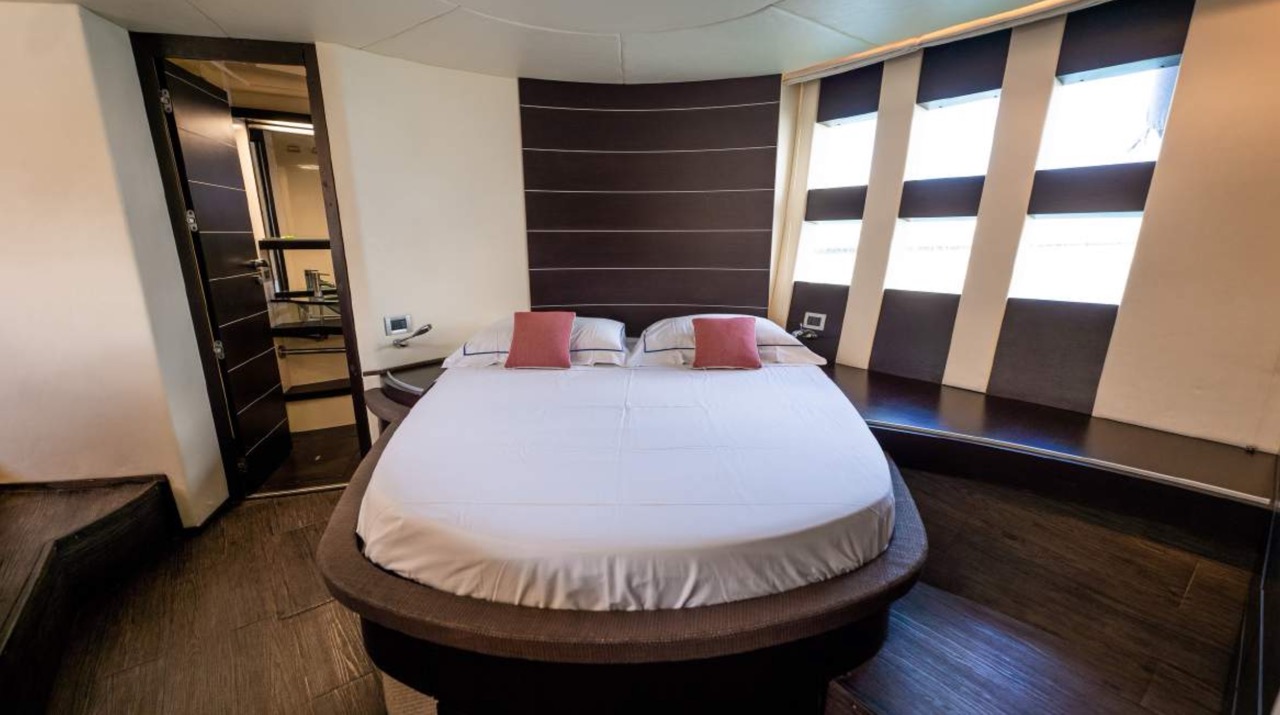 The spacious cockpit offers a large aft sunpad, removable teak table, and effortless access to the bow via wide walkways, where guests can enjoy a generous forward sundeck with adjustable backrests. The bright dinette features a comfortable sofa and an electric table that converts easily between coffee and dining setups. To port, the helm station includes a captain’s chair and companion sofa, ideal for guests who enjoy the navigation experience. The starboard-side galley is cleverly positioned with a private crew staircase, ensuring seamless service and full guest privacy. Accommodation – 3 Cabins, 3 Bathrooms + Crew Below deck, the full-beam master cabin impresses with panoramic sea-view windows on both sides, a dedicated beauty area with seating, generous his-and-hers wardrobes, and a luxurious ensuite bathroom complete with electric toilet, bidet, glass sink, and enclosed shower with wooden bench. The portside twin cabin offers two single beds and a private ensuite with shower. The forward VIP cabin features a comfortable double bed and its own ensuite bathroom with shower and upscale finishes. Perfect for families or groups of friends, this yacht offers spacious outdoor lounging, smart interior design, and private crew access, ensuring comfort, privacy, and an exceptional charter experience.