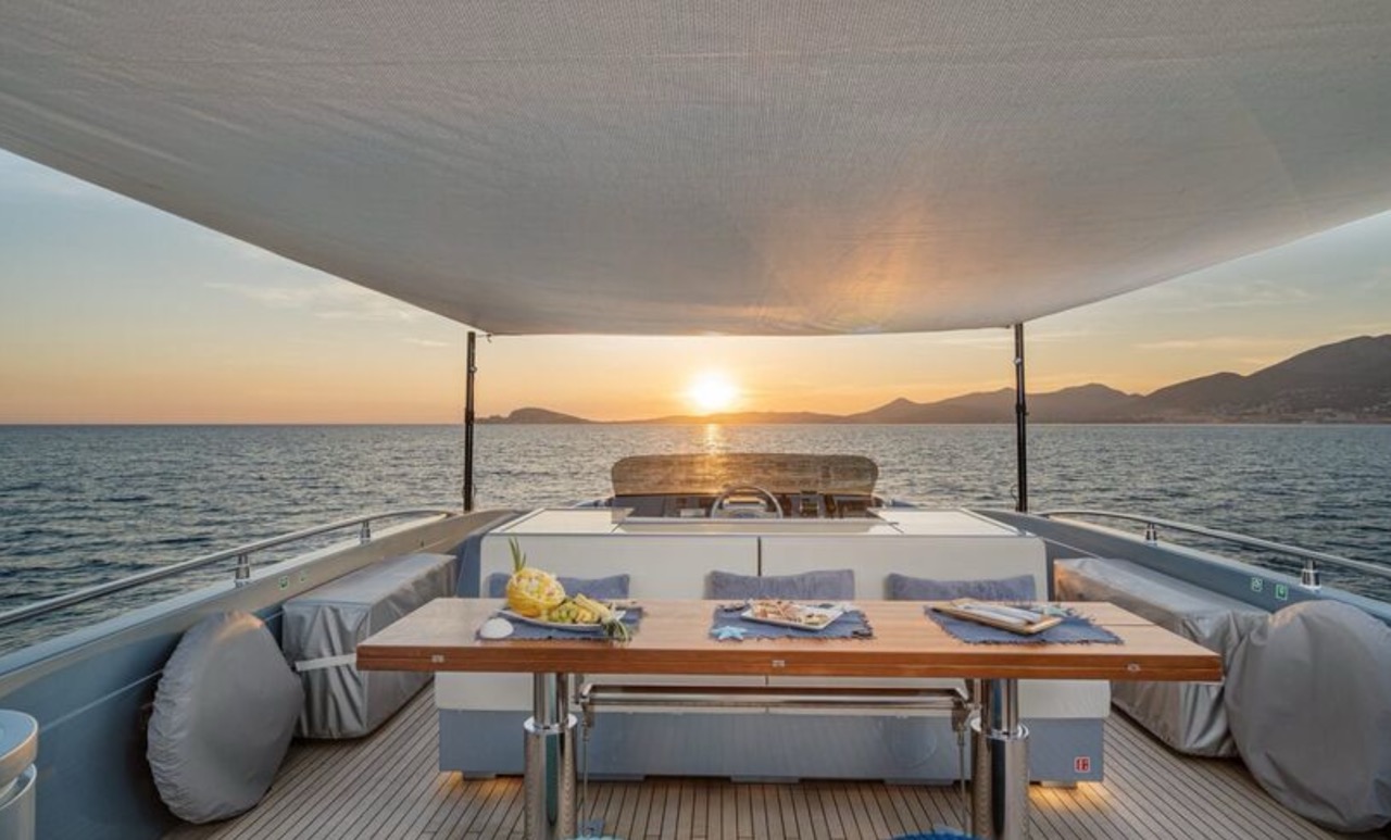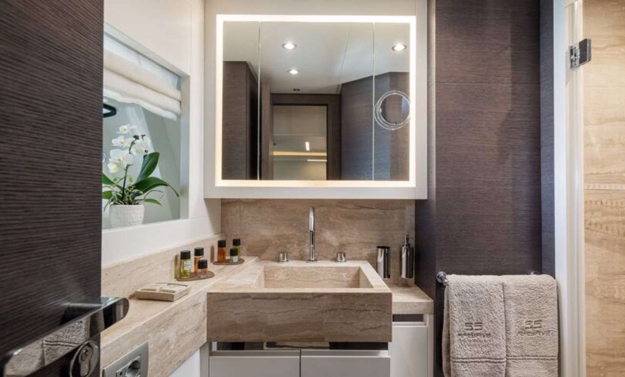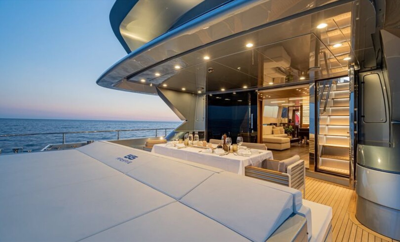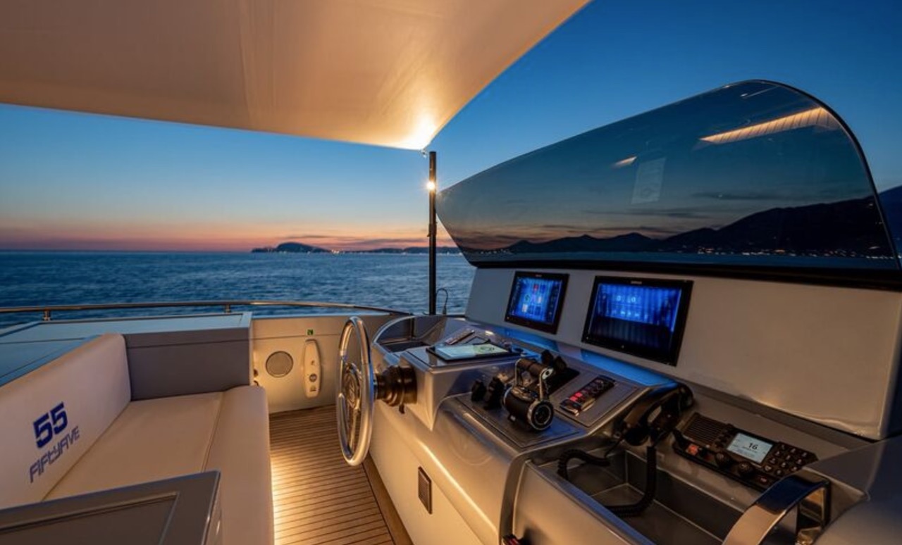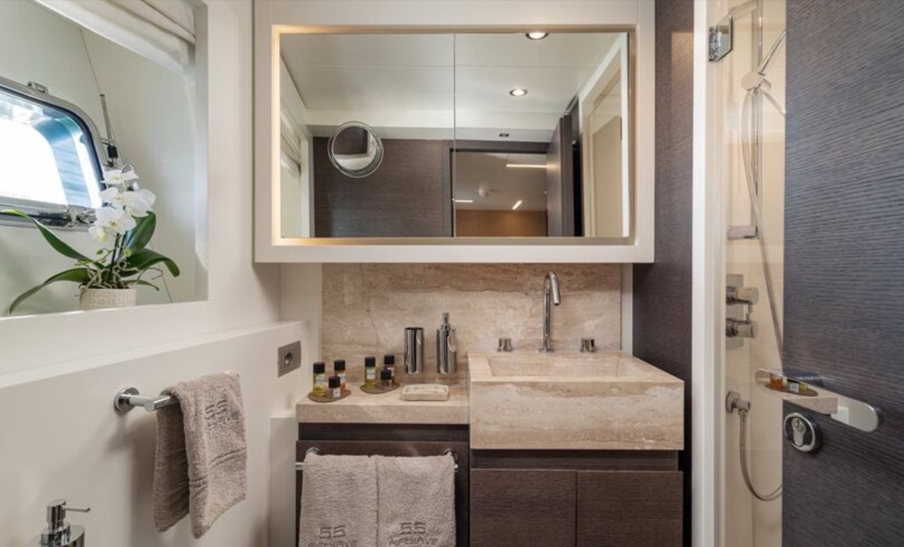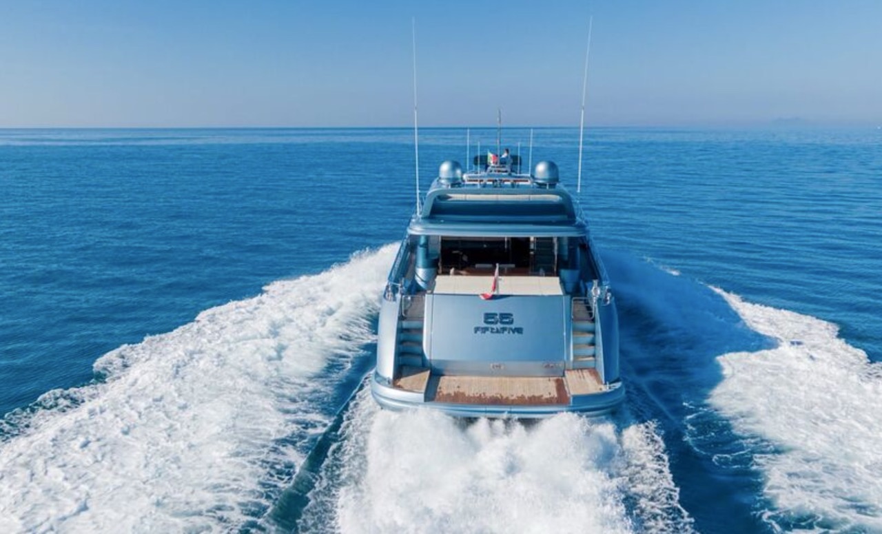 She enhances all the winning features of the line it belongs to, combining wisely the comforts of the flying bridge with the sportiness and speed of large open yachts. The spacious salon features a large sofa with a light shade fabric and an internal dining table. The extremely flexible flybridge has an outdoor table and a large sunbathing area. A shading tent is provided throughout the flybridge. At the stern, there is a dining/relaxation area with a folding television, a barbecue, a fridge, and a large sunbathing area. At the bow, there is a large sunbathing area with a wide round sofa. The yacht can accommodate up to 9 guests in 4 cabins, including 1 Master, 1 VIP, and 2 Twin with separate beds and pullman beds. All with en-suites. Bathrooms are made of marble. Thanks to the Seakeeper gyroscopic stabilizer, the yacht offers unique comfort when at anchor or cruising. The crew of 55 FIFTYFIVE is composed of 4 people, all experienced and highly professional. She is equipped with Starlink high-speed internet.