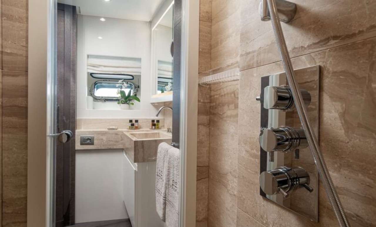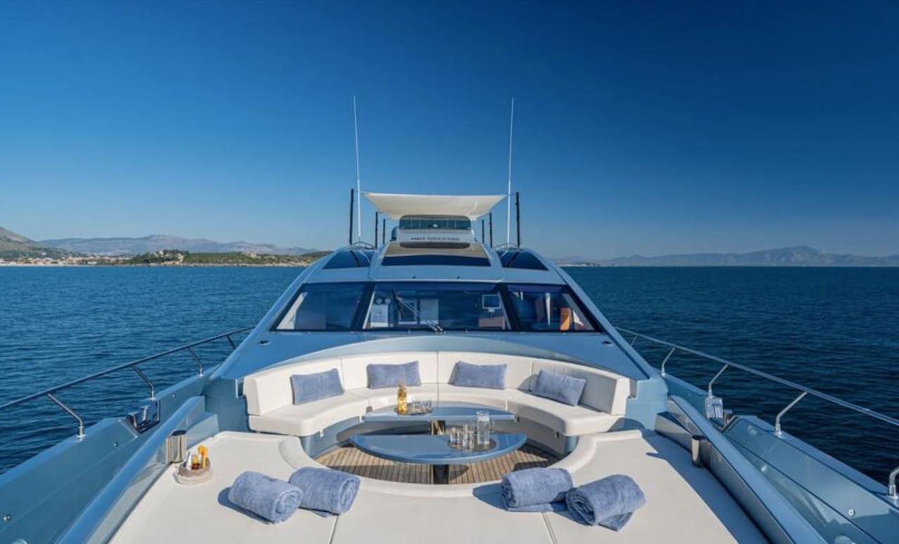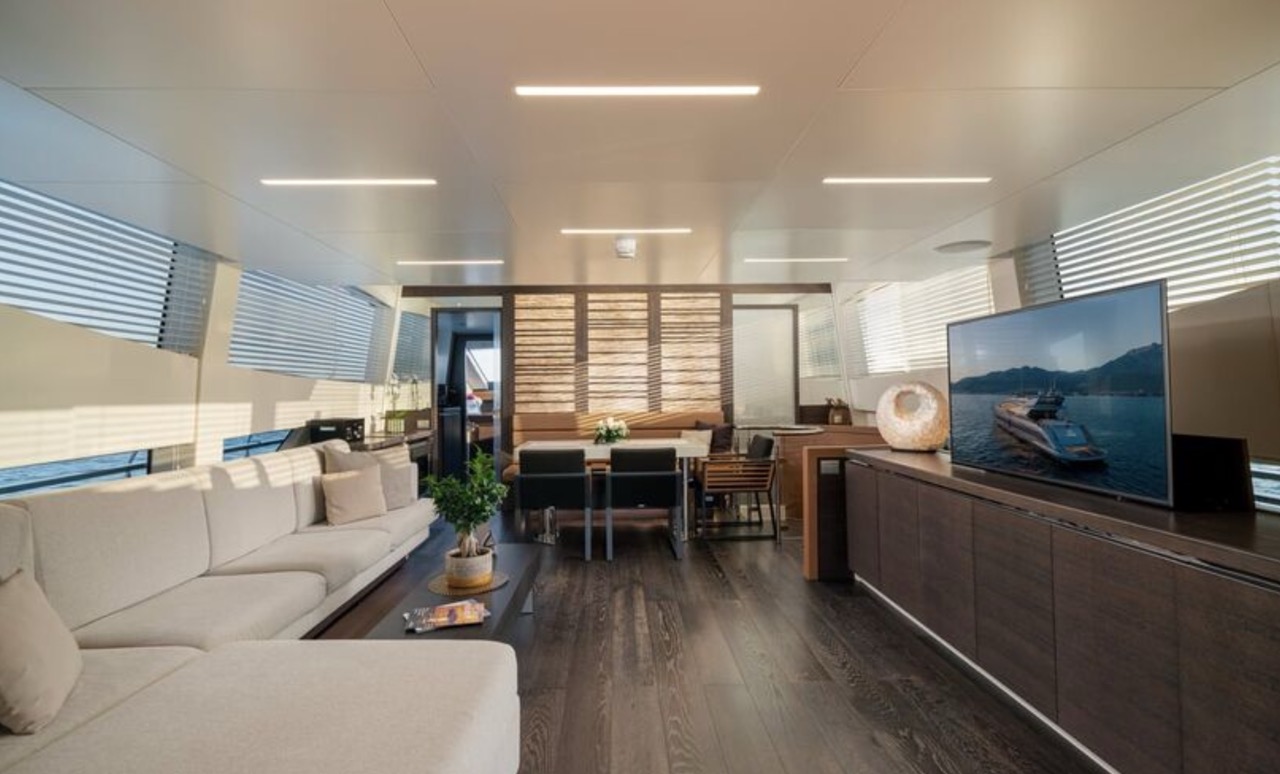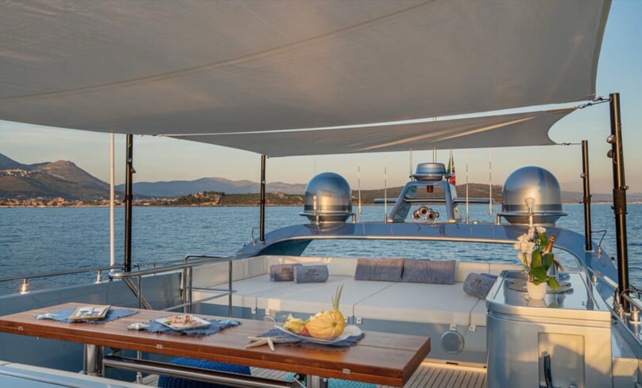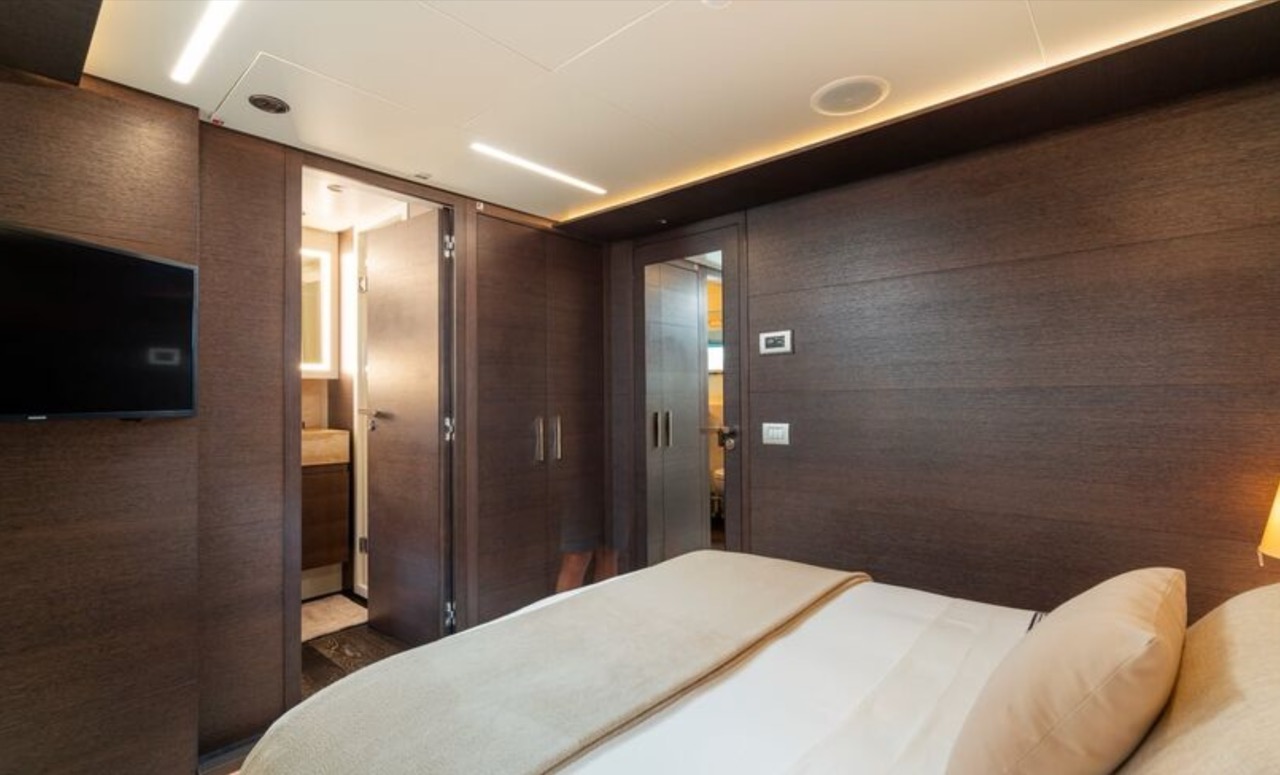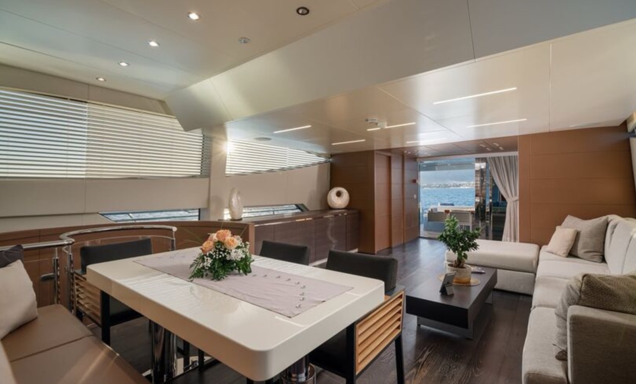 She enhances all the winning features of the line it belongs to, combining wisely the comforts of the flying bridge with the sportiness and speed of large open yachts. The spacious salon features a large sofa with a light shade fabric and an internal dining table. The extremely flexible flybridge has an outdoor table and a large sunbathing area. A shading tent is provided throughout the flybridge. At the stern, there is a dining/relaxation area with a folding television, a barbecue, a fridge, and a large sunbathing area. At the bow, there is a large sunbathing area with a wide round sofa. The yacht can accommodate up to 9 guests in 4 cabins, including 1 Master, 1 VIP, and 2 Twin with separate beds and pullman beds. All with en-suites. Bathrooms are made of marble. Thanks to the Seakeeper gyroscopic stabilizer, the yacht offers unique comfort when at anchor or cruising. The crew of 55 FIFTYFIVE is composed of 4 people, all experienced and highly professional. She is equipped with Starlink high-speed internet.