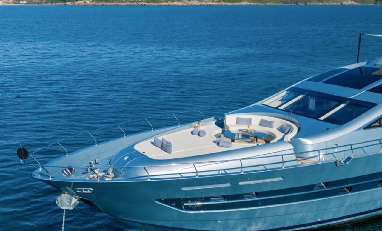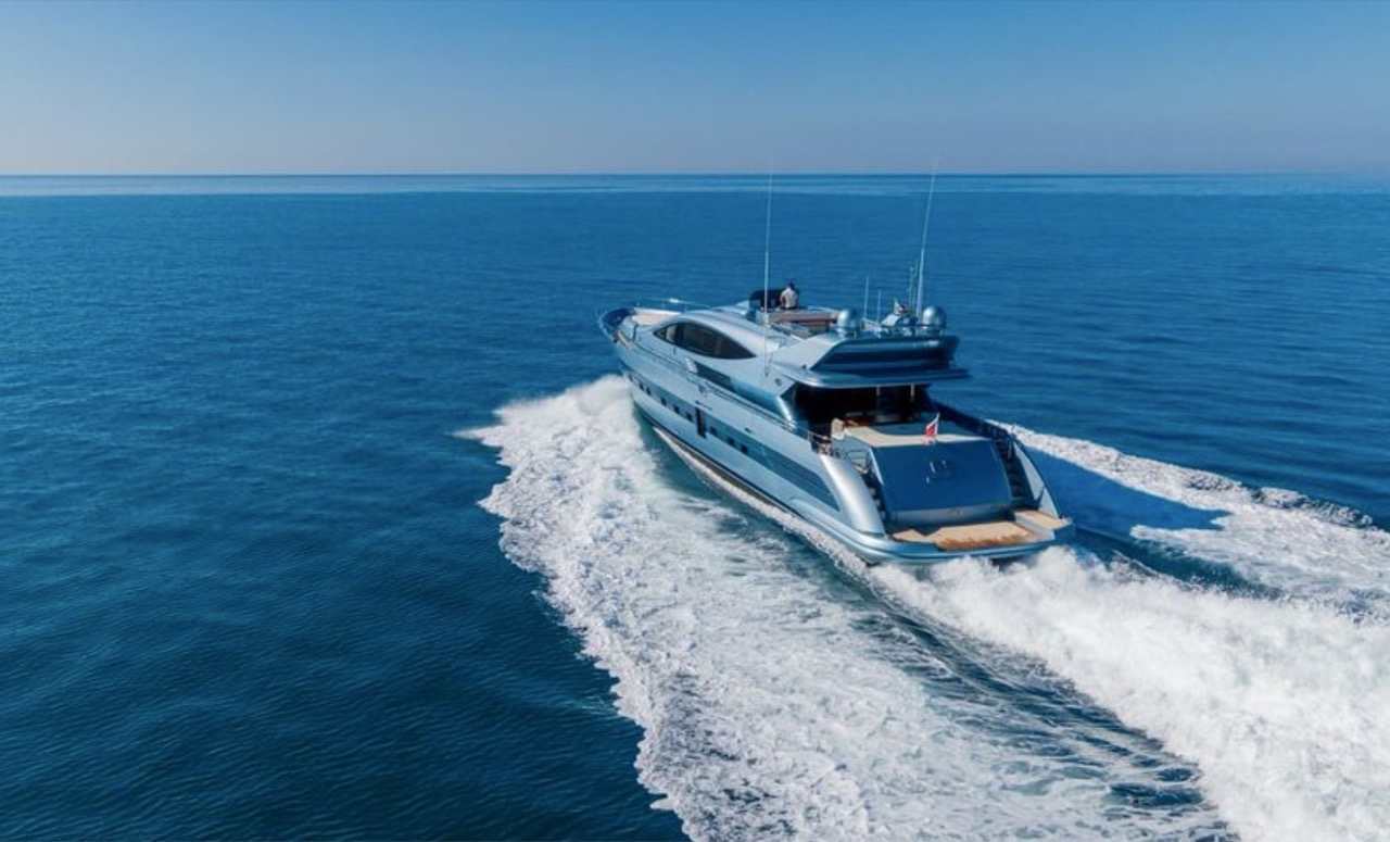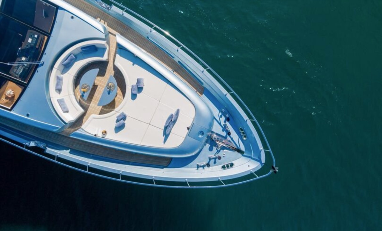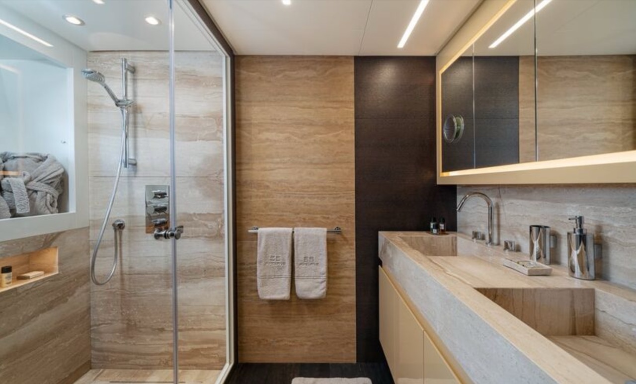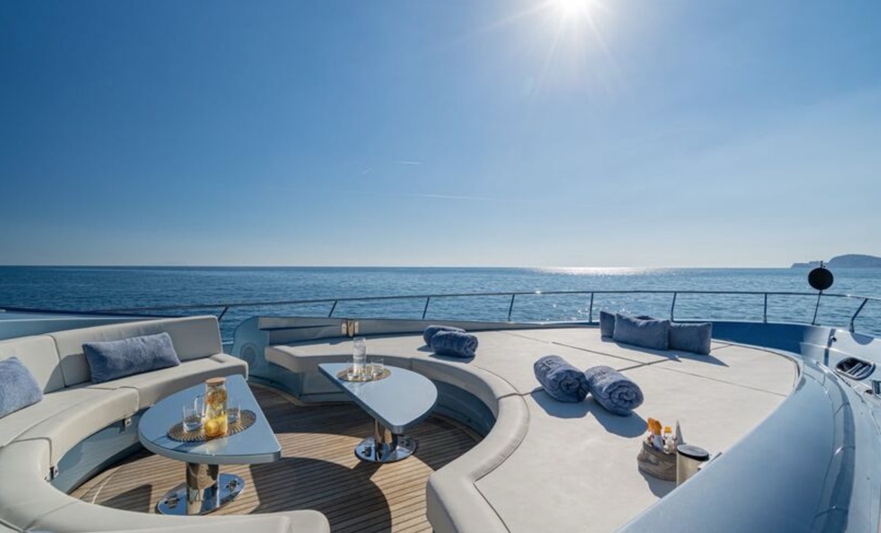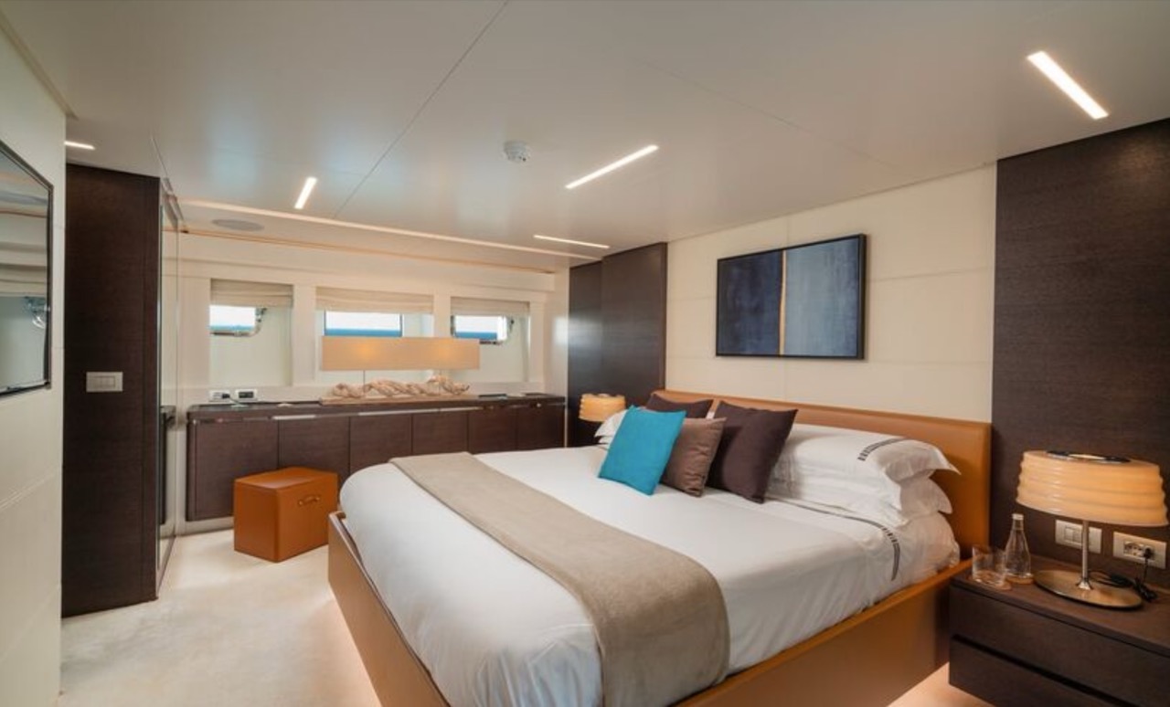 She enhances all the winning features of the line it belongs to, combining wisely the comforts of the flying bridge with the sportiness and speed of large open yachts. The spacious salon features a large sofa with a light shade fabric and an internal dining table. The extremely flexible flybridge has an outdoor table and a large sunbathing area. A shading tent is provided throughout the flybridge. At the stern, there is a dining/relaxation area with a folding television, a barbecue, a fridge, and a large sunbathing area. At the bow, there is a large sunbathing area with a wide round sofa. The yacht can accommodate up to 9 guests in 4 cabins, including 1 Master, 1 VIP, and 2 Twin with separate beds and pullman beds. All with en-suites. Bathrooms are made of marble. Thanks to the Seakeeper gyroscopic stabilizer, the yacht offers unique comfort when at anchor or cruising. The crew of 55 FIFTYFIVE is composed of 4 people, all experienced and highly professional. She is equipped with Starlink high-speed internet.