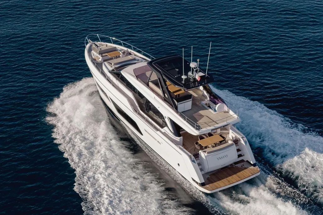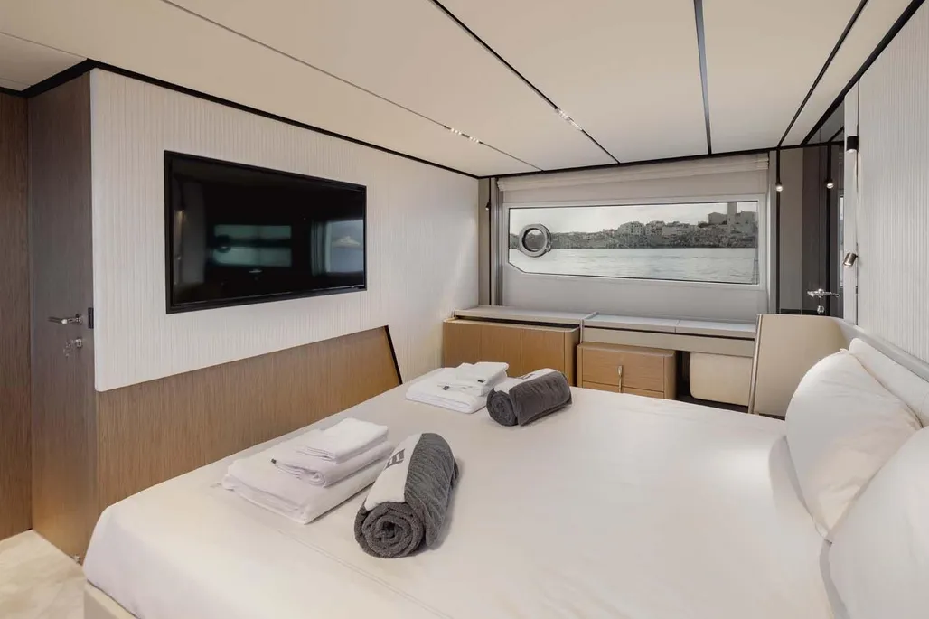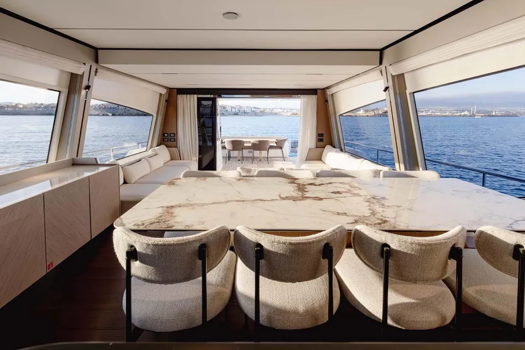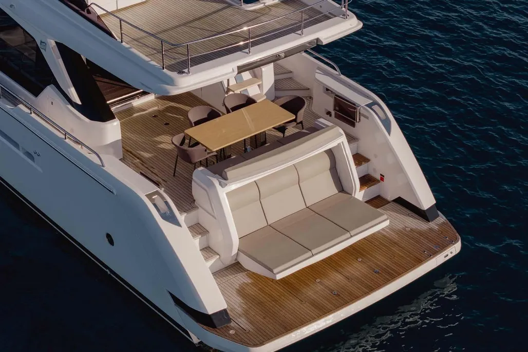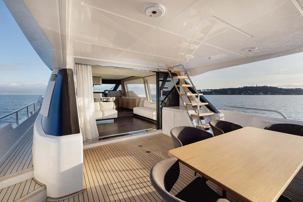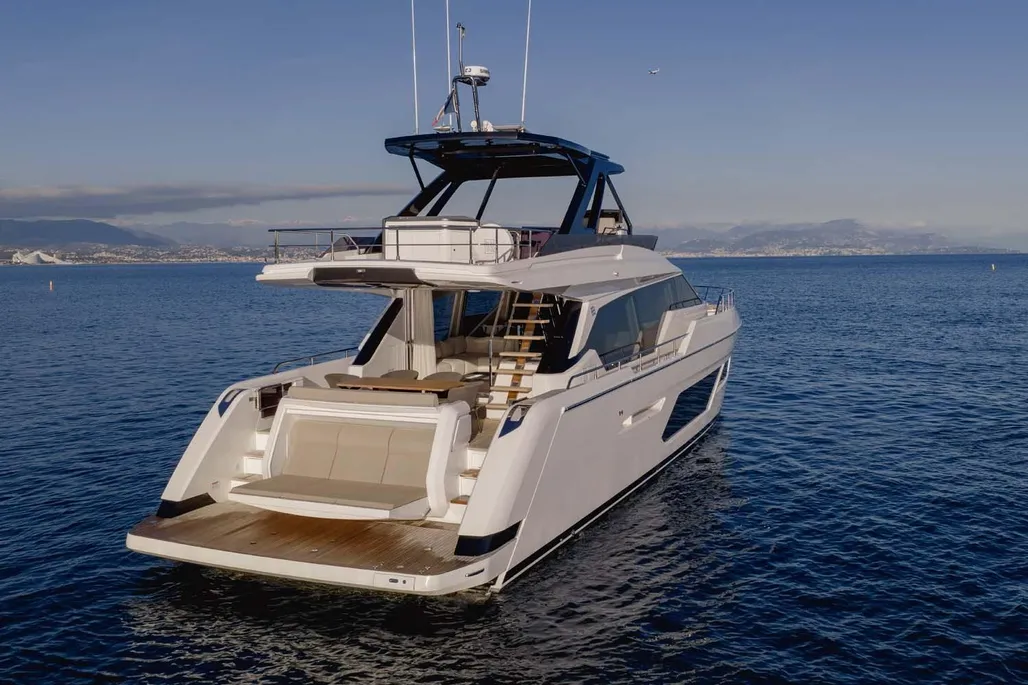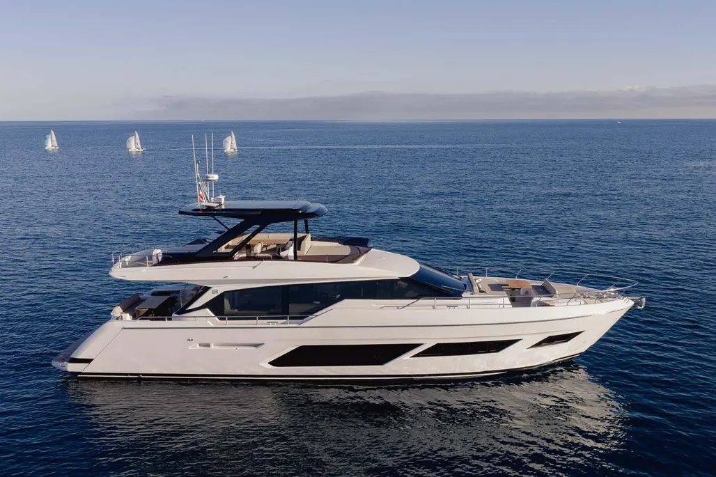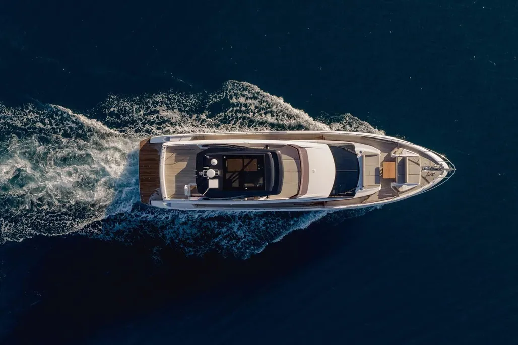 This next-generation flybridge yacht, measuring 22.5 meters in length with a beam of approximately 5.6 meters, has been designed to offer bright, flowing, and perfectly distributed spaces, both indoors and outdoors. Her exterior lines are sleek and dynamic, while the interiors reflect a sophisticated and understated elegance, fully in line with Ferretti’s unmistakable style. The main deck is designed to ensure maximum comfort, featuring welcoming living spaces, premium finishes, and a layout that enhances natural light throughout the yacht. The saloon, dining area, helm station, and galley are harmoniously integrated to create an atmosphere that is both luxurious and highly functional. Outdoor areas, from the flybridge to the aft deck and the foredeck sunbathing area, are ideal for enjoying the sea in total relaxation, whether for social moments, sunset aperitifs, or full days of cruising in complete comfort. Below deck, the Ferretti 720 can accommodate up to 8 guests in 4 elegant cabins, each designed to ensure privacy and comfort during extended stays on board. From a technical perspective, the yacht is powered by MAN engines, delivering impressive performance, with a top speed of up to approximately 28 knots and a cruising speed of around 24 knots in the more powerful configuration. The result is a smooth, stable, and efficient navigation experience, supported by advanced technology and a design philosophy focused on absolute well-being at sea.