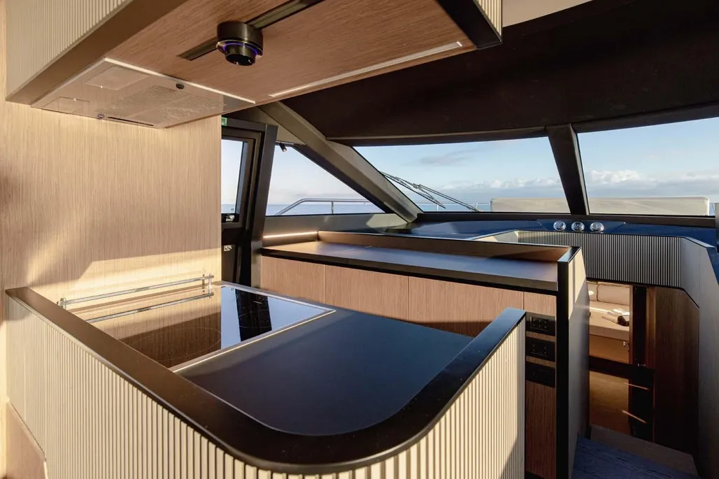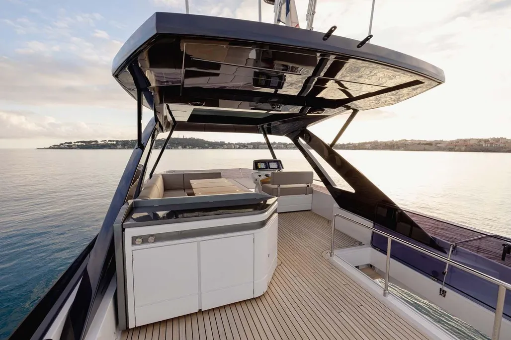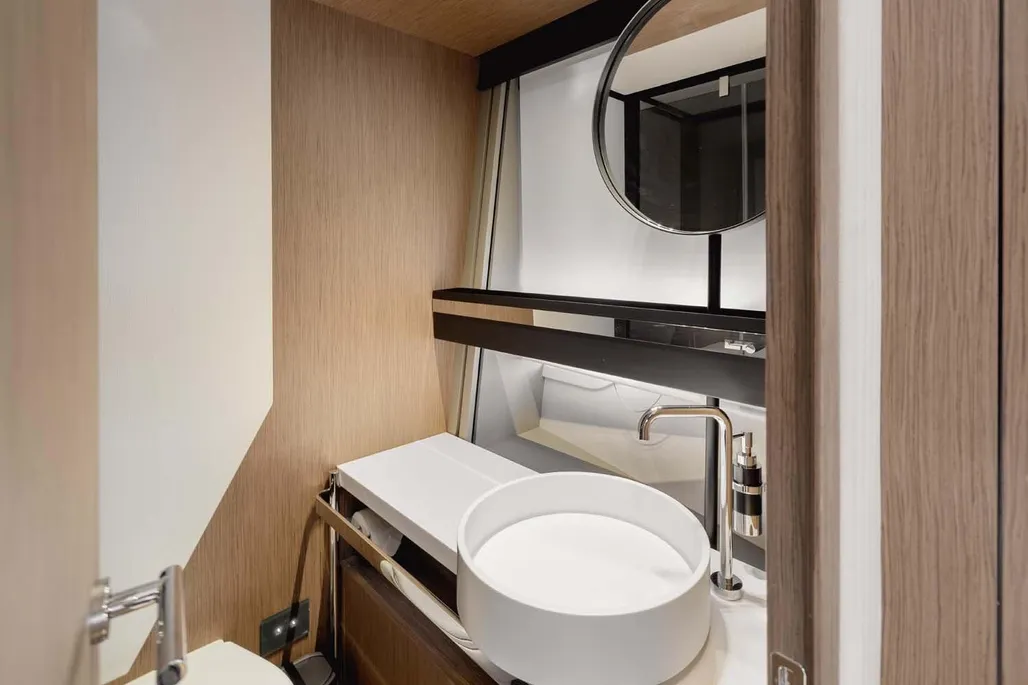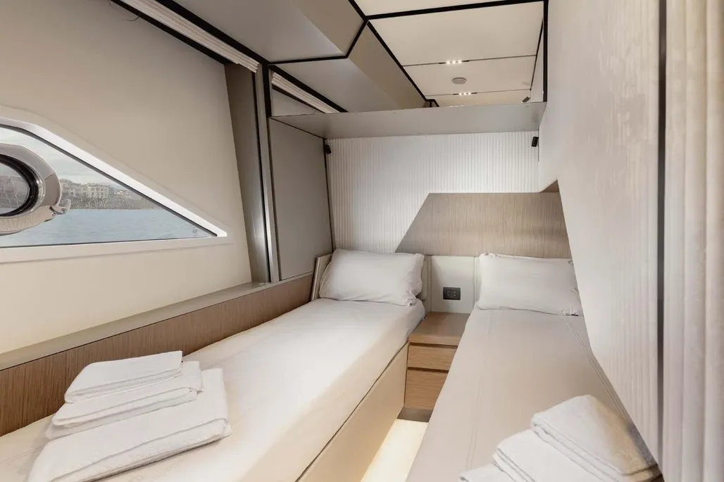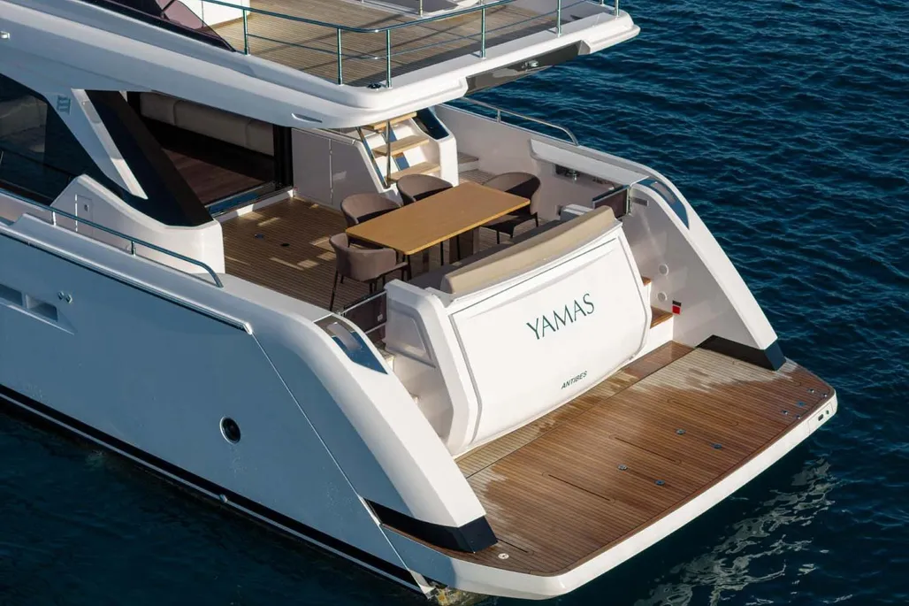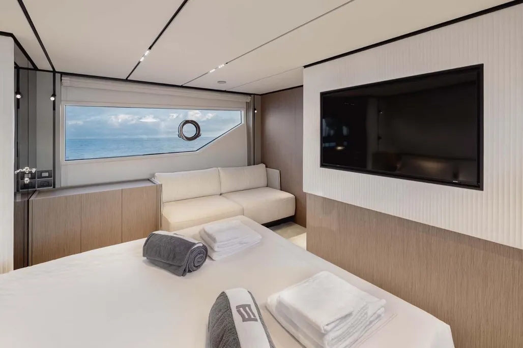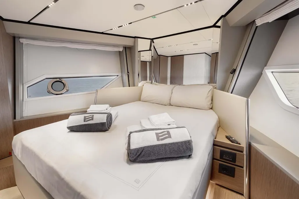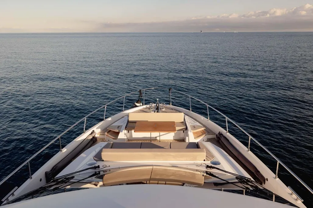 This next-generation flybridge yacht, measuring 22.5 meters in length with a beam of approximately 5.6 meters, has been designed to offer bright, flowing, and perfectly distributed spaces, both indoors and outdoors. Her exterior lines are sleek and dynamic, while the interiors reflect a sophisticated and understated elegance, fully in line with Ferretti’s unmistakable style. The main deck is designed to ensure maximum comfort, featuring welcoming living spaces, premium finishes, and a layout that enhances natural light throughout the yacht. The saloon, dining area, helm station, and galley are harmoniously integrated to create an atmosphere that is both luxurious and highly functional. Outdoor areas, from the flybridge to the aft deck and the foredeck sunbathing area, are ideal for enjoying the sea in total relaxation, whether for social moments, sunset aperitifs, or full days of cruising in complete comfort. Below deck, the Ferretti 720 can accommodate up to 8 guests in 4 elegant cabins, each designed to ensure privacy and comfort during extended stays on board. From a technical perspective, the yacht is powered by MAN engines, delivering impressive performance, with a top speed of up to approximately 28 knots and a cruising speed of around 24 knots in the more powerful configuration. The result is a smooth, stable, and efficient navigation experience, supported by advanced technology and a design philosophy focused on absolute well-being at sea.
