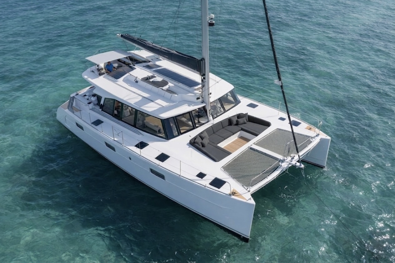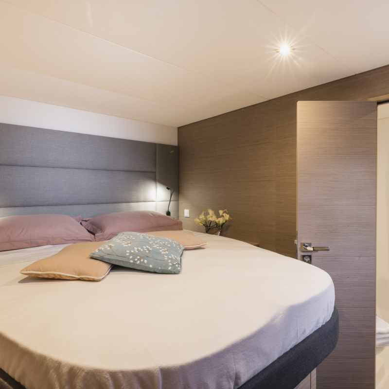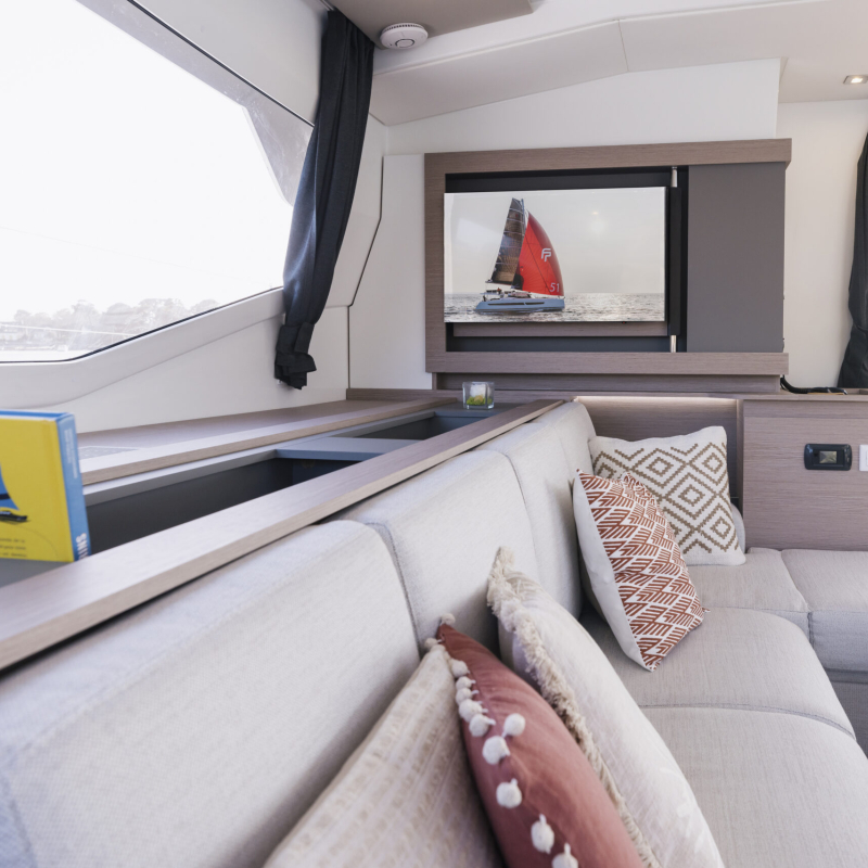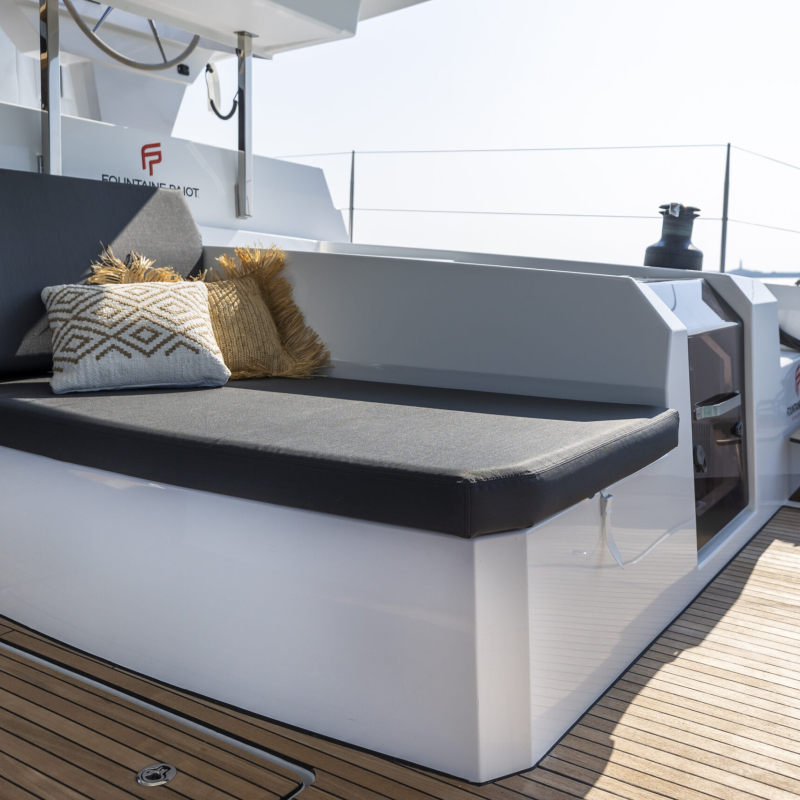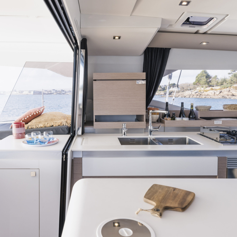 Its completely reimagined deck layout introduces a more fluid and intuitive circulation, enhancing comfort and ease of movement throughout the yacht. This new design marks a significant step forward for Aura 51, offering greater openness and connection between spaces. One of the standout features is the full opening between the saloon and the cockpit. An elegant innovation that seamlessly connects indoor and outdoor living. This creates a natural flow between the galley and the spacious cockpit dining area, elevating both functionality and social experience on board. The result is an exceptional feeling of freedom, light, and volume.
