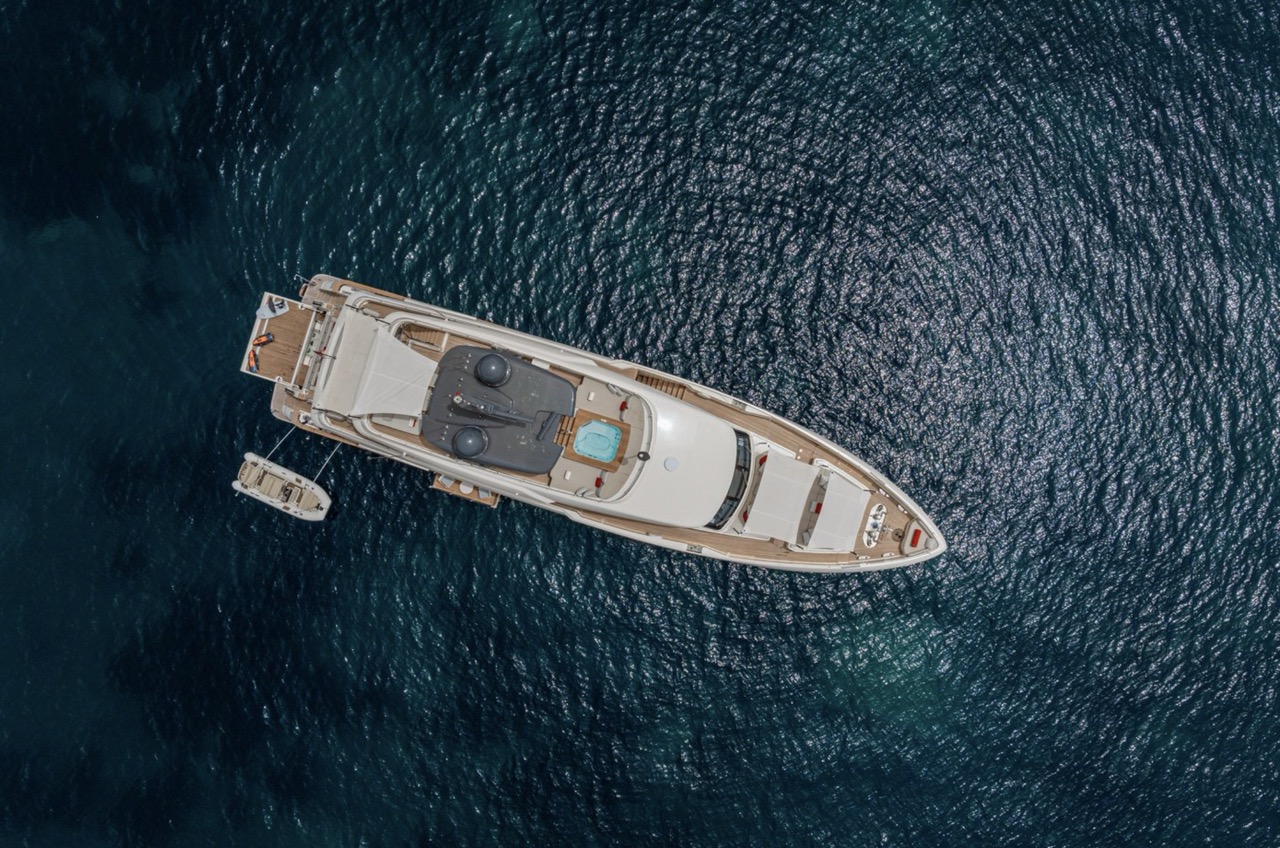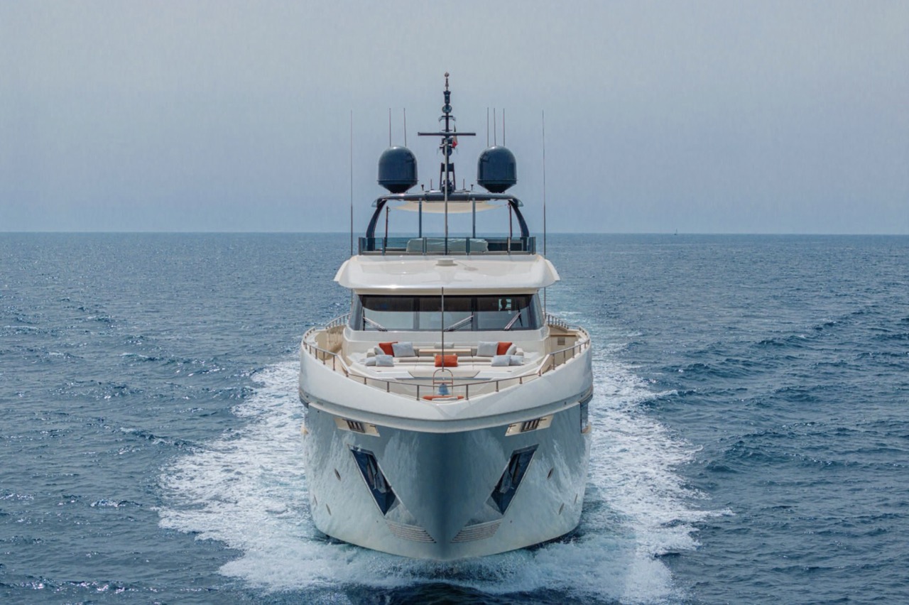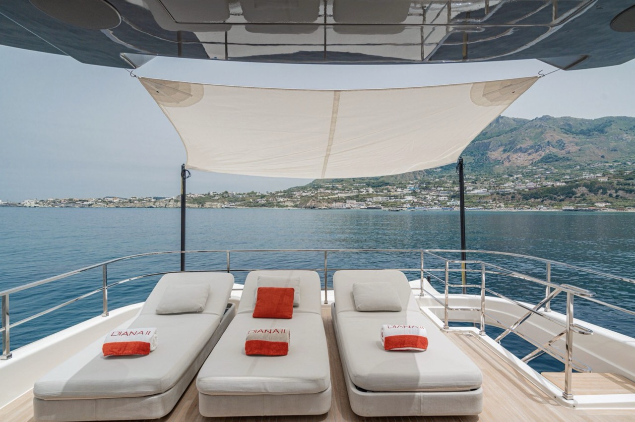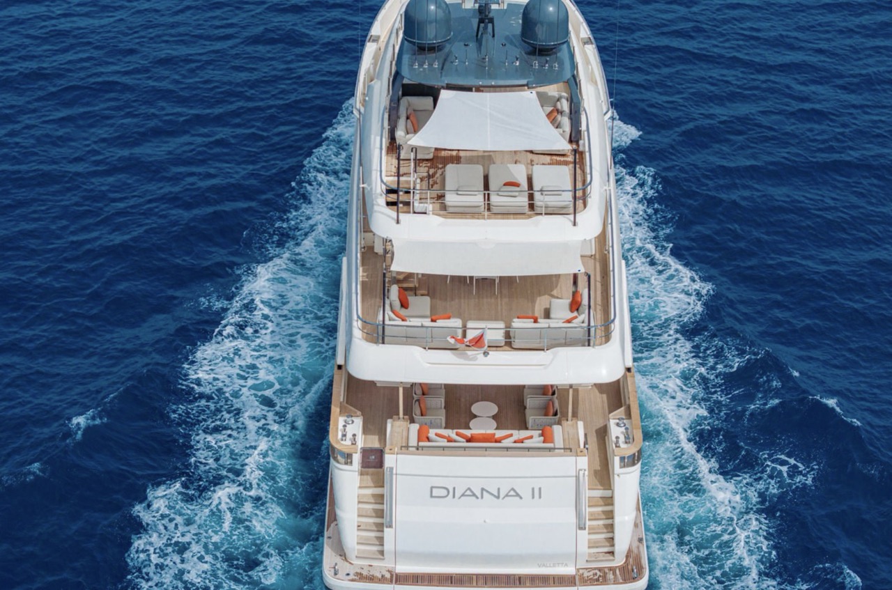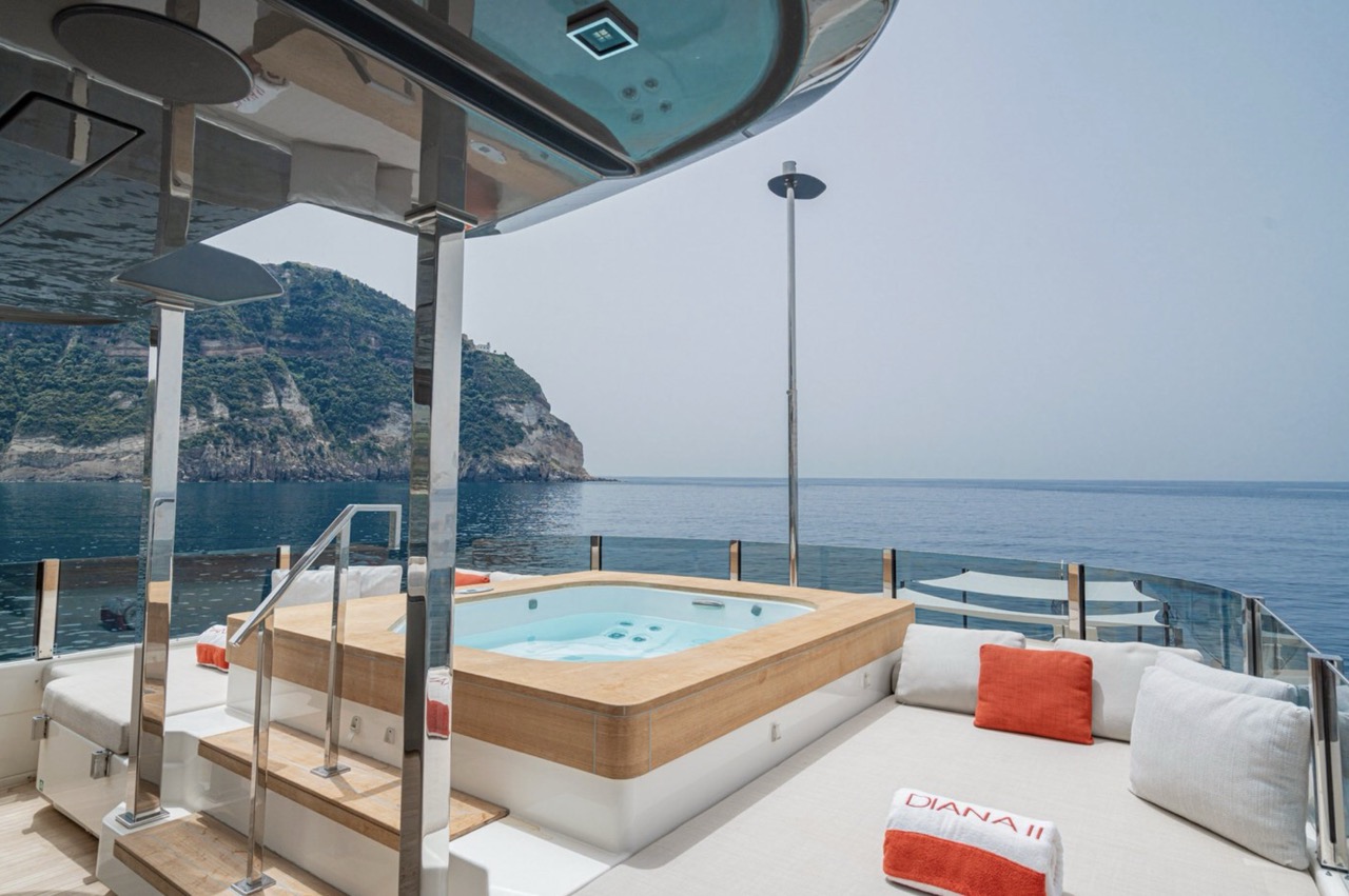33 DIANA II is a luminous equilibrium of beauty that glides over the water. She offers expansive exterior spaces and a bulbous bow that ensures best-in-class stability. To guarantee maximum comfort in all conditions, DIANA II is equipped with two gyro stabilizers and aerodynamic fins that work seamlessly both underway and at zero speed. This dual system eliminates roll, whether you are cruising at top speed or relaxing at anchor in a quiet bay. Accommodating up to 11 guests, the yacht features 5 spacious en-suite cabins: a Master suite on the main deck, 3 double cabins, and 1 twin cabin (one with a Pullman) on the lower deck. The sun deck features a Jacuzzi and sun loungers aft, with a shaded central area furnished with sofas and a coffee table. The upper deck offers complete privacy and provides al fresco dining around a large table. Additionally, guests can relax on the comfortable seating areas at the bow or stern. Inside, the main salon offers ample lounge space and abundant natural light. DIANA II includes a large swim platform for easy access to the water, stabilizers, and a wide array of water toys. An experienced crew of 6 ensures a seamless yachting experience. She is equipped with Starlink high-speed internet.