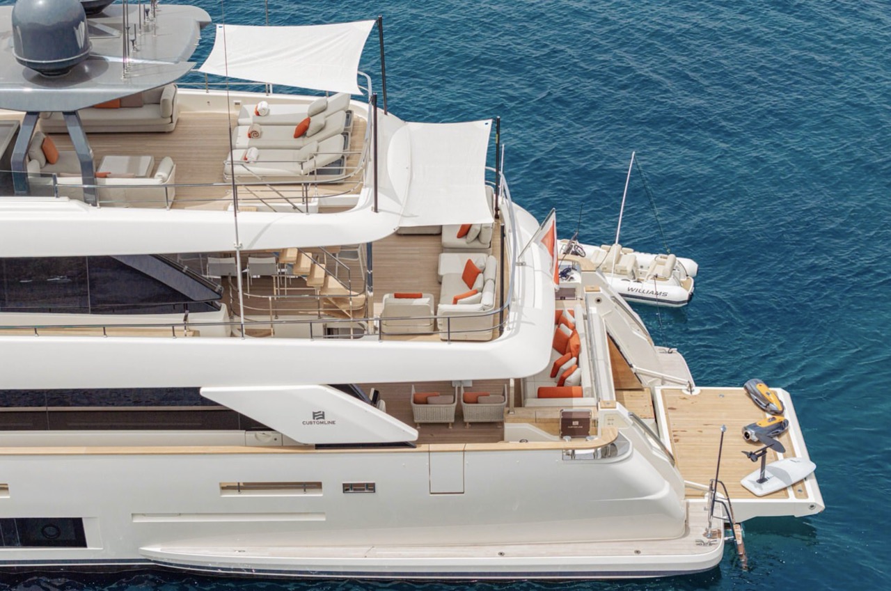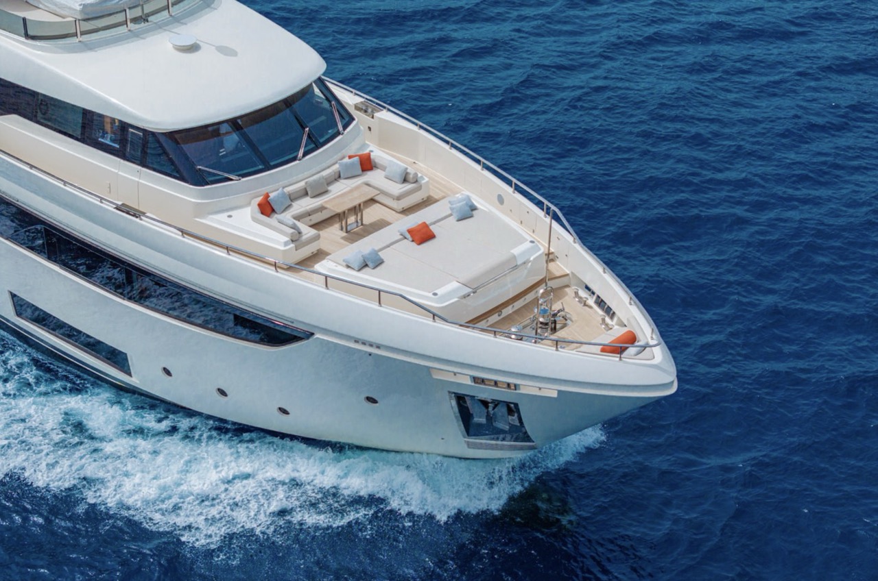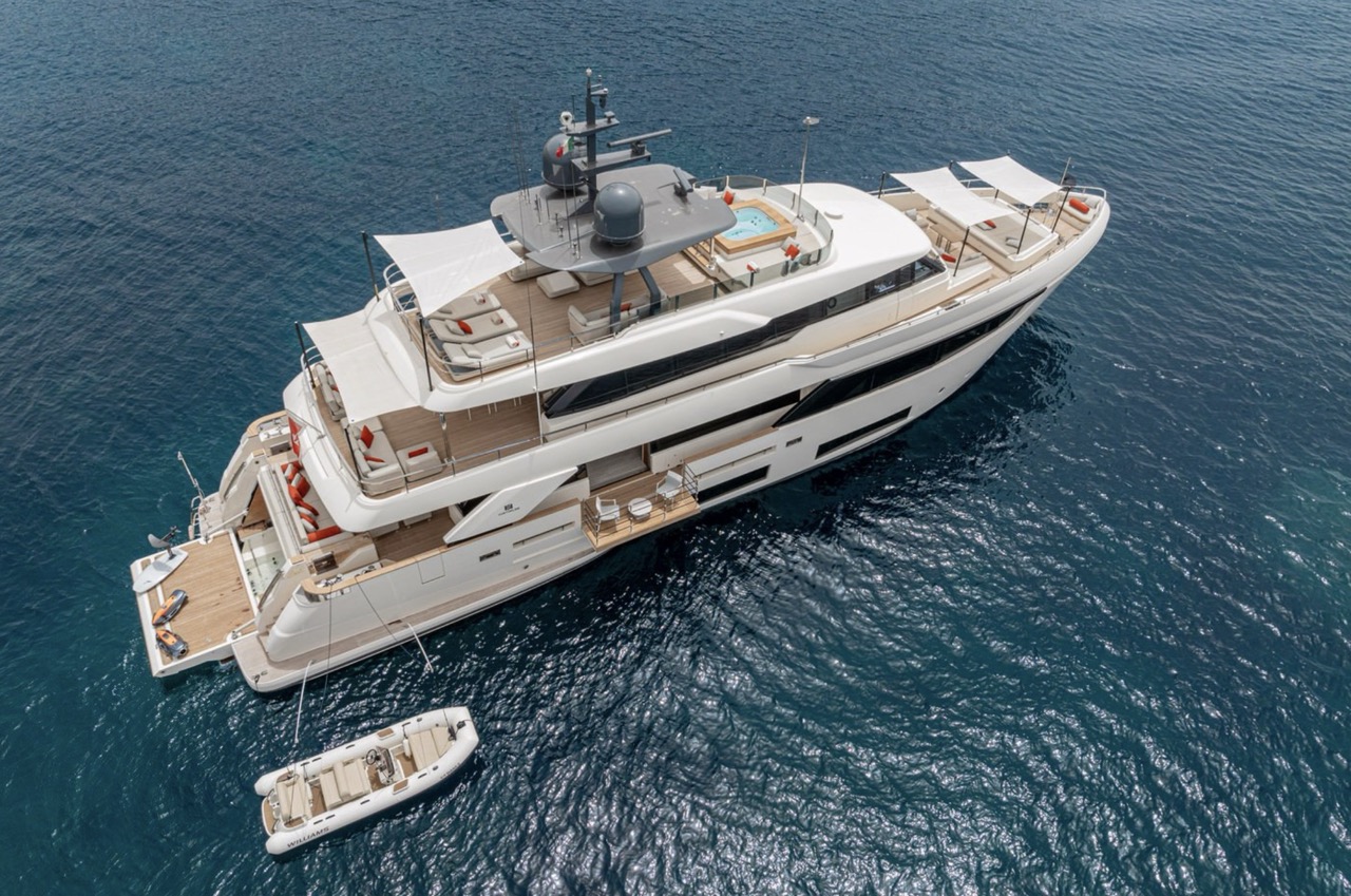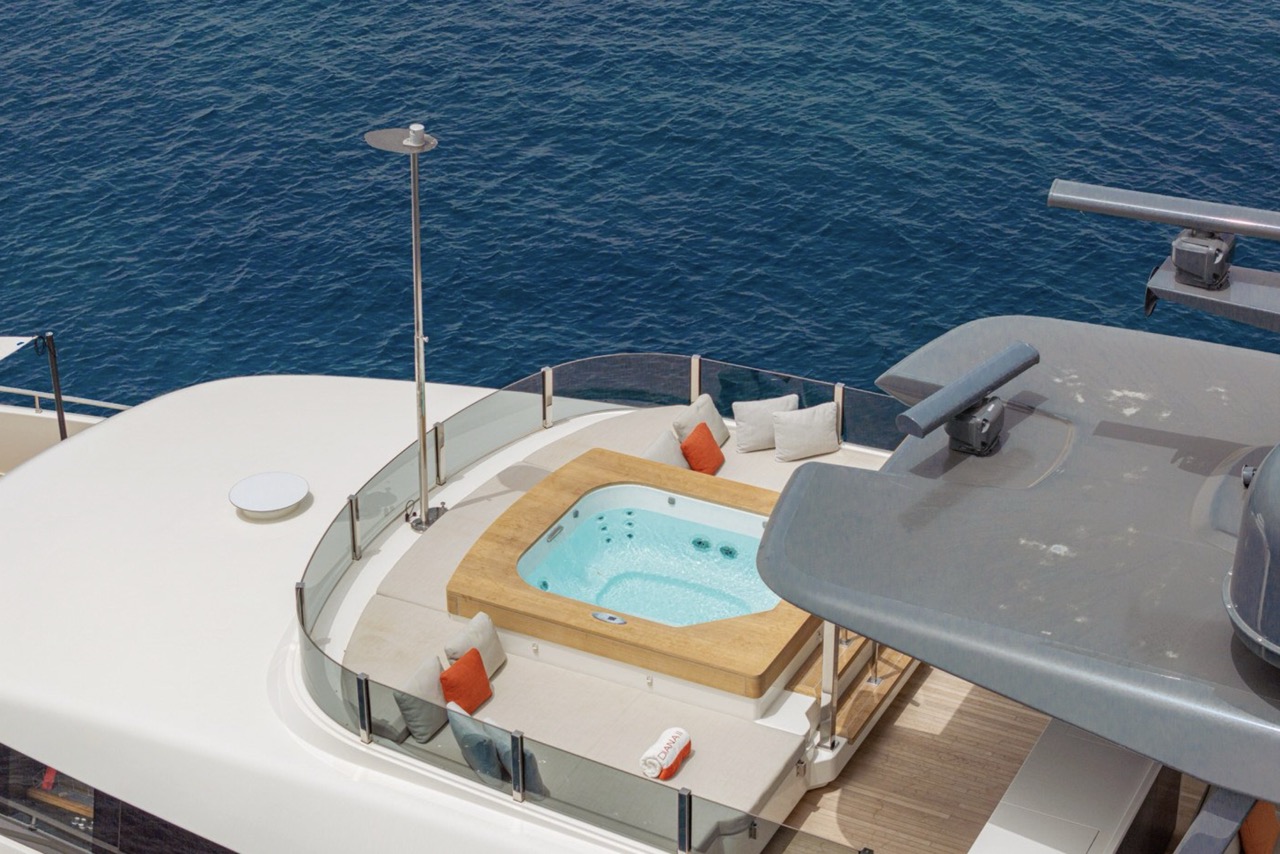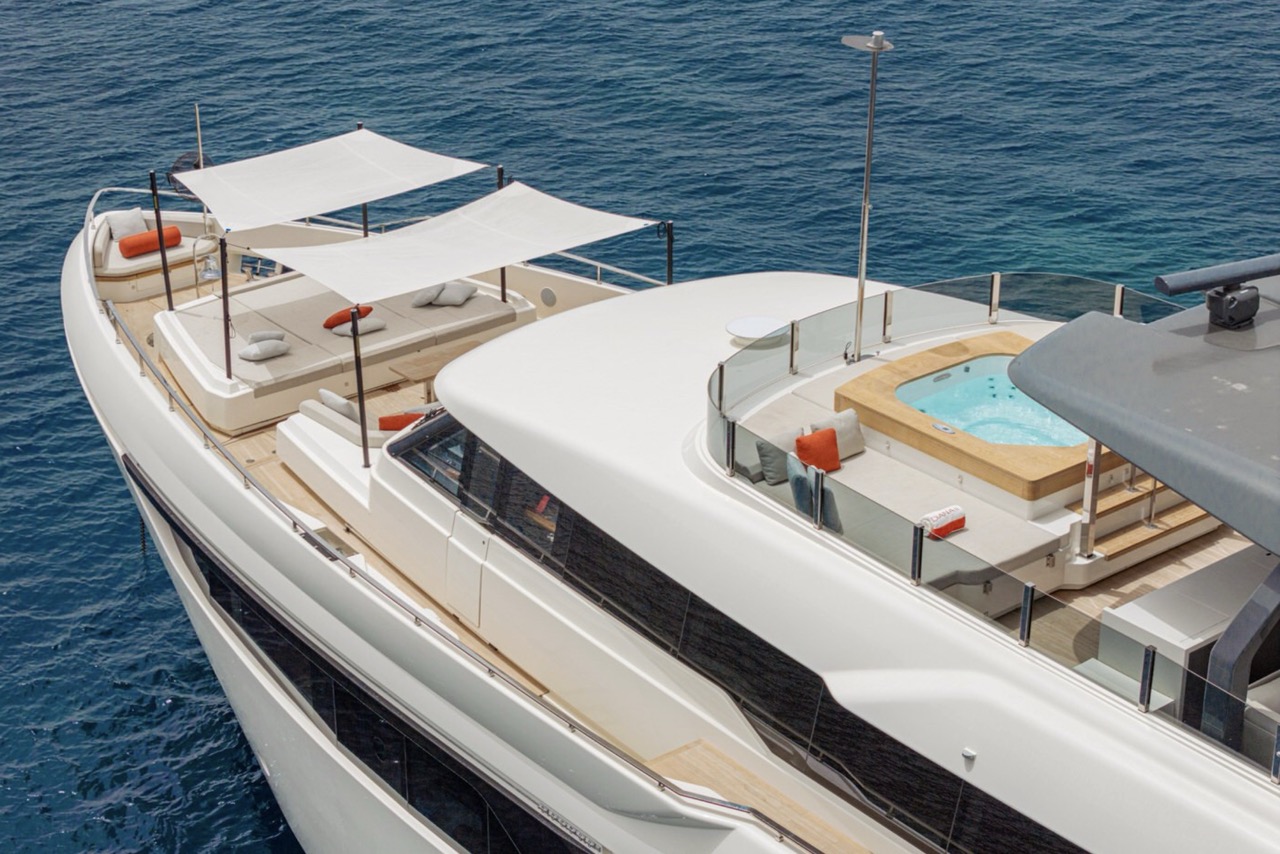 33 DIANA II is a luminous equilibrium of beauty that glides over the water. She offers expansive exterior spaces and a bulbous bow that ensures best-in-class stability. To guarantee maximum comfort in all conditions, DIANA II is equipped with two gyro stabilizers and aerodynamic fins that work seamlessly both underway and at zero speed. This dual system eliminates roll, whether you are cruising at top speed or relaxing at anchor in a quiet bay. Accommodating up to 11 guests, the yacht features 5 spacious en-suite cabins: a Master suite on the main deck, 3 double cabins, and 1 twin cabin (one with a Pullman) on the lower deck. The sun deck features a Jacuzzi and sun loungers aft, with a shaded central area furnished with sofas and a coffee table. The upper deck offers complete privacy and provides al fresco dining around a large table. Additionally, guests can relax on the comfortable seating areas at the bow or stern. Inside, the main salon offers ample lounge space and abundant natural light. DIANA II includes a large swim platform for easy access to the water, stabilizers, and a wide array of water toys. An experienced crew of 6 ensures a seamless yachting experience. She is equipped with Starlink high-speed internet.