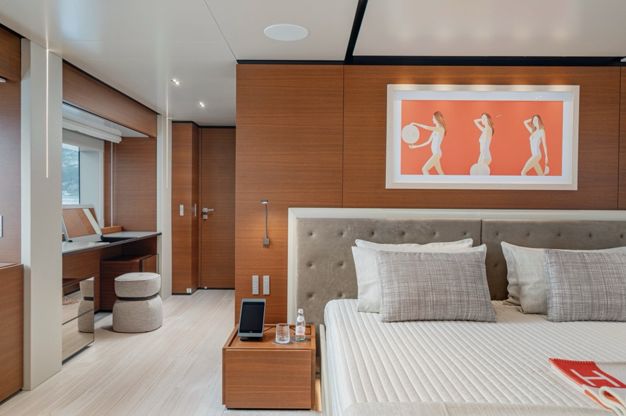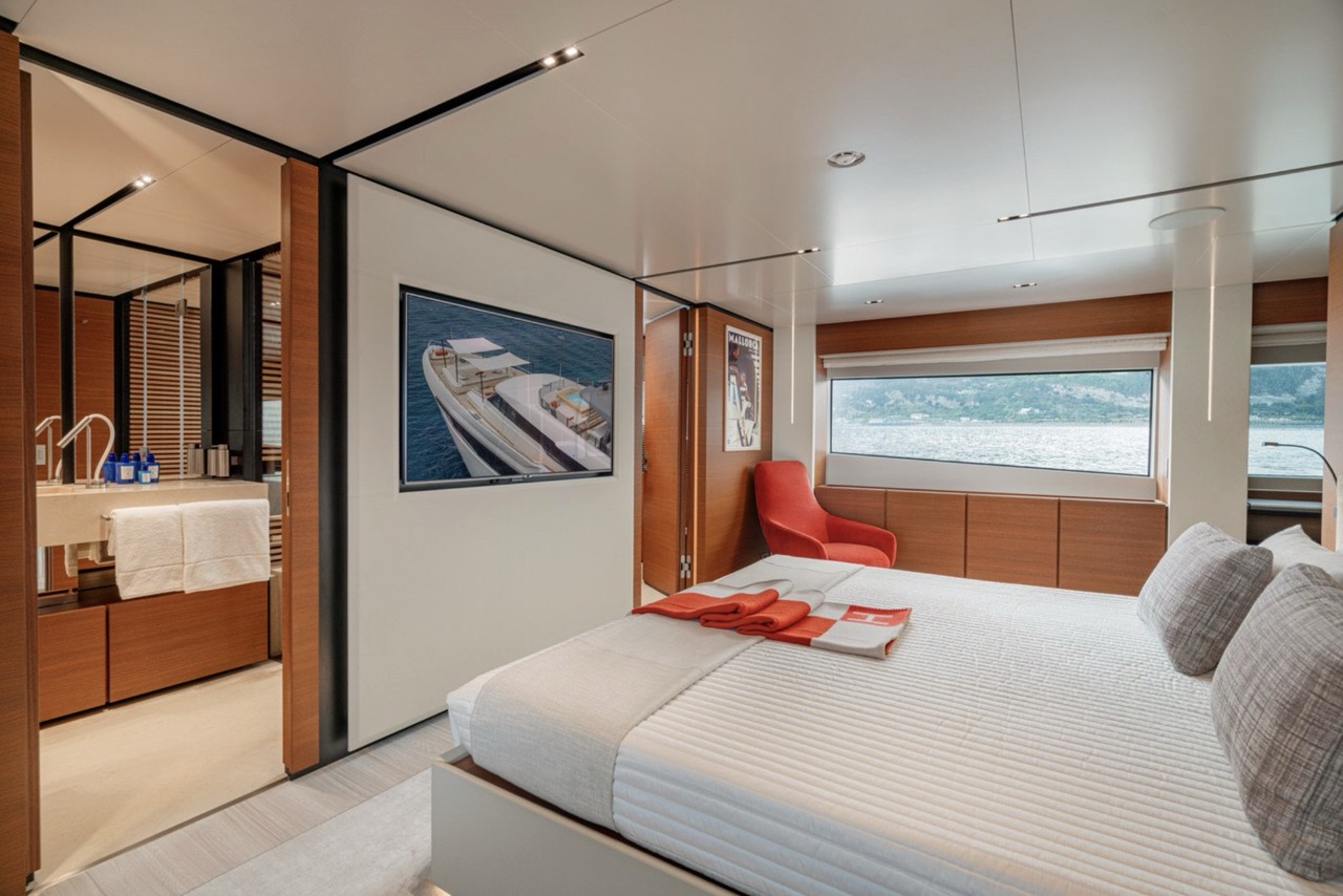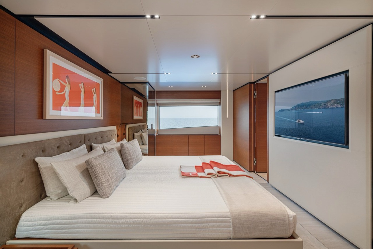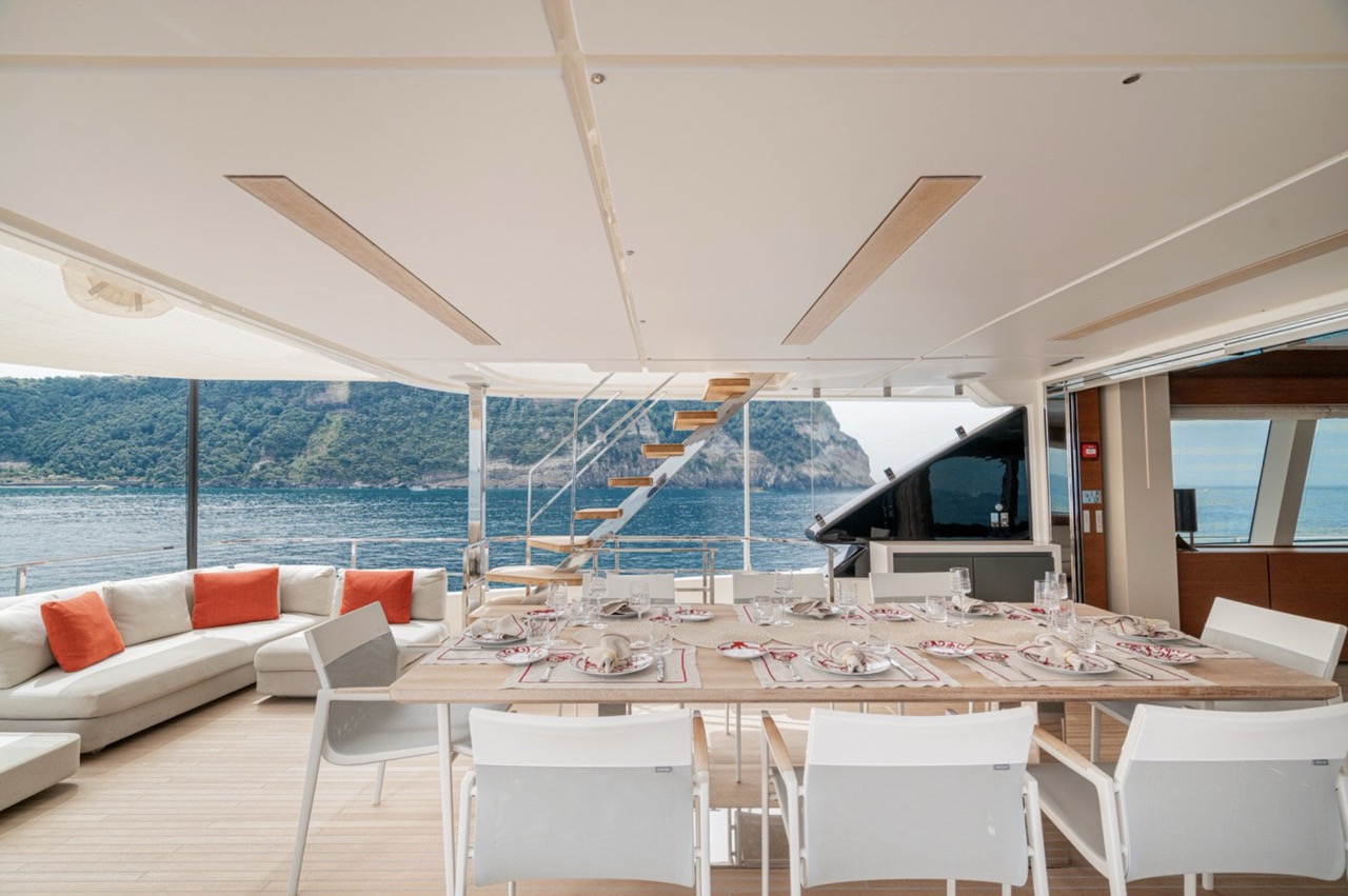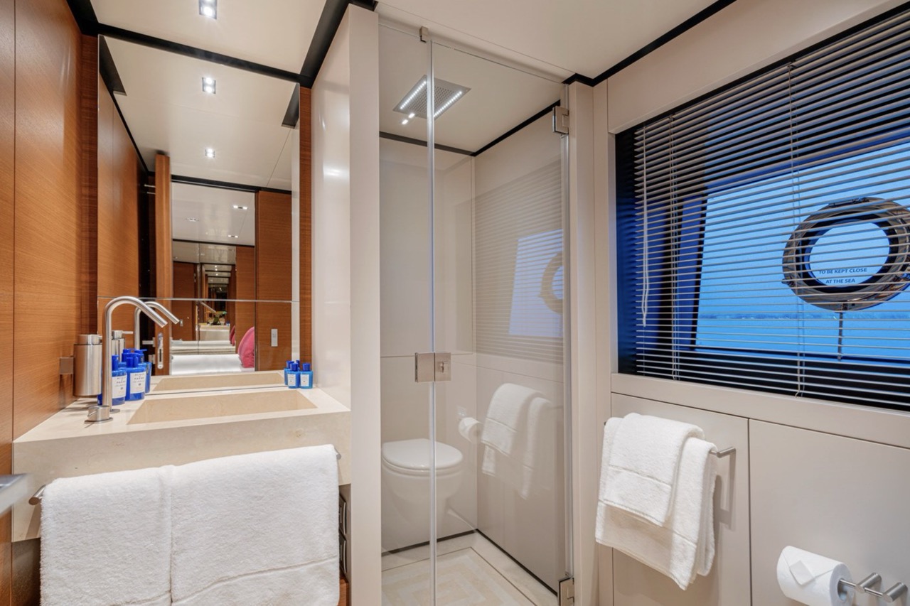 33 DIANA II is a luminous equilibrium of beauty that glides over the water. She offers expansive exterior spaces and a bulbous bow that ensures best-in-class stability. To guarantee maximum comfort in all conditions, DIANA II is equipped with two gyro stabilizers and aerodynamic fins that work seamlessly both underway and at zero speed. This dual system eliminates roll, whether you are cruising at top speed or relaxing at anchor in a quiet bay. Accommodating up to 11 guests, the yacht features 5 spacious en-suite cabins: a Master suite on the main deck, 3 double cabins, and 1 twin cabin (one with a Pullman) on the lower deck. The sun deck features a Jacuzzi and sun loungers aft, with a shaded central area furnished with sofas and a coffee table. The upper deck offers complete privacy and provides al fresco dining around a large table. Additionally, guests can relax on the comfortable seating areas at the bow or stern. Inside, the main salon offers ample lounge space and abundant natural light. DIANA II includes a large swim platform for easy access to the water, stabilizers, and a wide array of water toys. An experienced crew of 6 ensures a seamless yachting experience. She is equipped with Starlink high-speed internet.