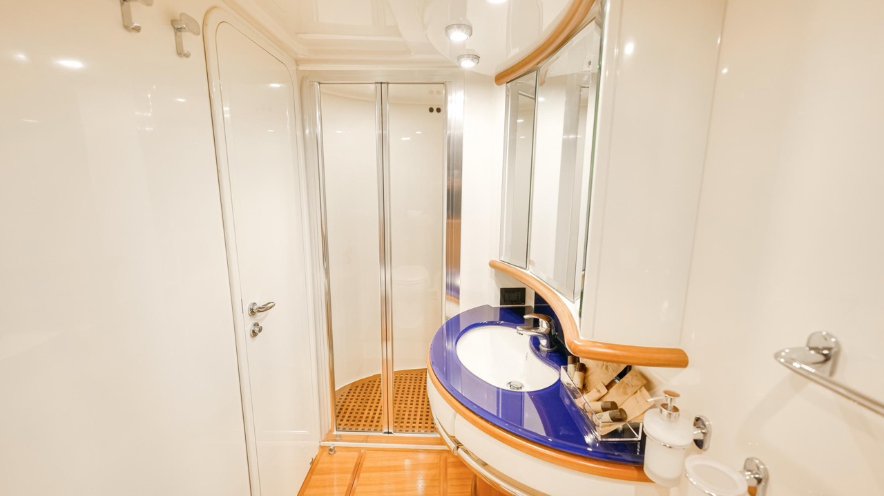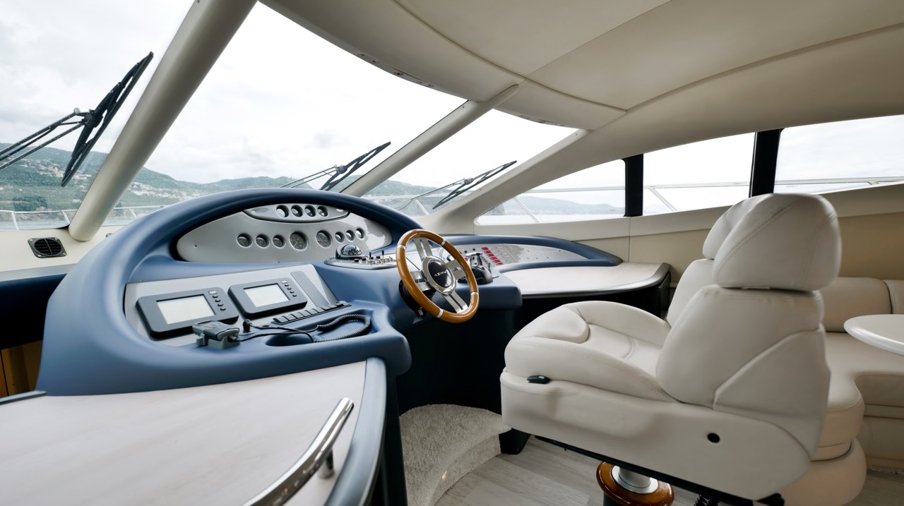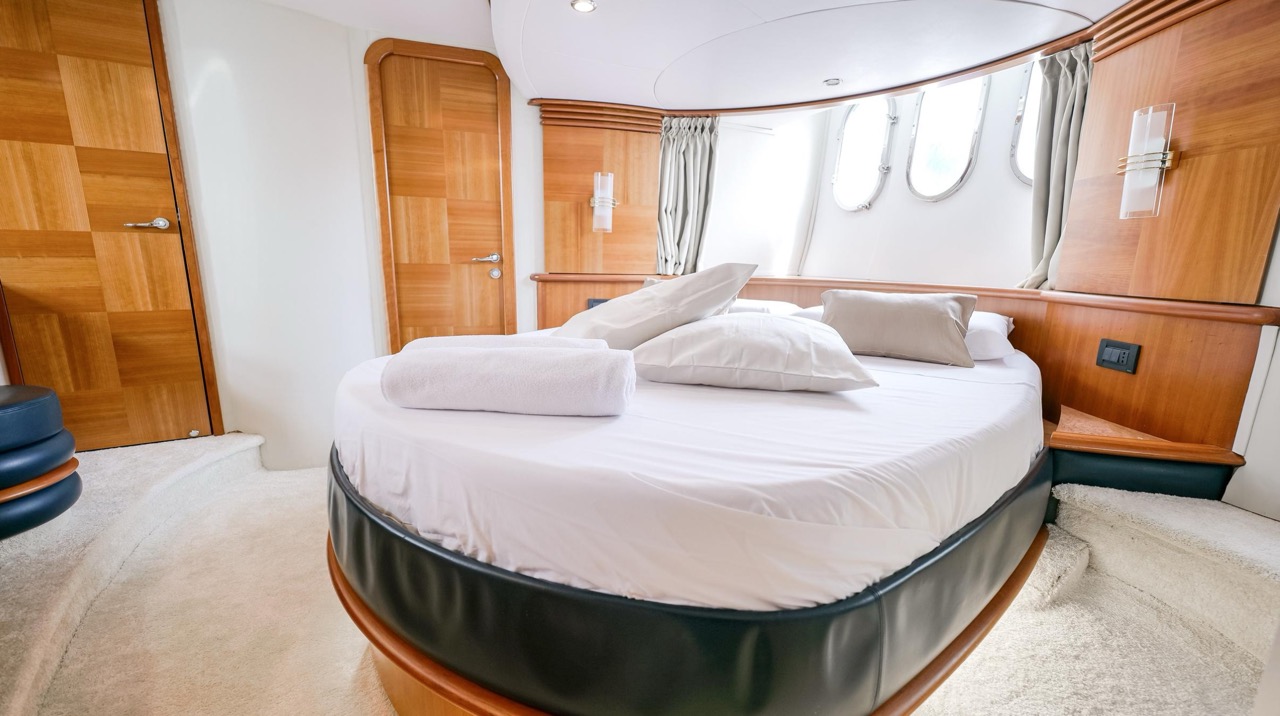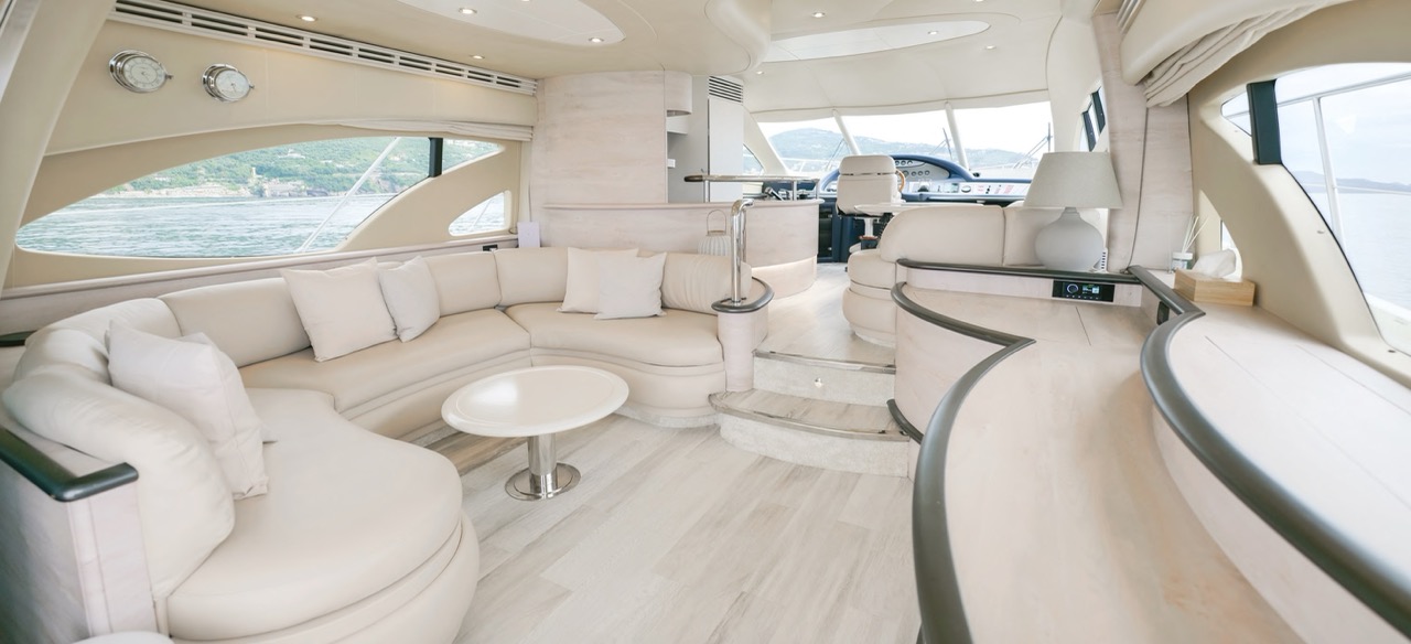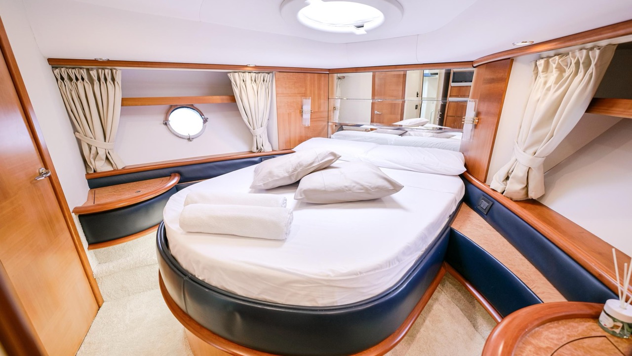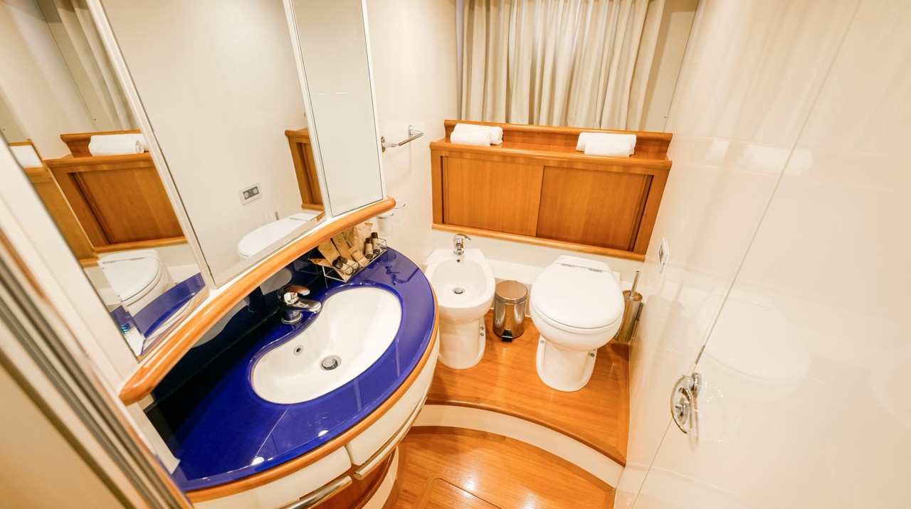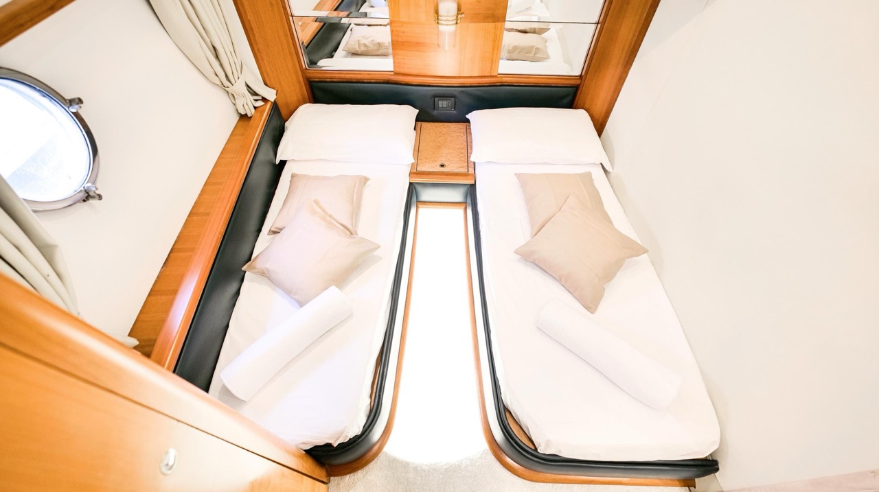 The recent refit has made the interiors of the Azimut 62 Fly exceptionally modern and fully optimized for onboard living. At the owner’s request, the furniture has been refinished in a lighter tone, complemented by new flooring and fresh paintwork that brighten the atmosphere throughout the cabins and main deck. Every detail has been carefully curated to create an inviting, serene, and contemporary environment. The layout of the main floor is designed to maximize natural light, enhancing the sense of openness. Upon entering, a spacious lounge area features a comfortable light-upholstered sofa paired with a stylish coffee table. Moving forward, the elevated dinette area houses the fully equipped galley complete with dishwasher, refrigerator, grill, ice maker, and additional appliances. A beautifully curved bar-style counter serves as both a practical workspace and a serving hatch. The dining area offers remarkable versatility, with a modular table that folds completely flat when not in use and can comfortably seat up to eight guests. Completing the living space is a plush C-shaped leather sofa that surrounds the dining table, perfect for relaxing or entertaining. The cockpit is designed for effortless outdoor living, featuring comfortable seating and a teak Calligaris dining table, ideal for enjoying meals at anchor. Shaded by the flybridge and finished with teak decking, it serves as a welcoming exterior lounge. Above, the flybridge offers generous space, equipped with a centrally mounted raised roll bar, expansive sunbathing area, and an additional living zone with a large sofa and central table. A wet bar with refrigerator and barbecue grill is positioned just aft of the helm station to port, ensuring convenience while entertaining. The yacht offers three beautifully appointed cabins plus a dedicated crew cabin. Master Cabin (Full Beam): Features a king-size bed, vanity/desk area, compact walk-in closet, and plentiful storage for extended stays. Six large windows provide sweeping sea views. The private ensuite includes a shower with bench seating and wooden flooring, electric toilet, and bidet. VIP Cabin (Forward): Equipped with a double bed, tall wardrobes, and a private bathroom with enclosed shower. Twin Cabin (Starboard): Offers two single berths and convenient access to the guest bathroom, also fitted with a separate shower stall. All cabins are finished with light Sky-colored bulkheads and ceilings, while the floors feature light carpeting. Bathrooms are accented with wooden flooring, and the main corridors boast a modern, light-toned synthetic surface.