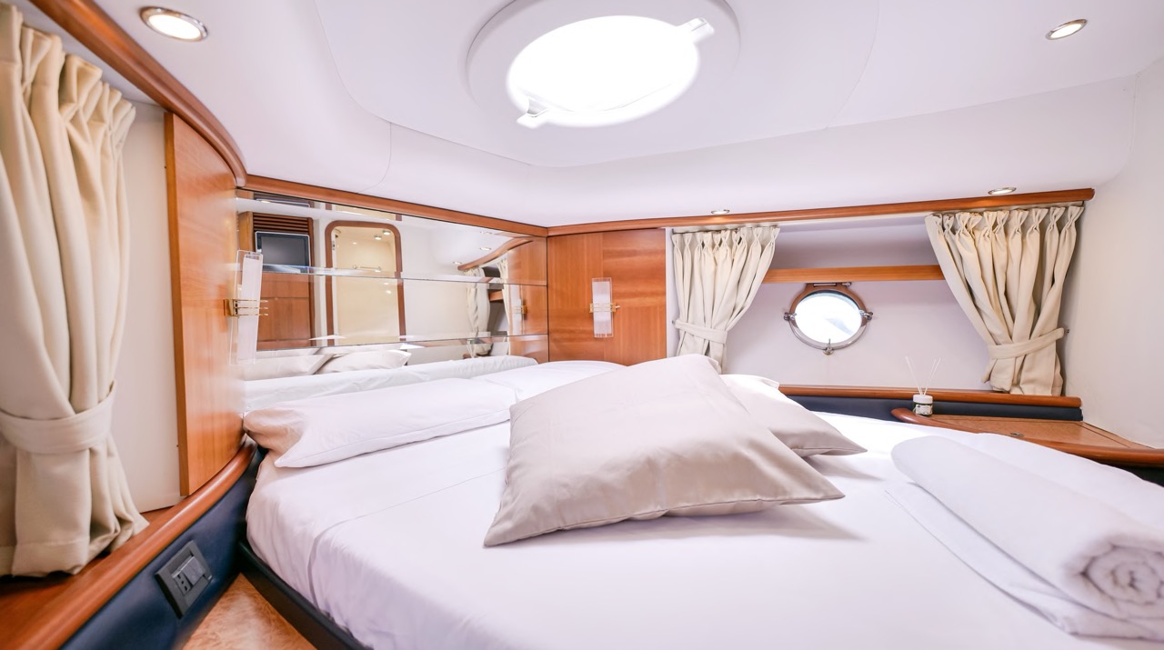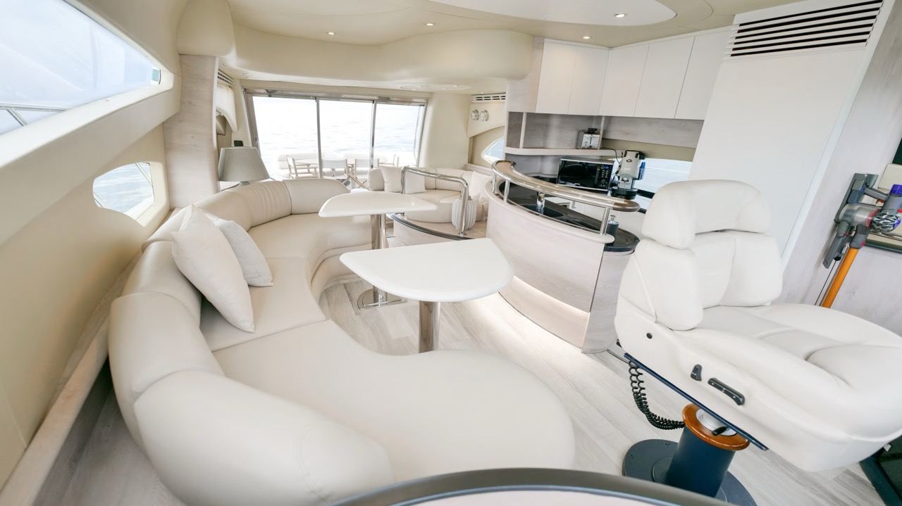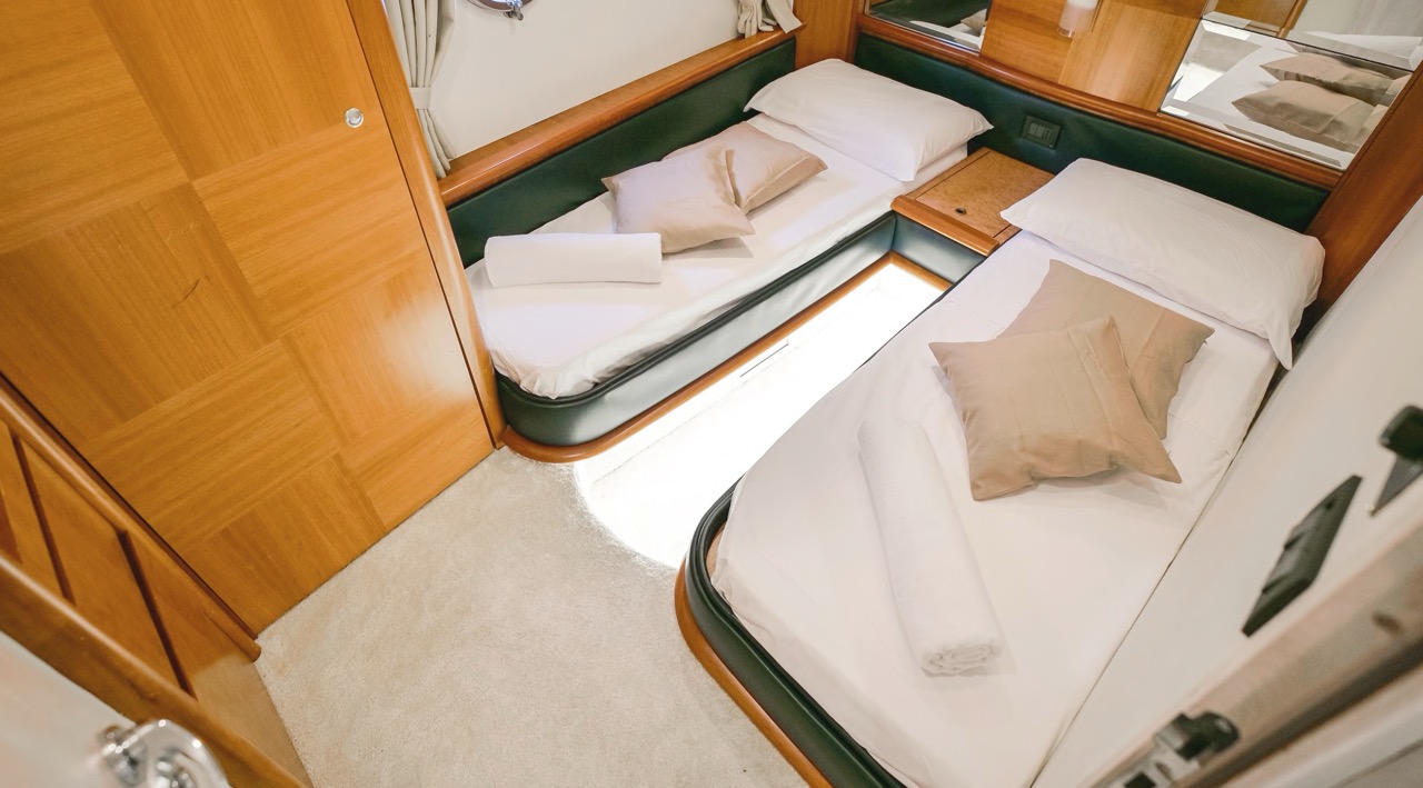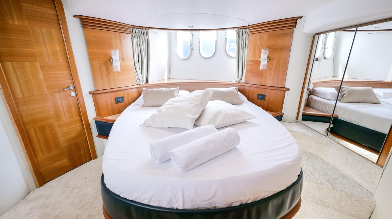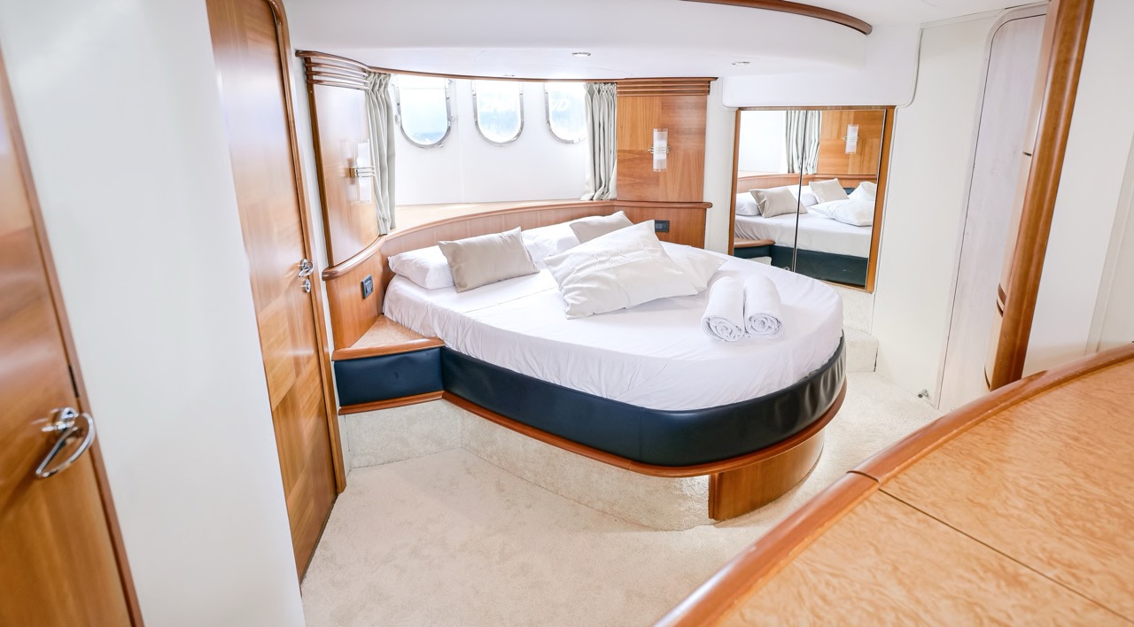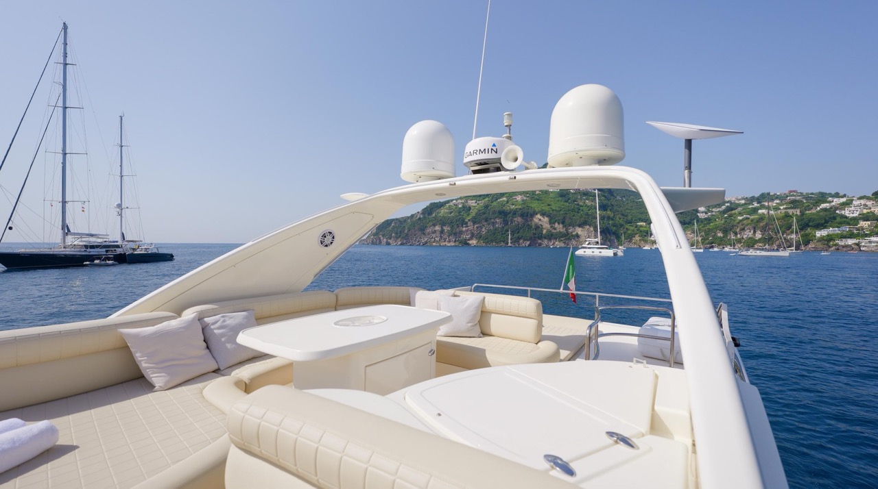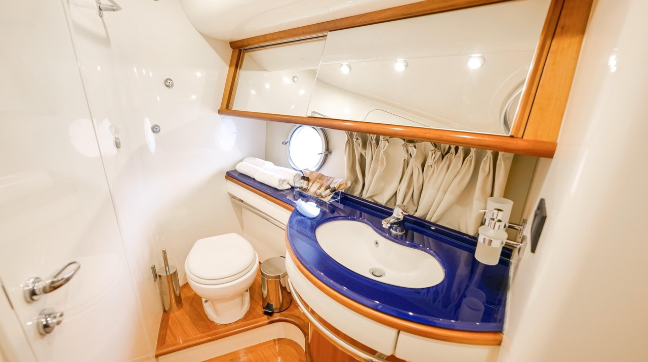 The recent refit has made the interiors of the Azimut 62 Fly exceptionally modern and fully optimized for onboard living. At the owner’s request, the furniture has been refinished in a lighter tone, complemented by new flooring and fresh paintwork that brighten the atmosphere throughout the cabins and main deck. Every detail has been carefully curated to create an inviting, serene, and contemporary environment. The layout of the main floor is designed to maximize natural light, enhancing the sense of openness. Upon entering, a spacious lounge area features a comfortable light-upholstered sofa paired with a stylish coffee table. Moving forward, the elevated dinette area houses the fully equipped galley complete with dishwasher, refrigerator, grill, ice maker, and additional appliances. A beautifully curved bar-style counter serves as both a practical workspace and a serving hatch. The dining area offers remarkable versatility, with a modular table that folds completely flat when not in use and can comfortably seat up to eight guests. Completing the living space is a plush C-shaped leather sofa that surrounds the dining table, perfect for relaxing or entertaining. The cockpit is designed for effortless outdoor living, featuring comfortable seating and a teak Calligaris dining table, ideal for enjoying meals at anchor. Shaded by the flybridge and finished with teak decking, it serves as a welcoming exterior lounge. Above, the flybridge offers generous space, equipped with a centrally mounted raised roll bar, expansive sunbathing area, and an additional living zone with a large sofa and central table. A wet bar with refrigerator and barbecue grill is positioned just aft of the helm station to port, ensuring convenience while entertaining. The yacht offers three beautifully appointed cabins plus a dedicated crew cabin. Master Cabin (Full Beam): Features a king-size bed, vanity/desk area, compact walk-in closet, and plentiful storage for extended stays. Six large windows provide sweeping sea views. The private ensuite includes a shower with bench seating and wooden flooring, electric toilet, and bidet. VIP Cabin (Forward): Equipped with a double bed, tall wardrobes, and a private bathroom with enclosed shower. Twin Cabin (Starboard): Offers two single berths and convenient access to the guest bathroom, also fitted with a separate shower stall. All cabins are finished with light Sky-colored bulkheads and ceilings, while the floors feature light carpeting. Bathrooms are accented with wooden flooring, and the main corridors boast a modern, light-toned synthetic surface.