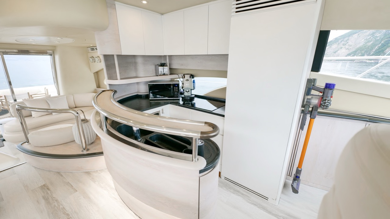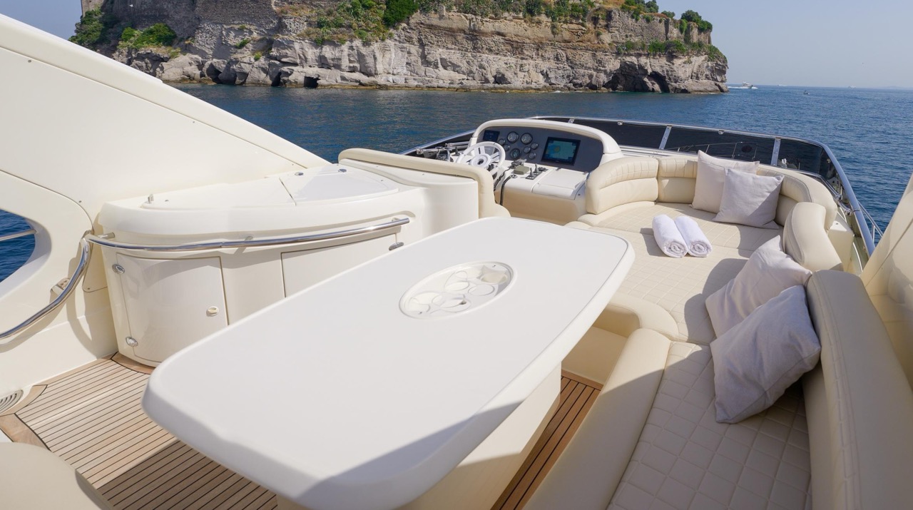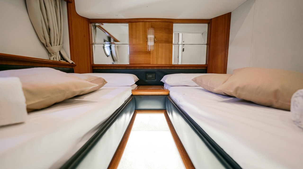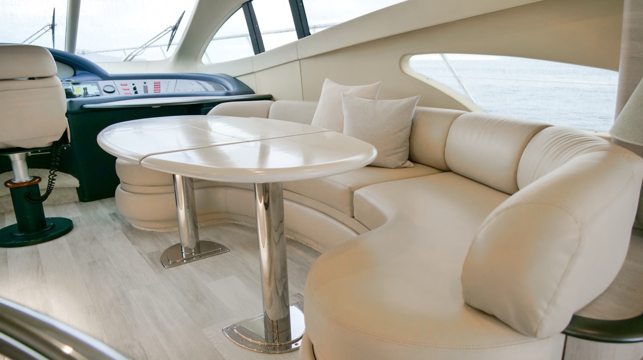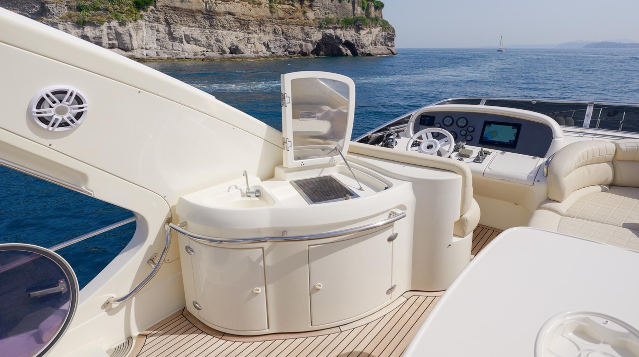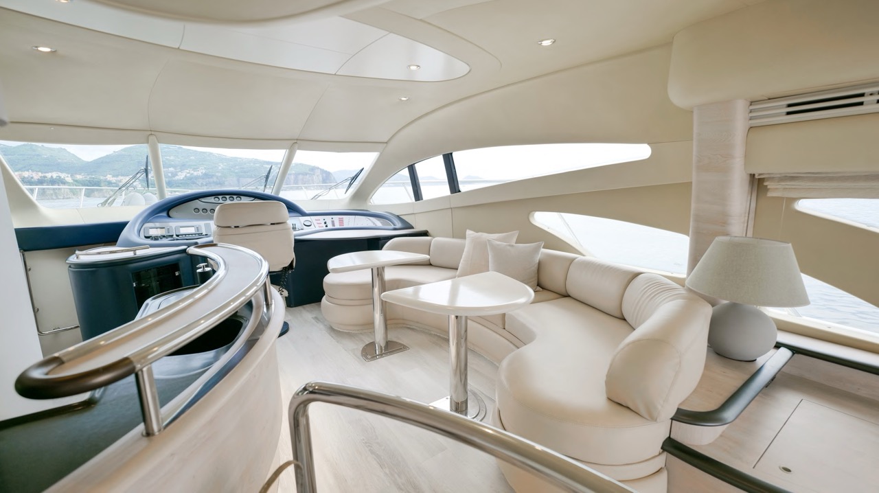 The recent refit has made the interiors of the Azimut 62 Fly exceptionally modern and fully optimized for onboard living. At the owner’s request, the furniture has been refinished in a lighter tone, complemented by new flooring and fresh paintwork that brighten the atmosphere throughout the cabins and main deck. Every detail has been carefully curated to create an inviting, serene, and contemporary environment. The layout of the main floor is designed to maximize natural light, enhancing the sense of openness. Upon entering, a spacious lounge area features a comfortable light-upholstered sofa paired with a stylish coffee table. Moving forward, the elevated dinette area houses the fully equipped galley complete with dishwasher, refrigerator, grill, ice maker, and additional appliances. A beautifully curved bar-style counter serves as both a practical workspace and a serving hatch. The dining area offers remarkable versatility, with a modular table that folds completely flat when not in use and can comfortably seat up to eight guests. Completing the living space is a plush C-shaped leather sofa that surrounds the dining table, perfect for relaxing or entertaining. The cockpit is designed for effortless outdoor living, featuring comfortable seating and a teak Calligaris dining table, ideal for enjoying meals at anchor. Shaded by the flybridge and finished with teak decking, it serves as a welcoming exterior lounge. Above, the flybridge offers generous space, equipped with a centrally mounted raised roll bar, expansive sunbathing area, and an additional living zone with a large sofa and central table. A wet bar with refrigerator and barbecue grill is positioned just aft of the helm station to port, ensuring convenience while entertaining. The yacht offers three beautifully appointed cabins plus a dedicated crew cabin. Master Cabin (Full Beam): Features a king-size bed, vanity/desk area, compact walk-in closet, and plentiful storage for extended stays. Six large windows provide sweeping sea views. The private ensuite includes a shower with bench seating and wooden flooring, electric toilet, and bidet. VIP Cabin (Forward): Equipped with a double bed, tall wardrobes, and a private bathroom with enclosed shower. Twin Cabin (Starboard): Offers two single berths and convenient access to the guest bathroom, also fitted with a separate shower stall. All cabins are finished with light Sky-colored bulkheads and ceilings, while the floors feature light carpeting. Bathrooms are accented with wooden flooring, and the main corridors boast a modern, light-toned synthetic surface.
