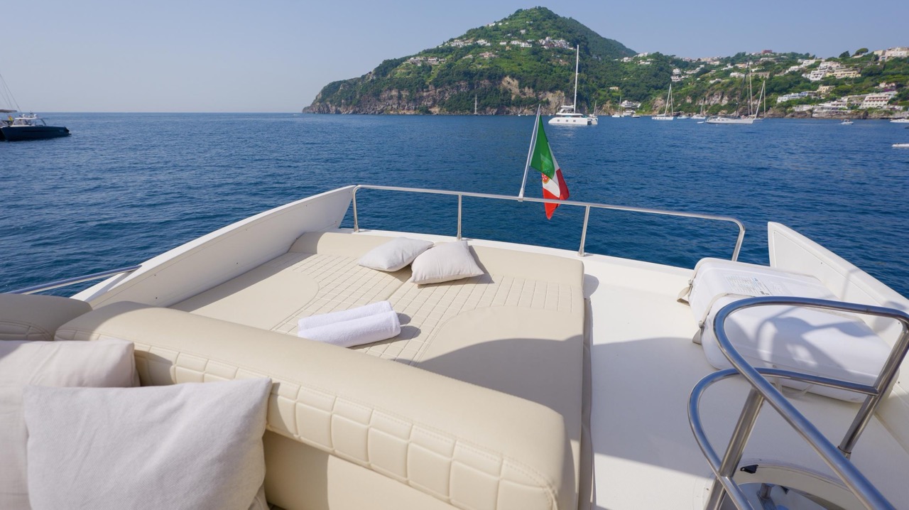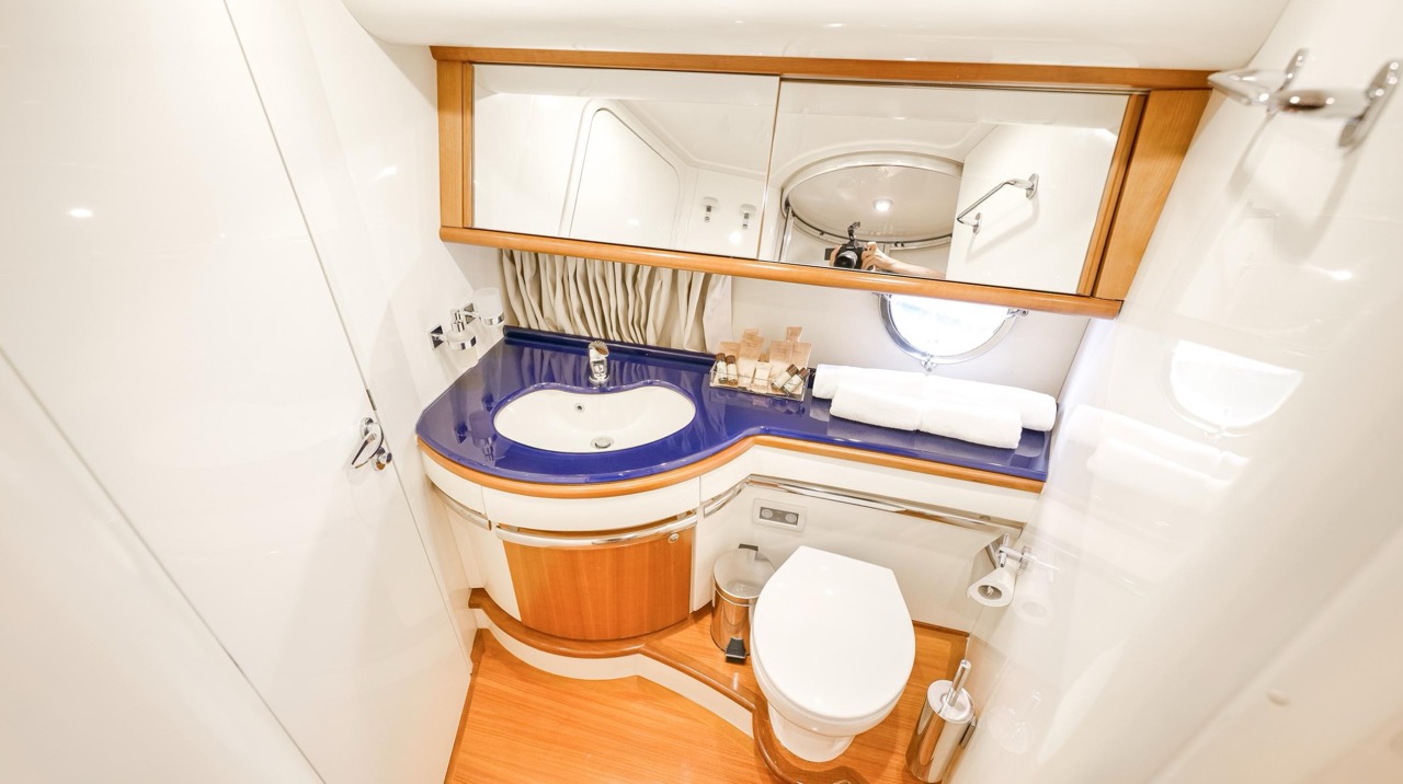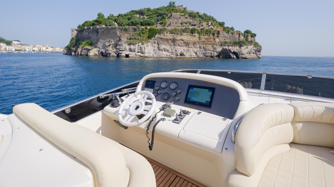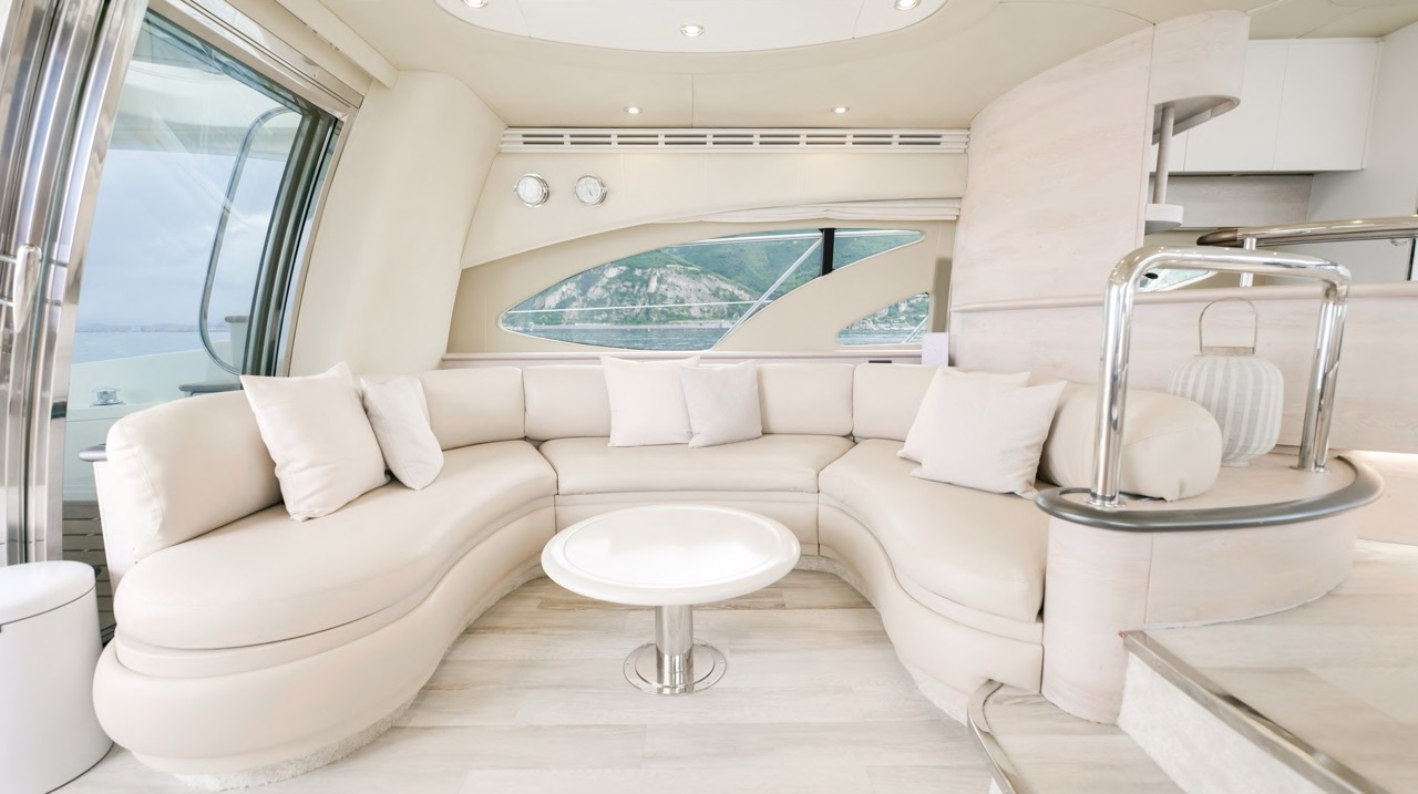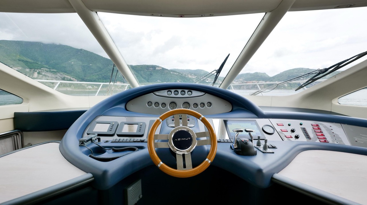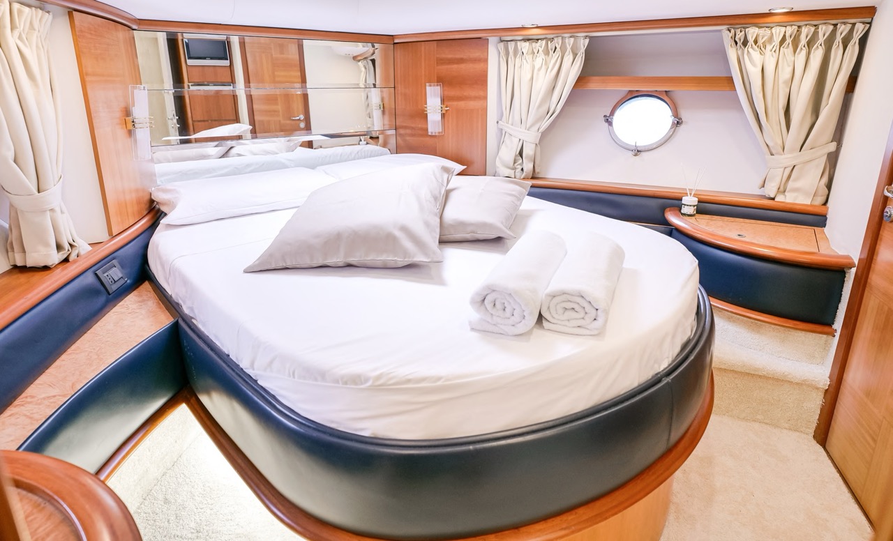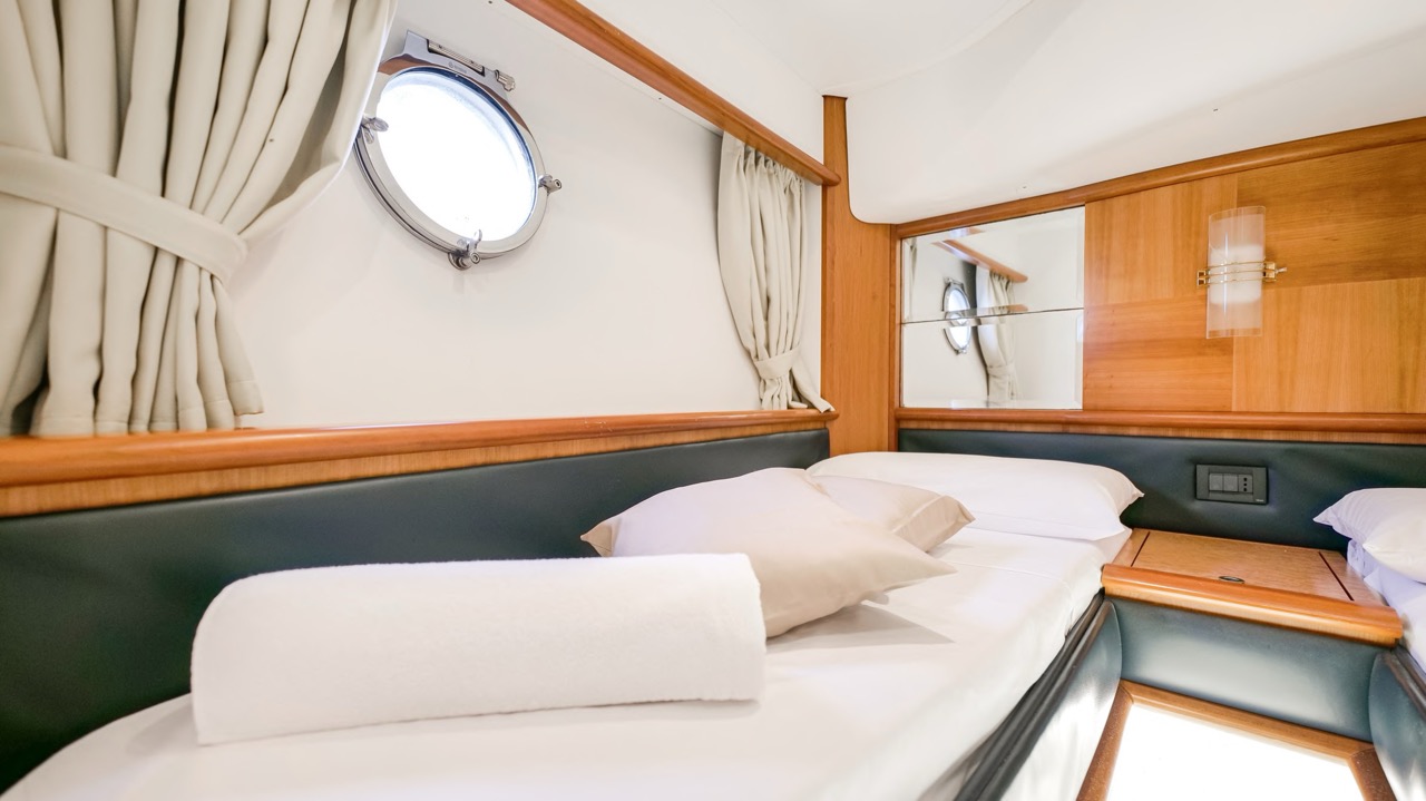 The recent refit has made the interiors of the Azimut 62 Fly exceptionally modern and fully optimized for onboard living. At the owner’s request, the furniture has been refinished in a lighter tone, complemented by new flooring and fresh paintwork that brighten the atmosphere throughout the cabins and main deck. Every detail has been carefully curated to create an inviting, serene, and contemporary environment. The layout of the main floor is designed to maximize natural light, enhancing the sense of openness. Upon entering, a spacious lounge area features a comfortable light-upholstered sofa paired with a stylish coffee table. Moving forward, the elevated dinette area houses the fully equipped galley complete with dishwasher, refrigerator, grill, ice maker, and additional appliances. A beautifully curved bar-style counter serves as both a practical workspace and a serving hatch. The dining area offers remarkable versatility, with a modular table that folds completely flat when not in use and can comfortably seat up to eight guests. Completing the living space is a plush C-shaped leather sofa that surrounds the dining table, perfect for relaxing or entertaining. The cockpit is designed for effortless outdoor living, featuring comfortable seating and a teak Calligaris dining table, ideal for enjoying meals at anchor. Shaded by the flybridge and finished with teak decking, it serves as a welcoming exterior lounge. Above, the flybridge offers generous space, equipped with a centrally mounted raised roll bar, expansive sunbathing area, and an additional living zone with a large sofa and central table. A wet bar with refrigerator and barbecue grill is positioned just aft of the helm station to port, ensuring convenience while entertaining. The yacht offers three beautifully appointed cabins plus a dedicated crew cabin. Master Cabin (Full Beam): Features a king-size bed, vanity/desk area, compact walk-in closet, and plentiful storage for extended stays. Six large windows provide sweeping sea views. The private ensuite includes a shower with bench seating and wooden flooring, electric toilet, and bidet. VIP Cabin (Forward): Equipped with a double bed, tall wardrobes, and a private bathroom with enclosed shower. Twin Cabin (Starboard): Offers two single berths and convenient access to the guest bathroom, also fitted with a separate shower stall. All cabins are finished with light Sky-colored bulkheads and ceilings, while the floors feature light carpeting. Bathrooms are accented with wooden flooring, and the main corridors boast a modern, light-toned synthetic surface.