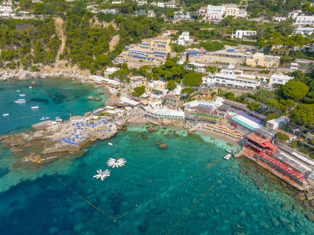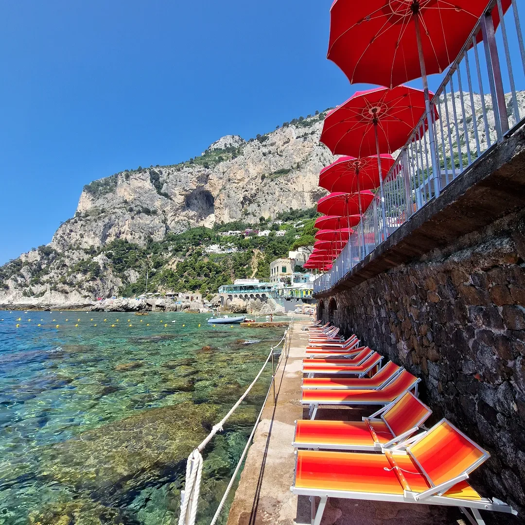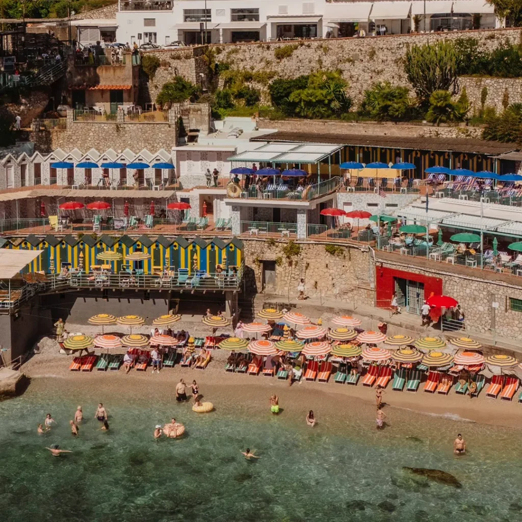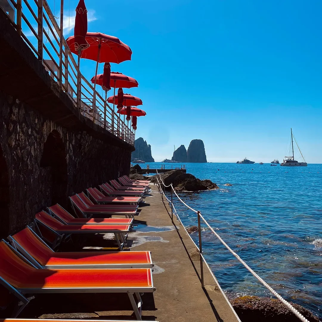 From the splendid Marina Piccola beach, one of Capri’s most evocative settings, Bagni Internazionali offers a complete experience amidst crystal-clear sea, traditional cuisine, and authentic Capri hospitality. With an area of approximately 3000 m2, Bagni Internazionali Capri are spread over several levels, overlooking the sea, offering a complete bathing experience designed for those who want to enjoy the sea in total relaxation and comfort. Each space is designed to ensure tranquility, privacy, and freedom of choice in an elegant and harmonious setting.