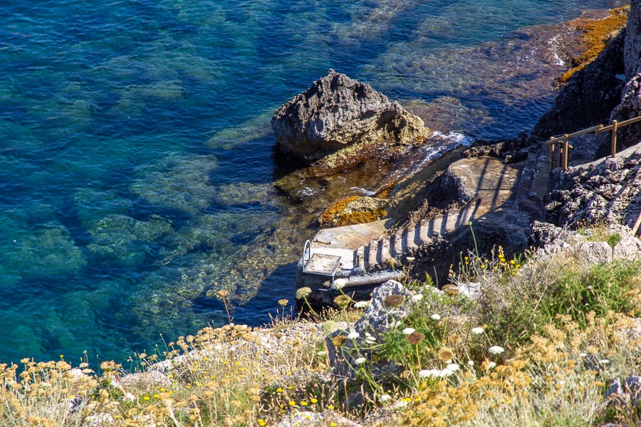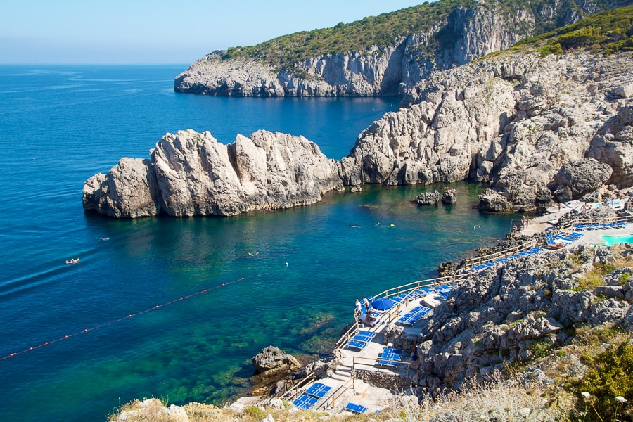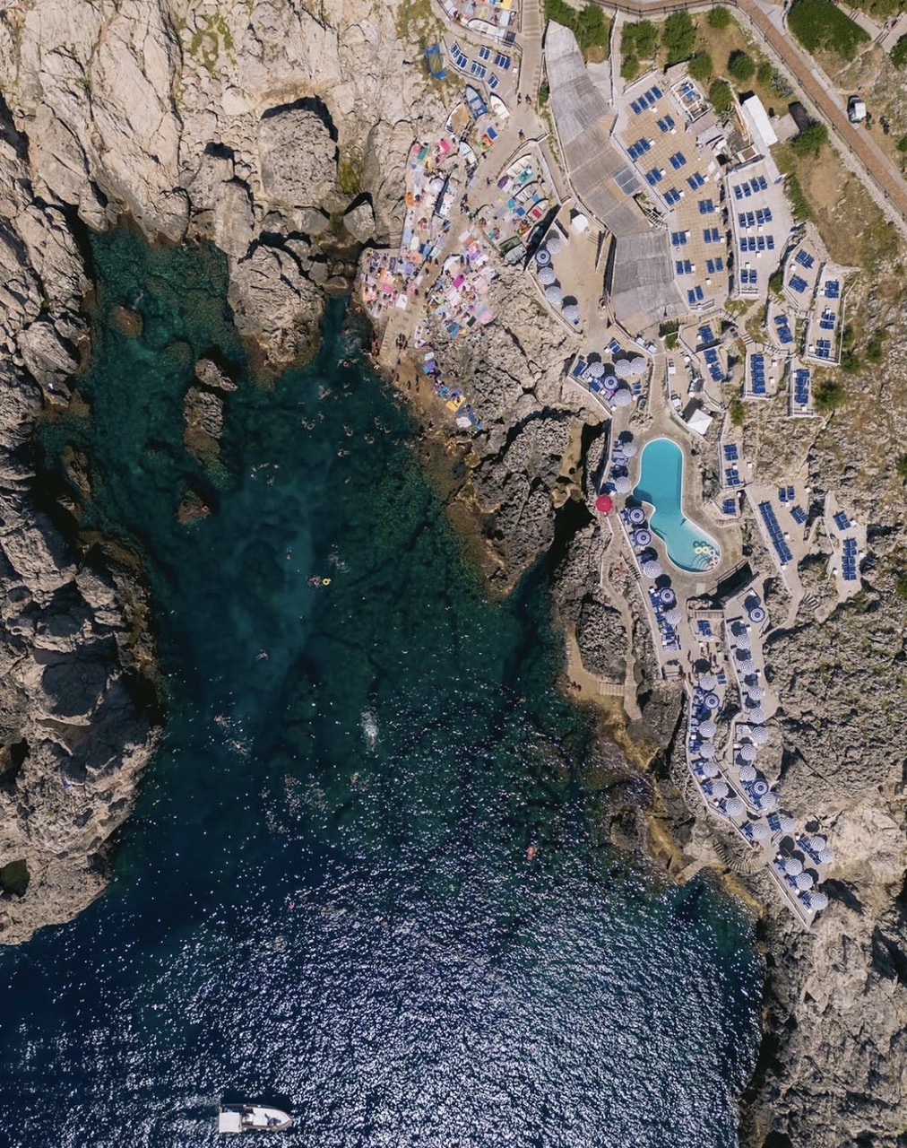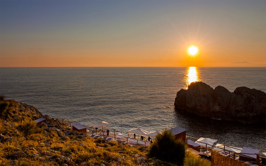 Founded by a local entrepreneur in 1970, today the beach club and restaurant are the most exclusive on the island of Capri. Set on the southwestern point of the coastline in the shadow of the Punta Carena lighthouse, it is tucked among the white cliffs jutting out into the sparkling Mediterranean and blends seamlessly into the magnificent coastal landscape. This slice of paradise has been the backdrop to generations of islanders and visitors summering on the island who have gathered here over the years to relax far from the crowds and savor the most beautiful sunsets on the island. Once here, it's easy to understand why this spot is considered to be the most beautiful on the island: sun-bleached cliffs lining a tiny cove and a postcard-perfect view of the Faraglioni from the antique fort and scenic overlook, surrounded by flowering broom from just above. Lido del Faro is one of the only beach clubs on Capri where you can swim under the Mediterranean sun all day and take a final dip as late as 9 pm, as the final rays turn the waters golden on the horizon. The stunningly beautiful coastline and crystalline waters have earned our beach club the Bandiera Blu recognition.