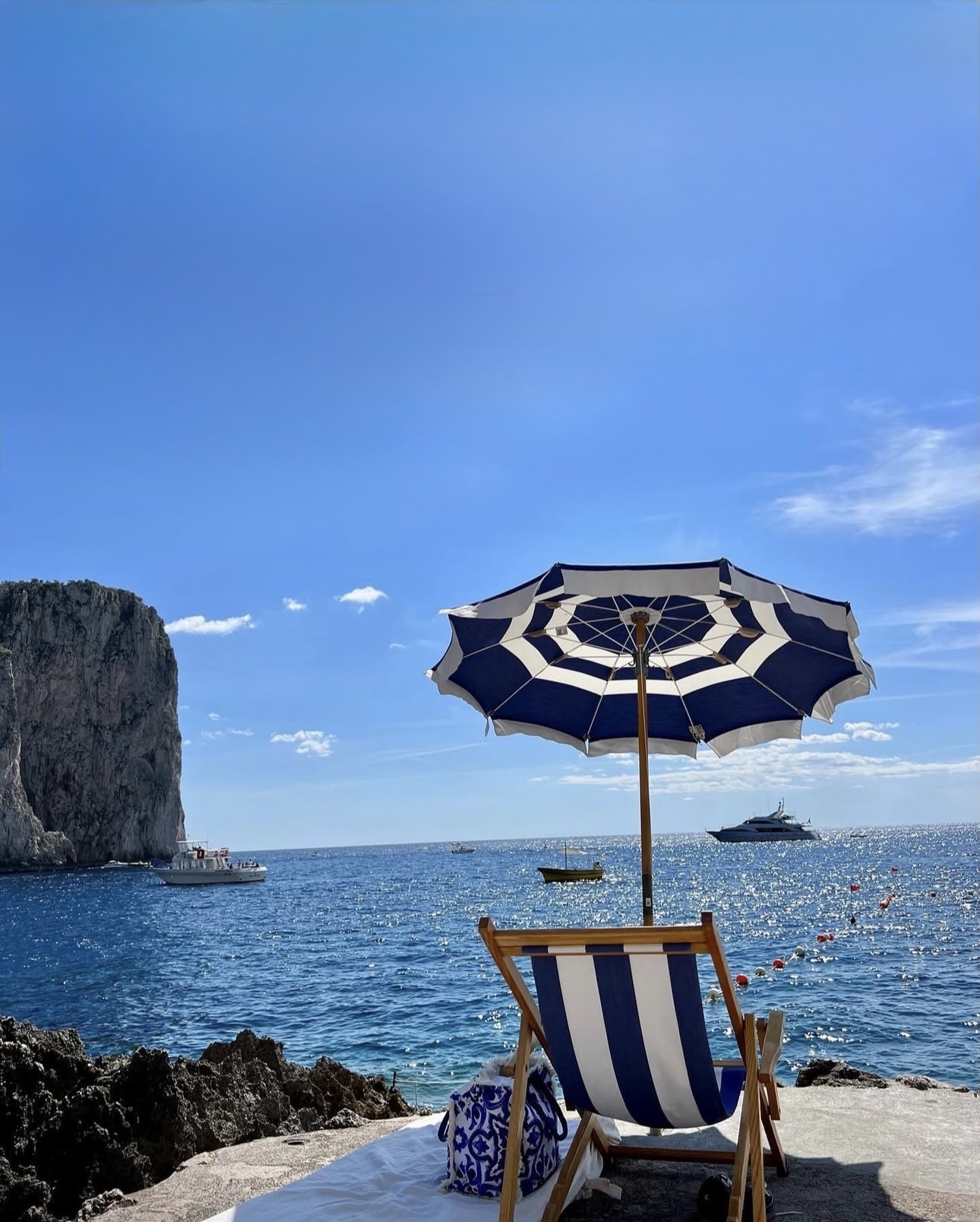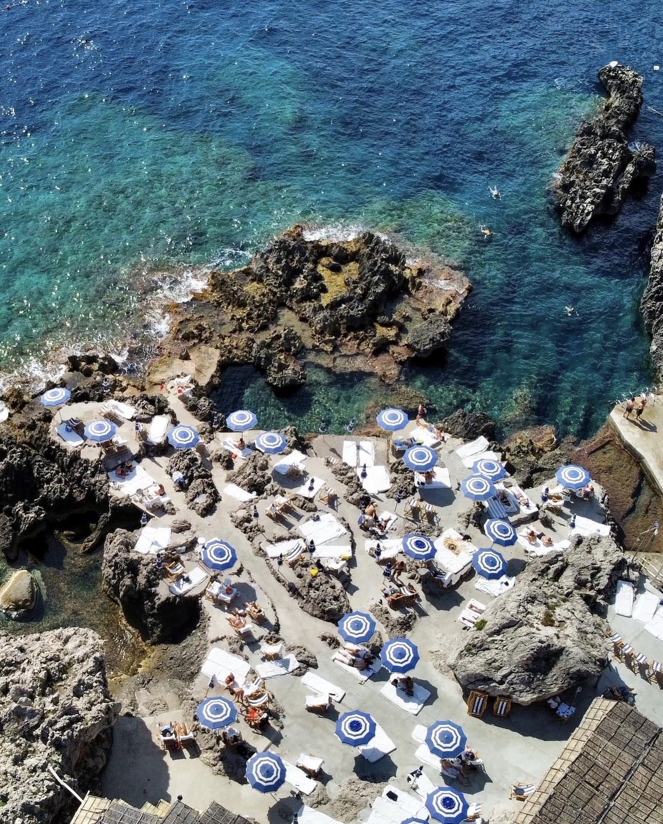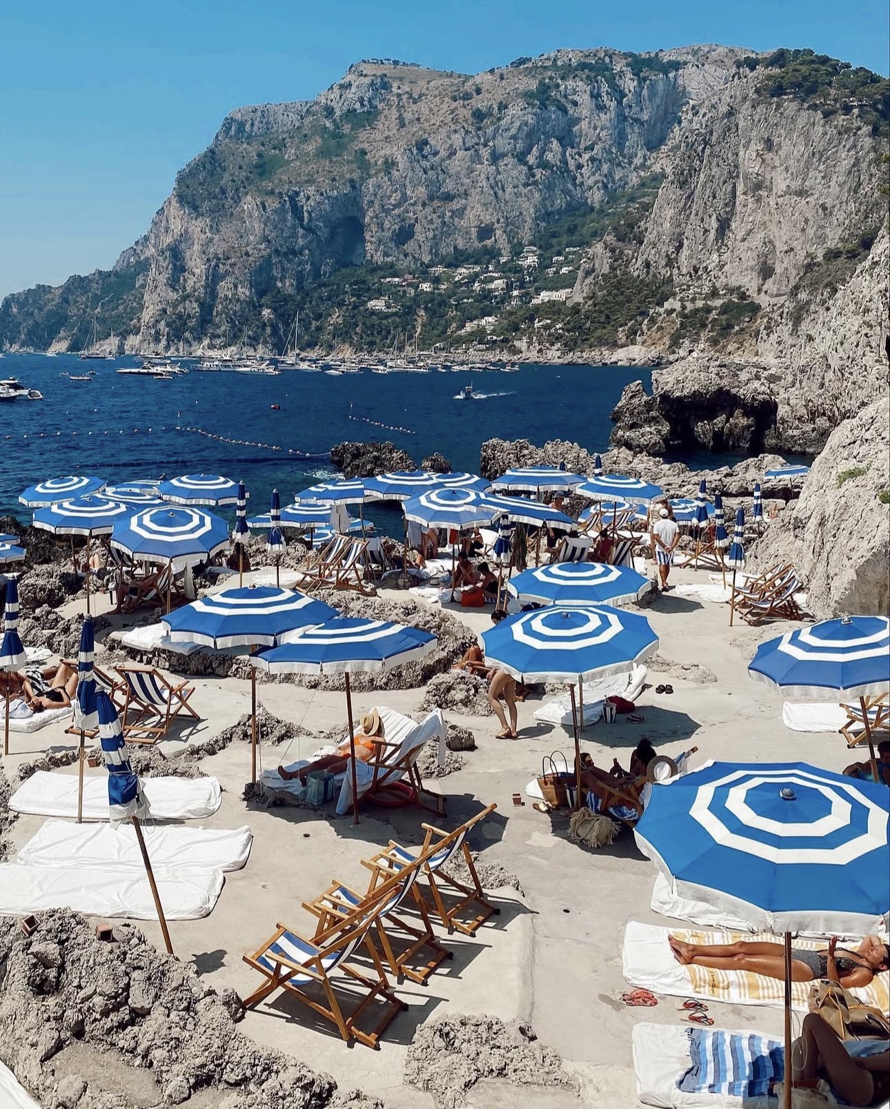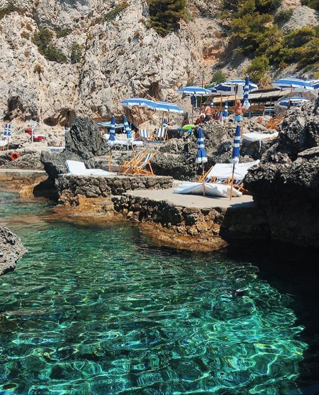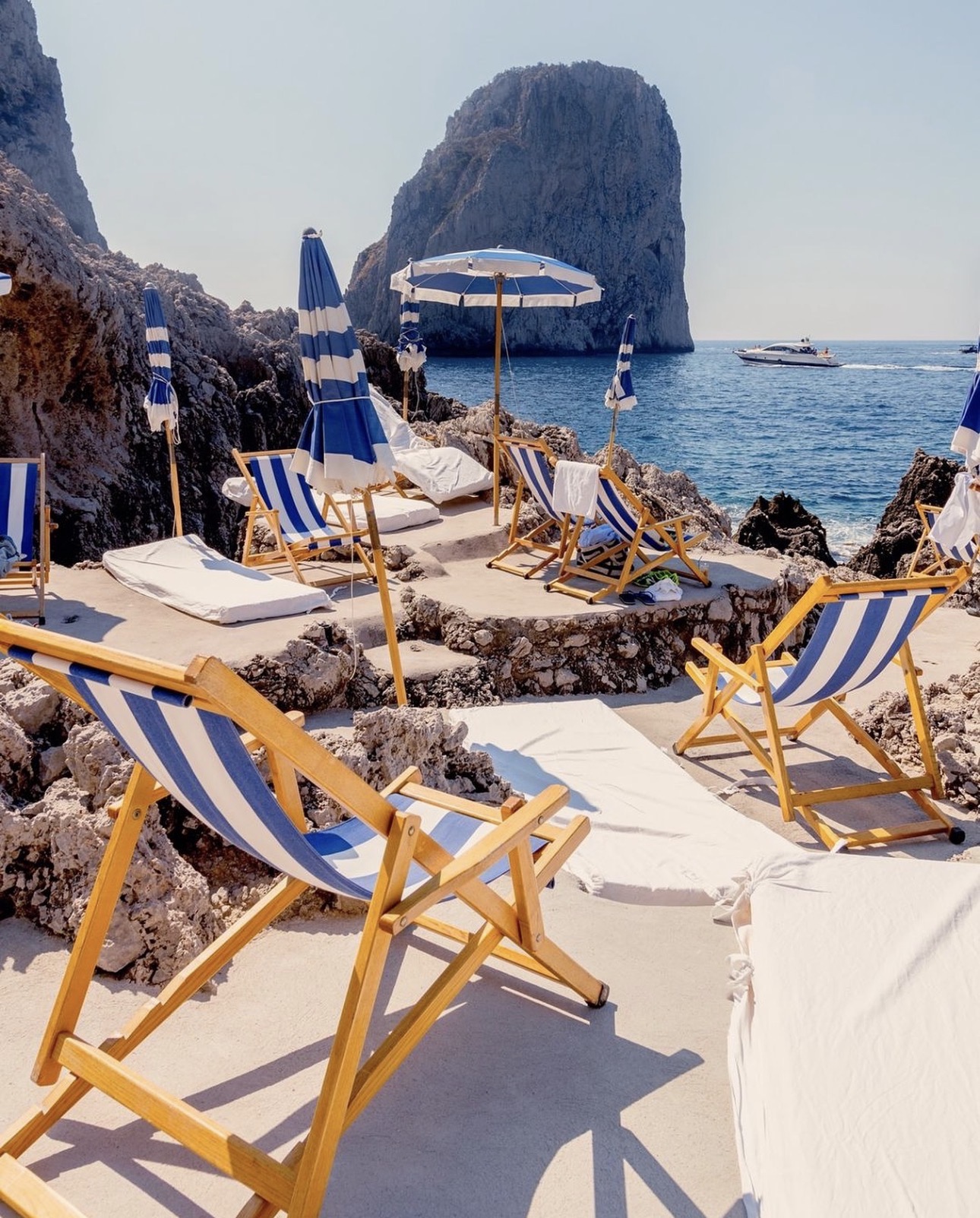 Crystal-clear waters, an iconic view of the Faraglioni, and a restaurant for a delicious lunch. La Fontelina is Capri at its most iconic. A legendary beach club nestled beneath the Faraglioni, where breathtaking views, crystalline waters, and timeless Italian glamour come together in one extraordinary setting. Established in 1949, it has long been one of the island’s most sought-after seaside destinations, loved for its unique atmosphere, unmistakable blue-and-white aesthetic, and privileged position on one of Capri’s most beautiful stretches of coastline. Guests come here not only to swim and sunbathe in front of the Faraglioni, but also to enjoy the unmistakable rhythm of a true Capri day: arriving by foot or by boat, relaxing by the sea, and lingering over a leisurely lunch of fresh fish and seasonal dishes. Exclusive yet authentic, lively yet elegant, La Fontelina remains a symbol of the island’s enduring charm and one of the most memorable beach club experiences in all of Italy.
